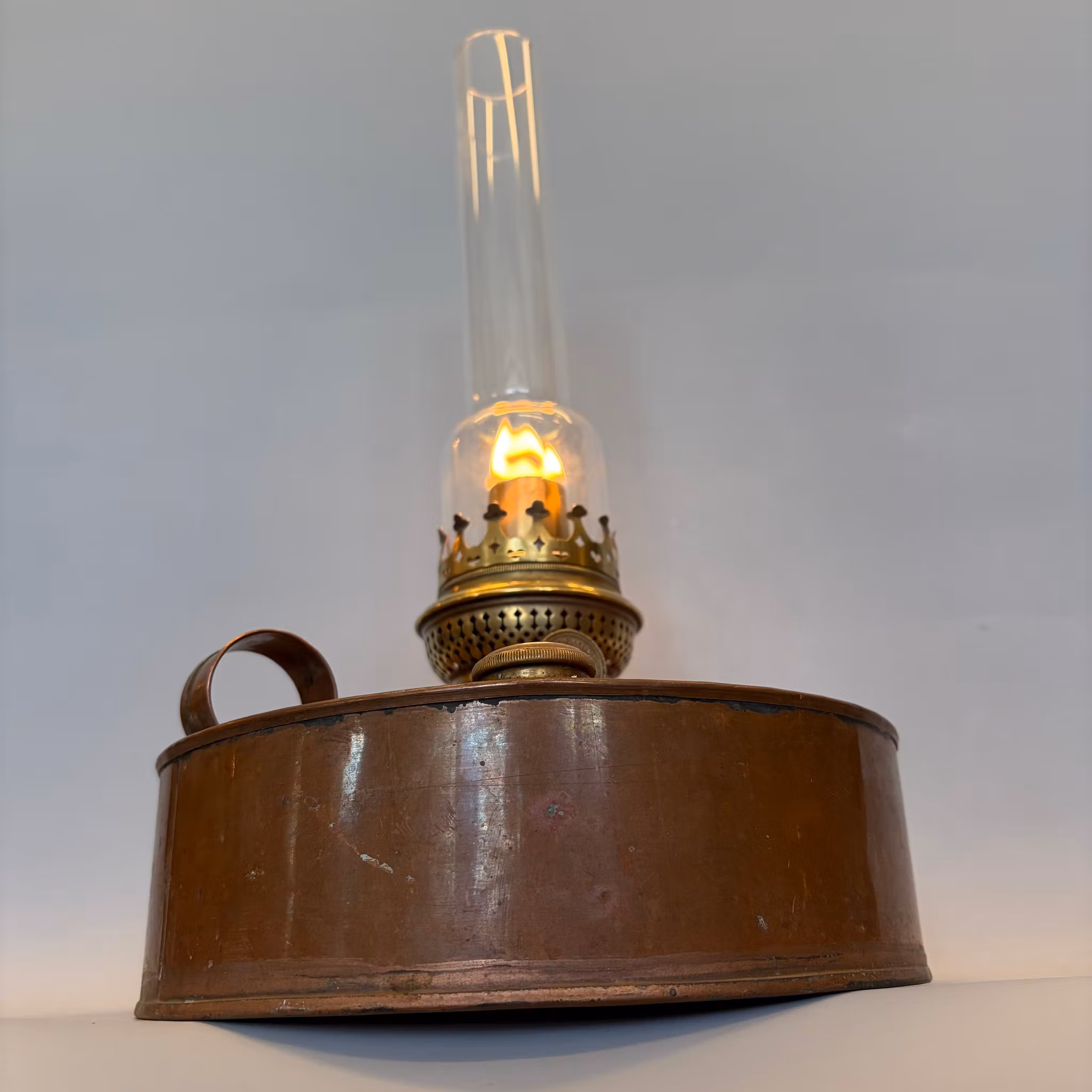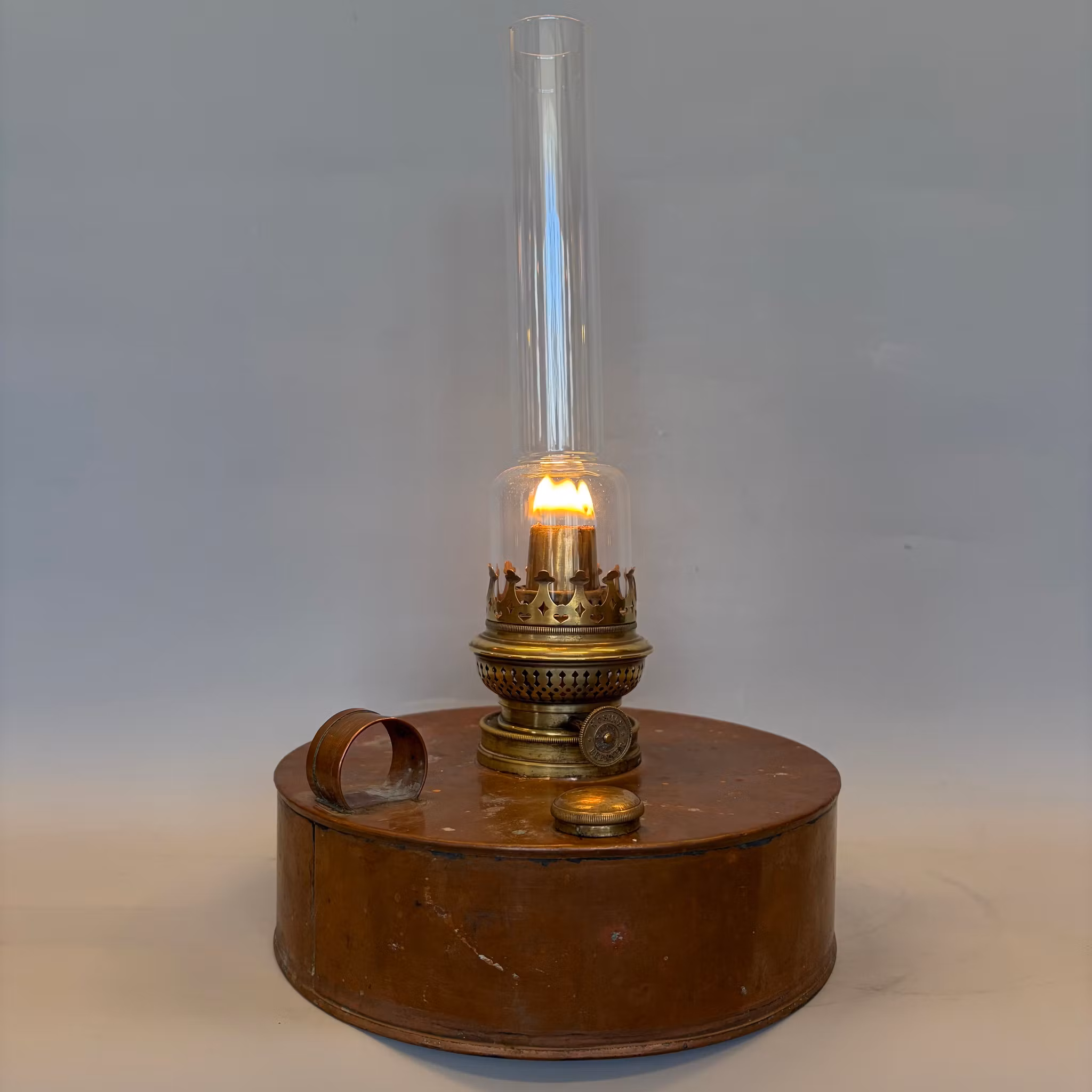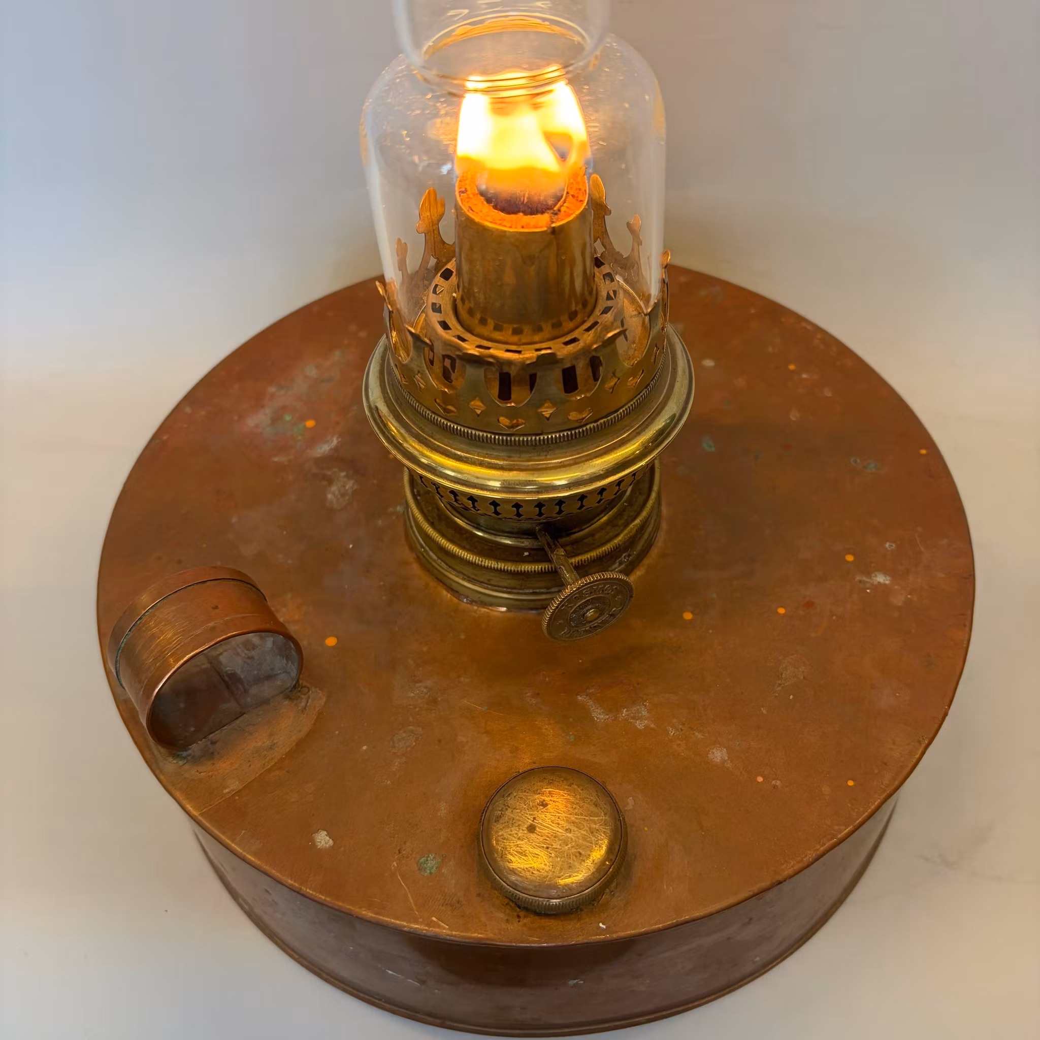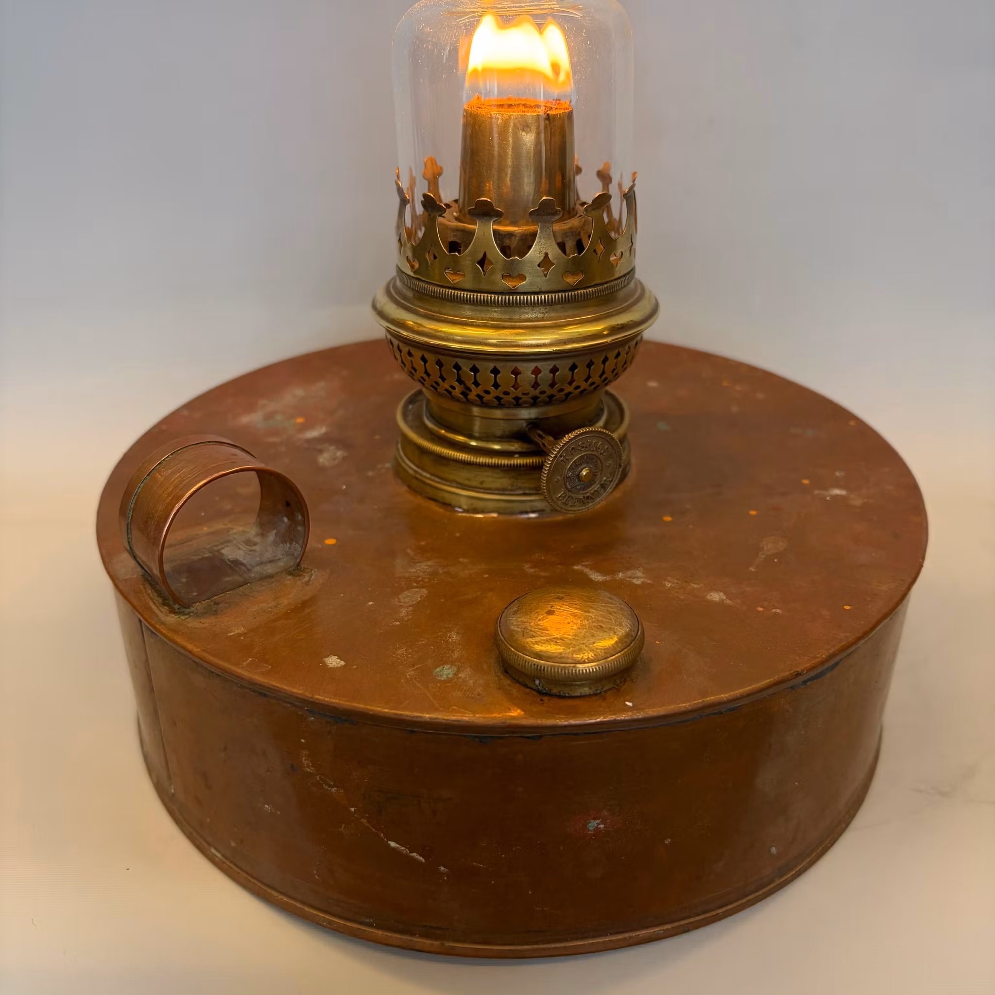 Det här är en äldre fotogenlampa med snygg patina och stort oljehus. Fotogenlampa med 14''' brännare i polerad mässing och ett gammalt oljehus i koppar med handtag och tanklock.