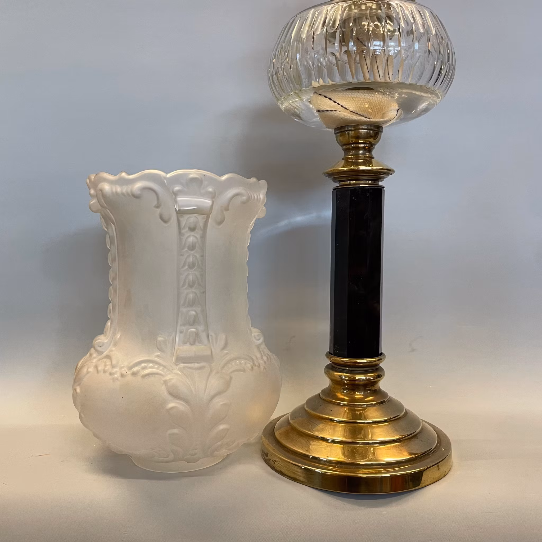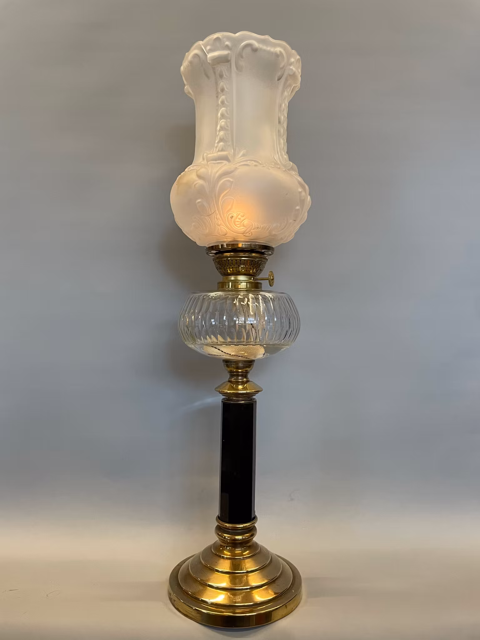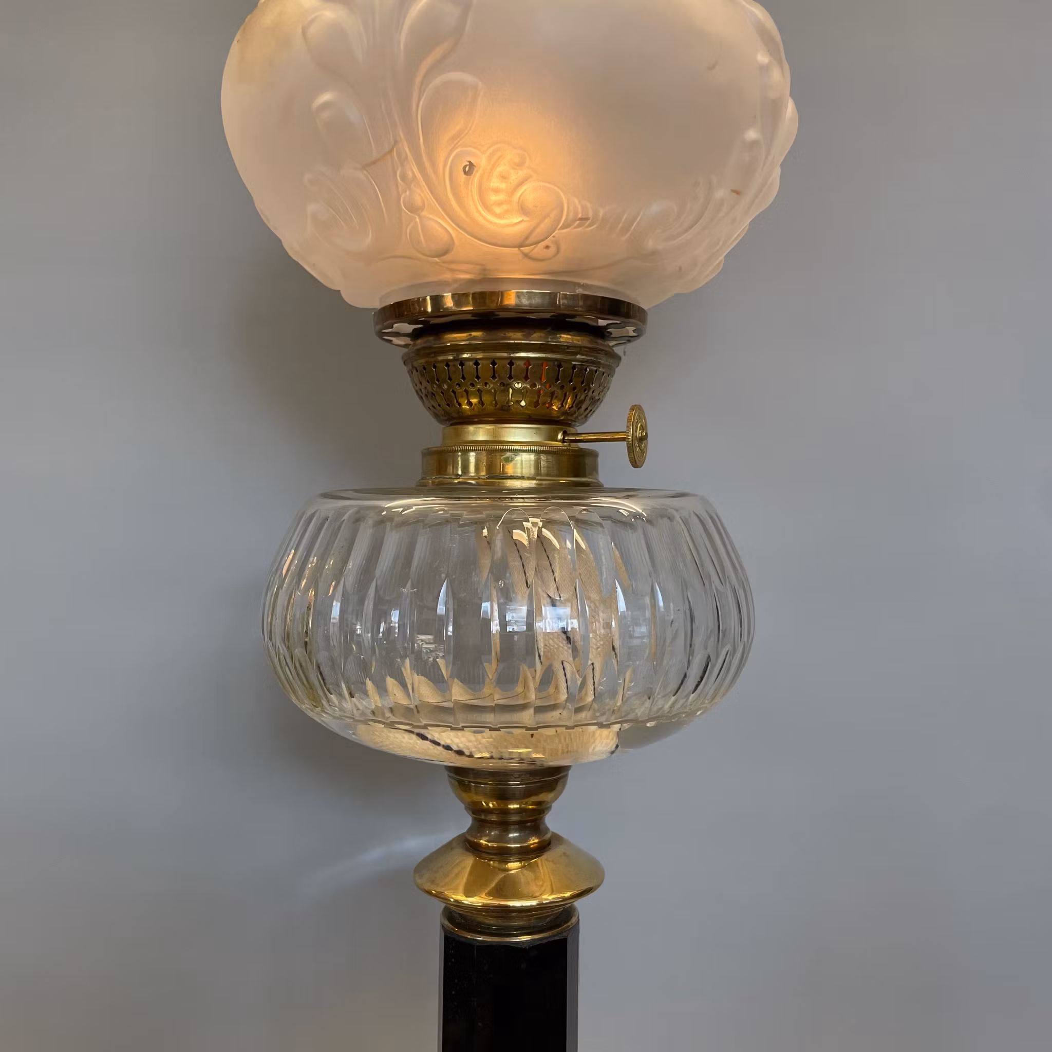 En antik fotogenlampa med slipat glasoljehus och hög blank svartl piedestalfot och snygg antik tulpankupa i jugendmodell.