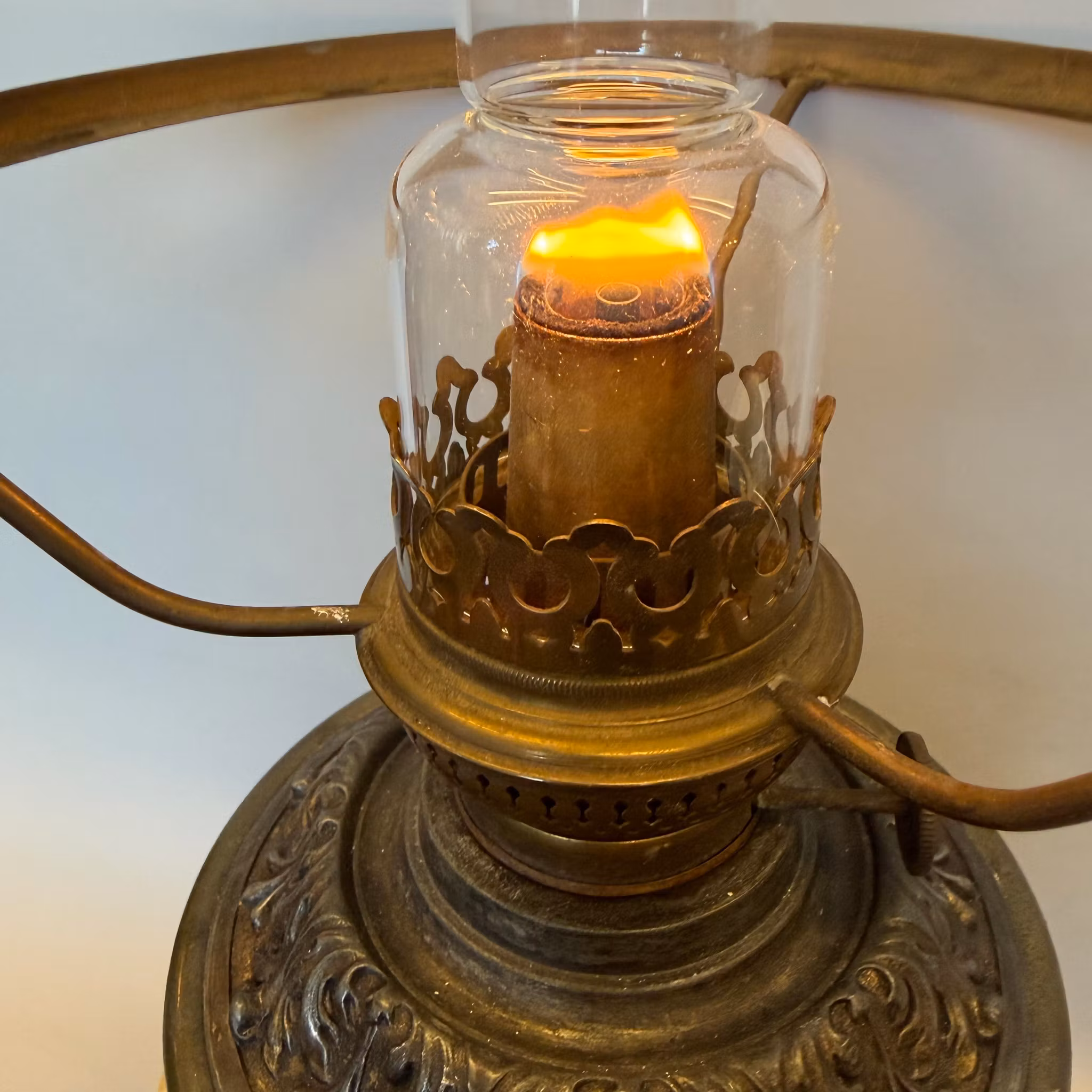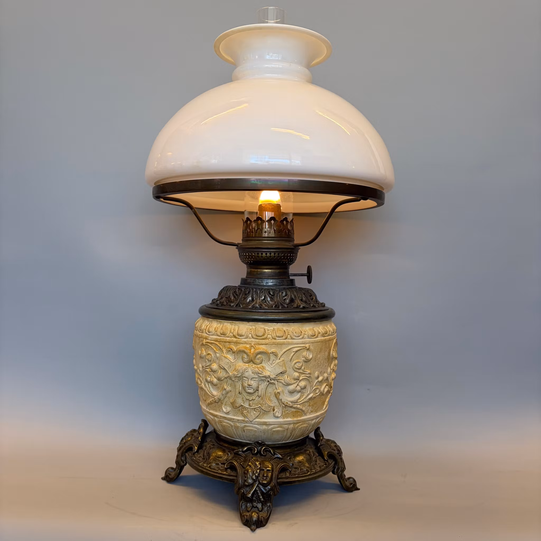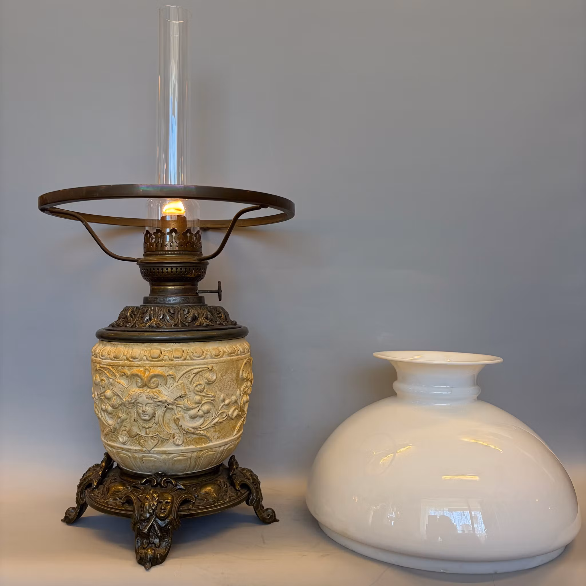 En helt unik antik fotogenlampa med ett oljehus med reliefmotiv och en riktigt snygg vestaskärm (235 mm fattning) med vikt kragkant överst.