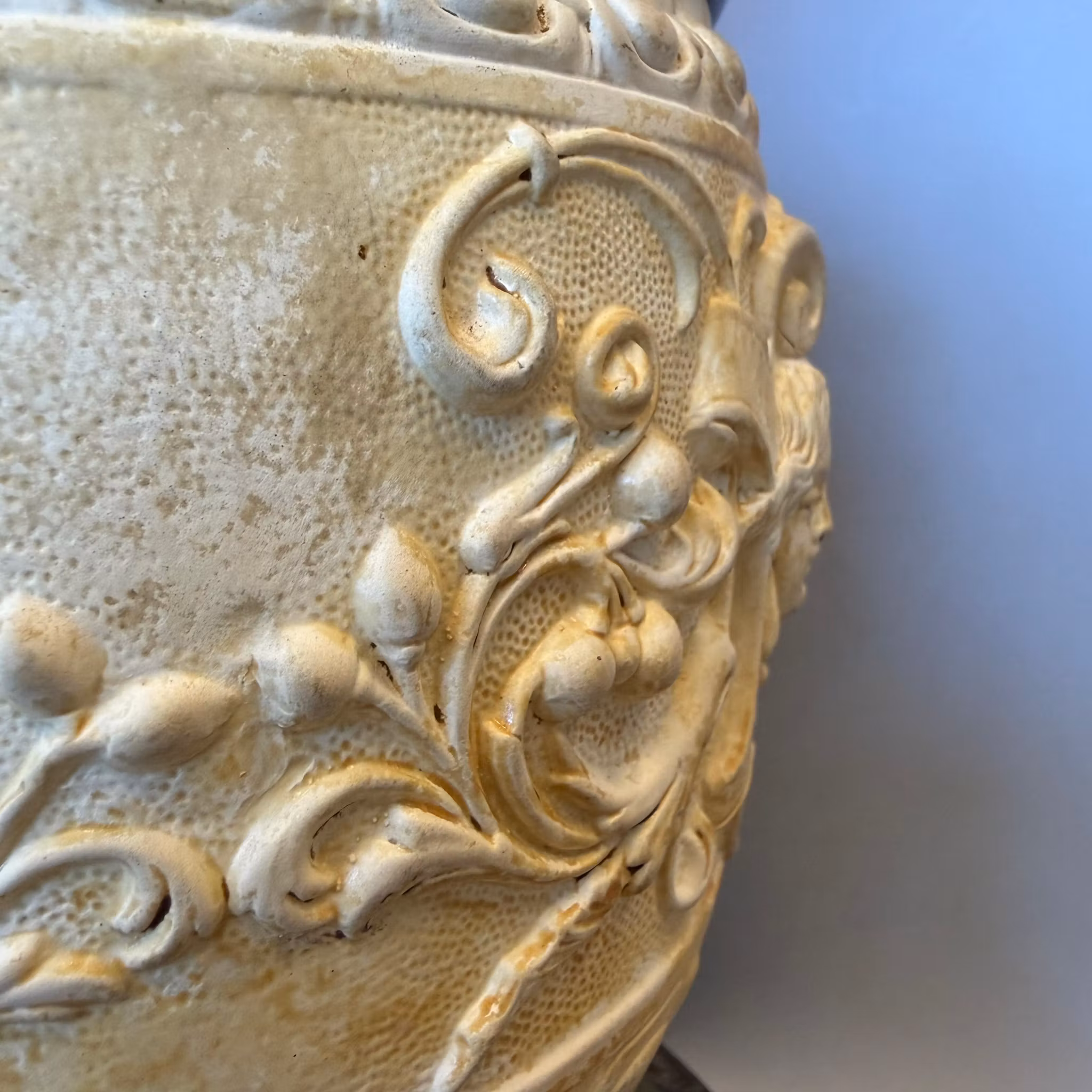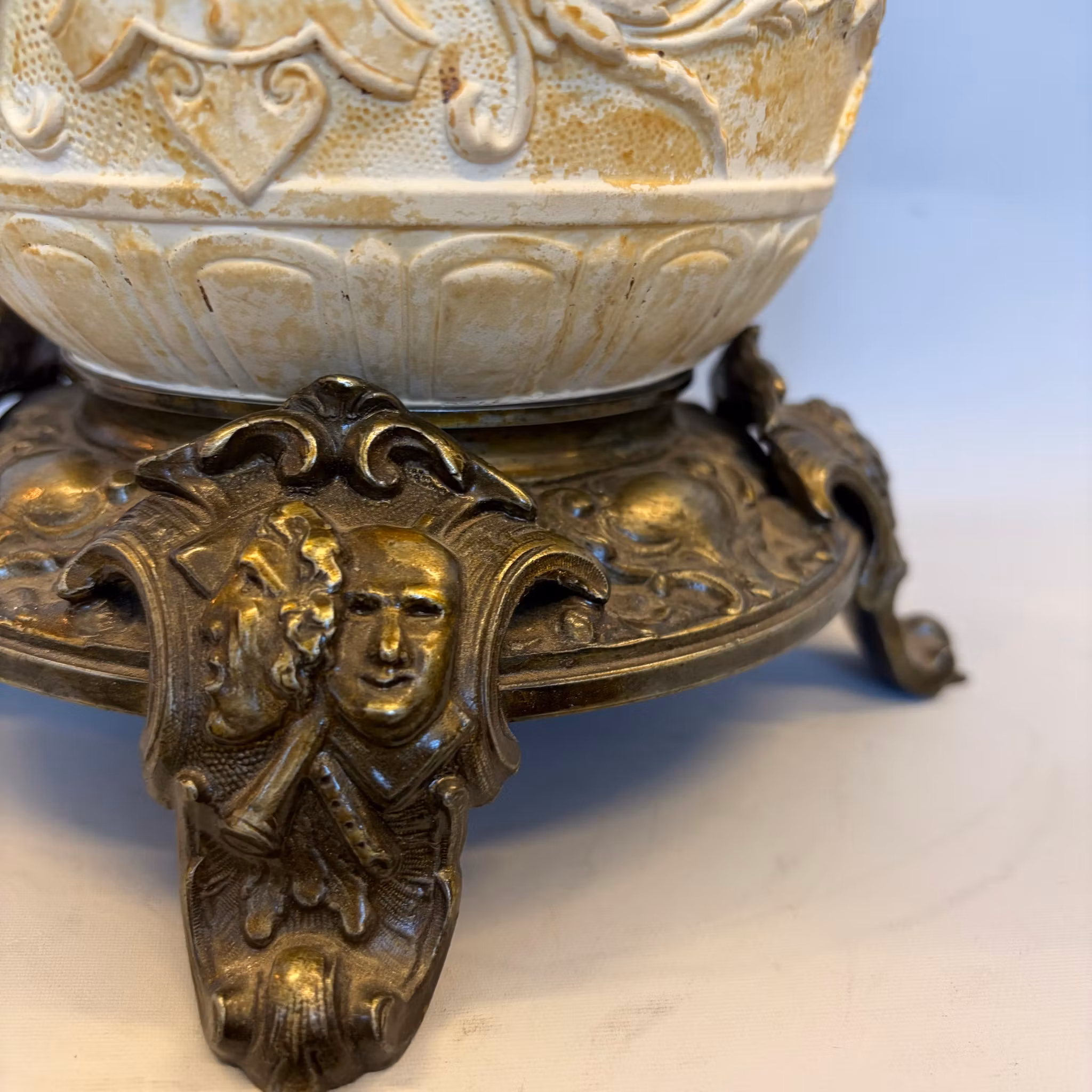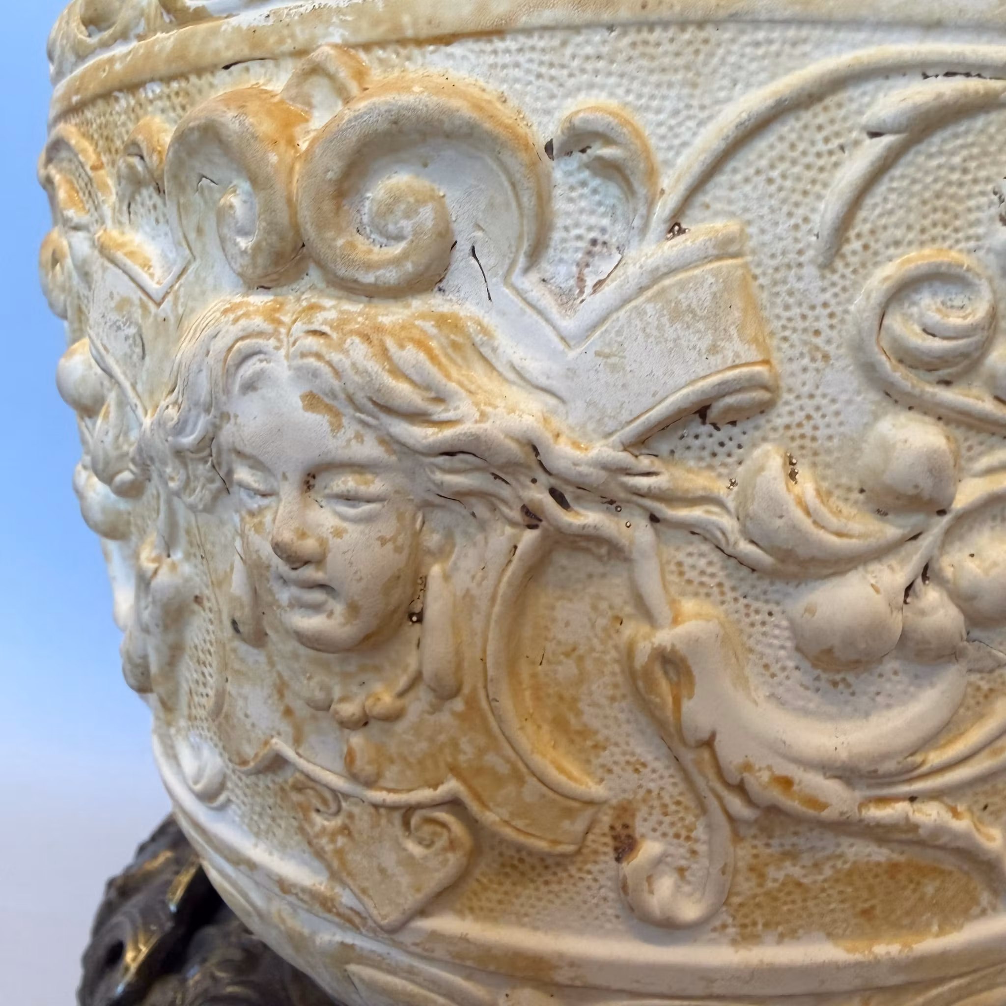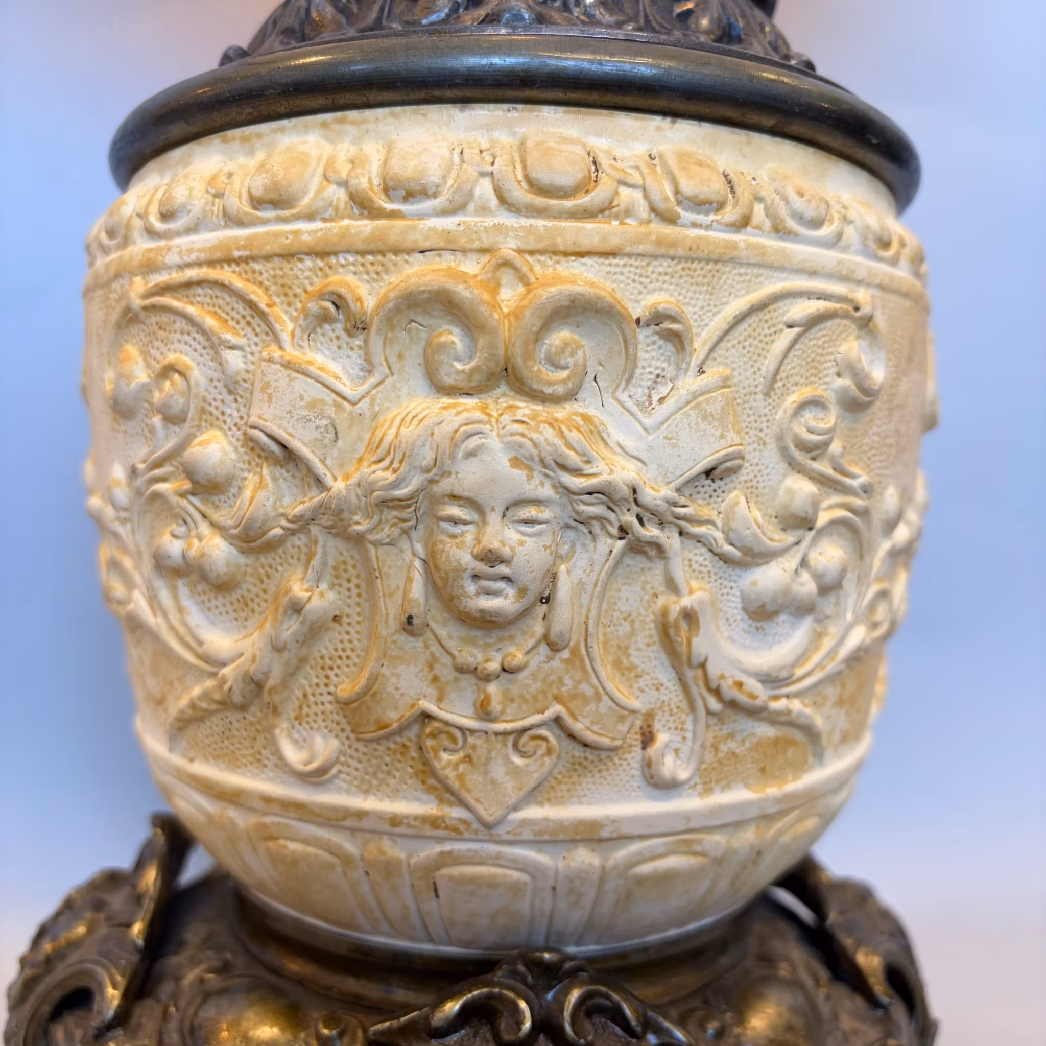 En helt unik antik fotogenlampa med ett oljehus med reliefmotiv och en riktigt snygg vestaskärm (235 mm fattning) med vikt kragkant överst.