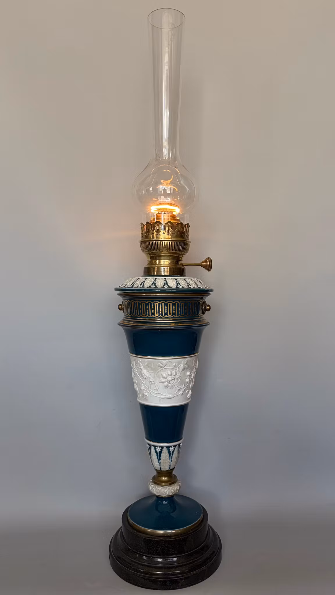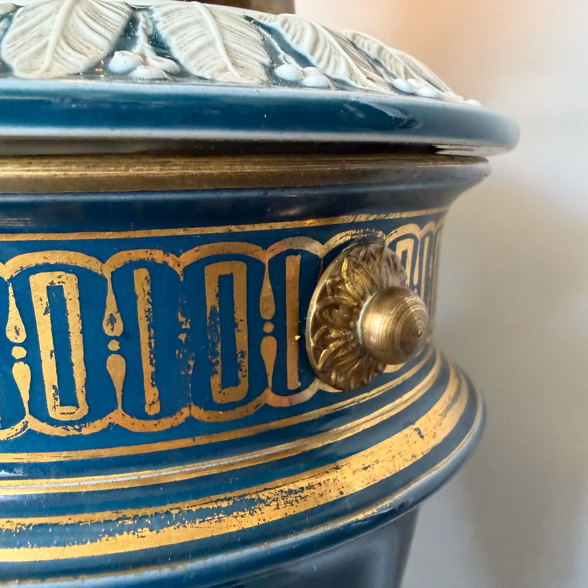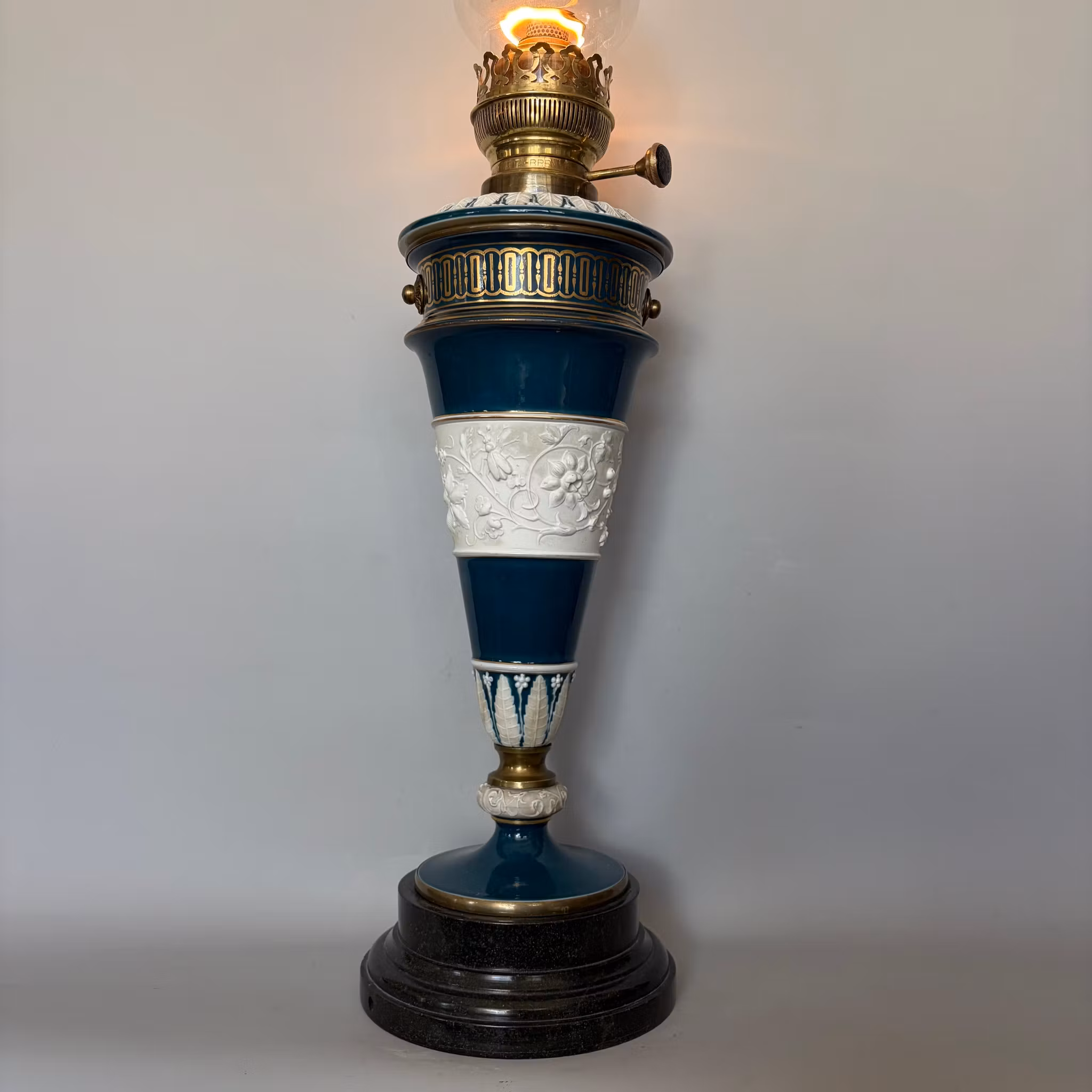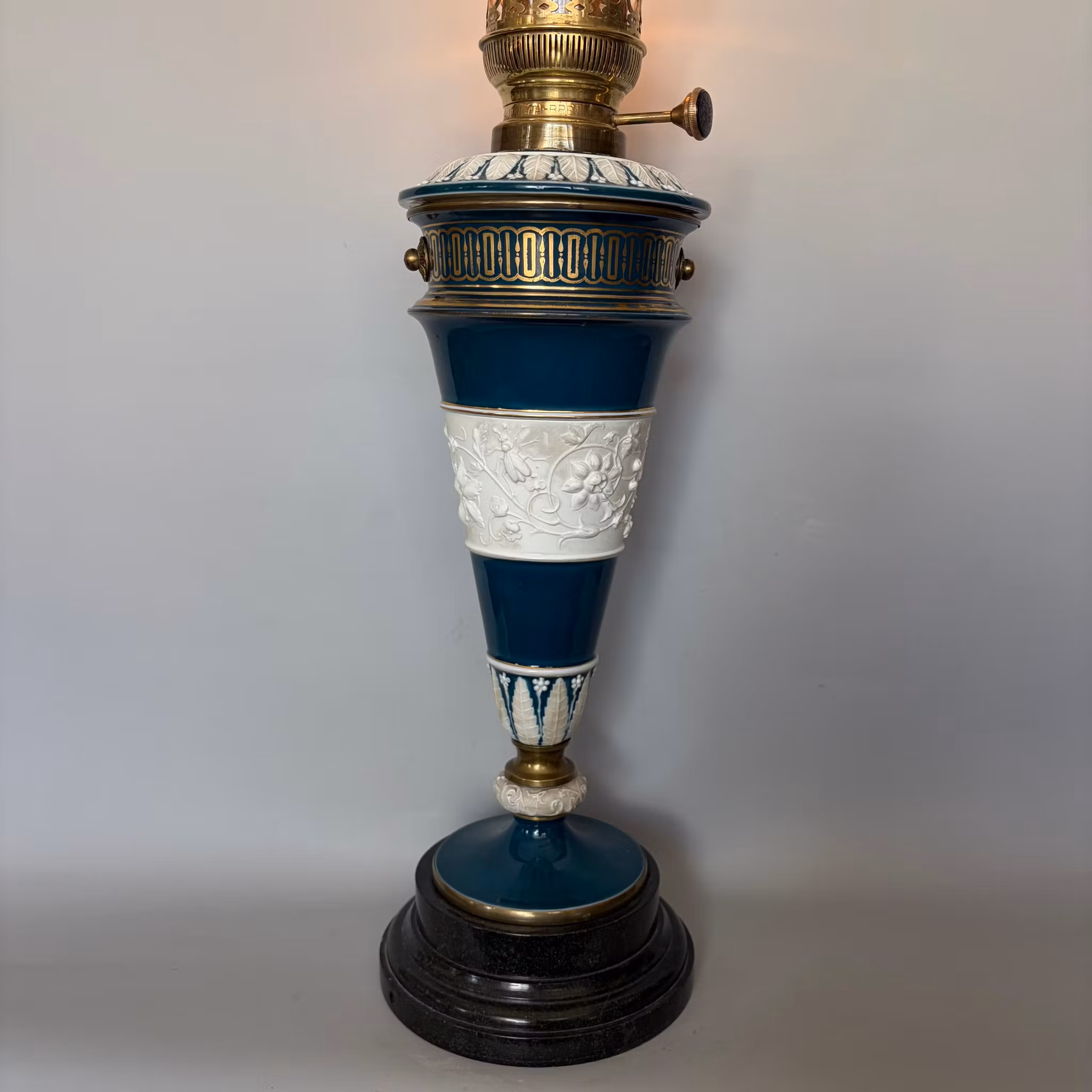 Fotogenlampa antik i turkost porslin med vita reliefmönster och gulddetaljer. Stor tung svart stenfot.