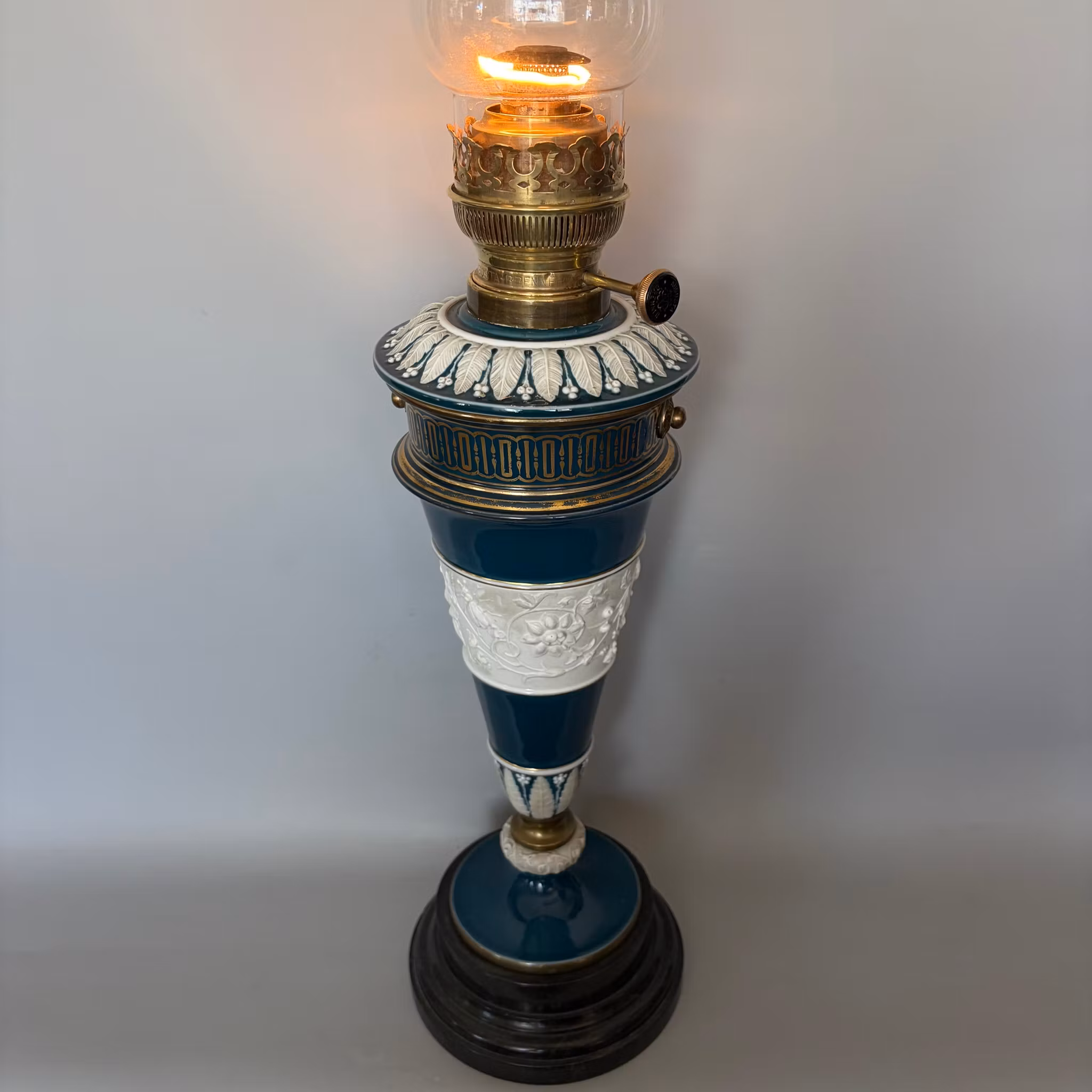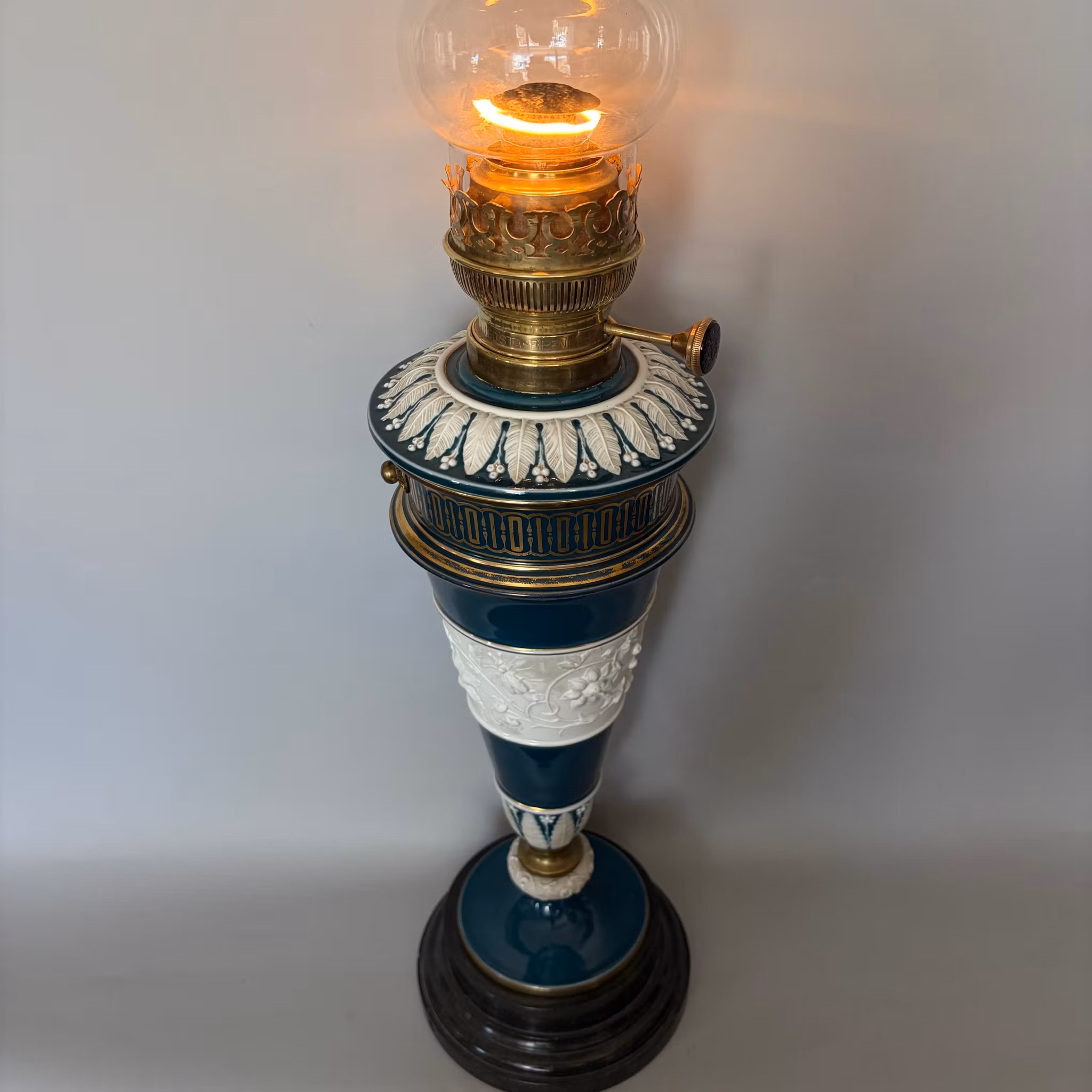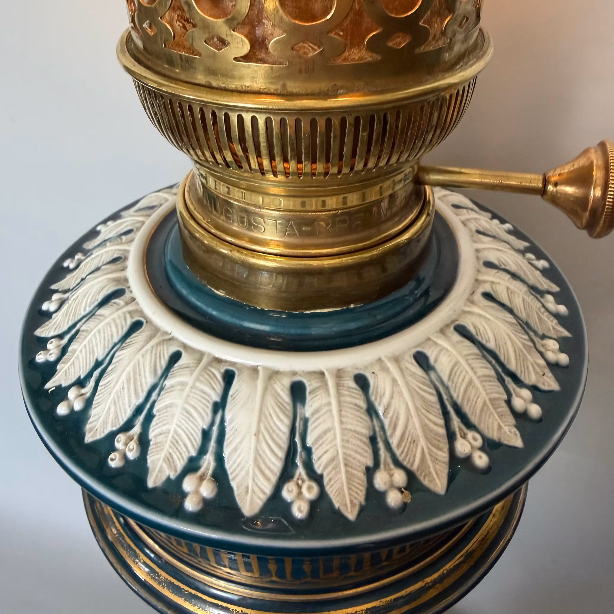 Fotogenlampa antik i turkost porslin med vita reliefmönster och gulddetaljer. Stor tung svart stenfot.