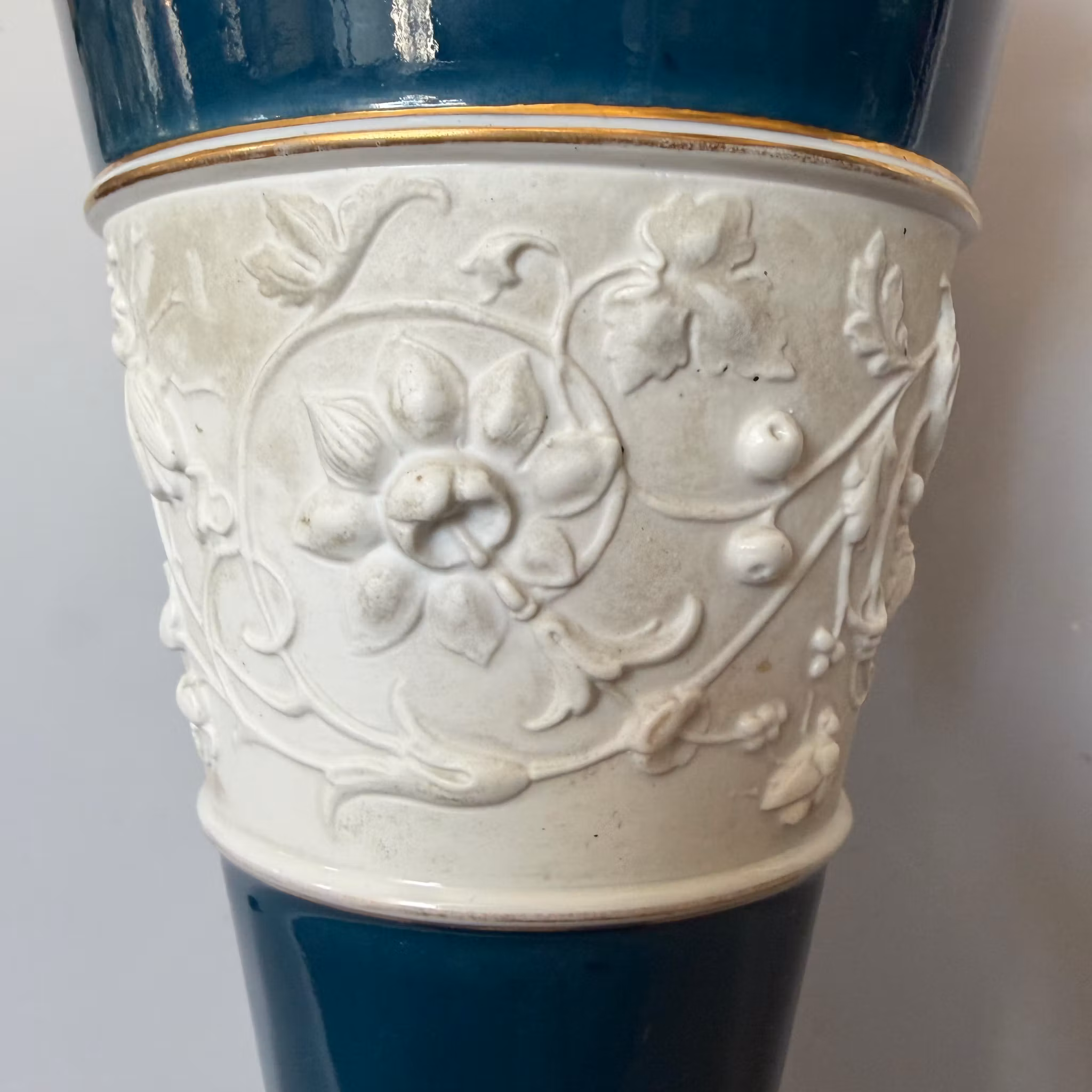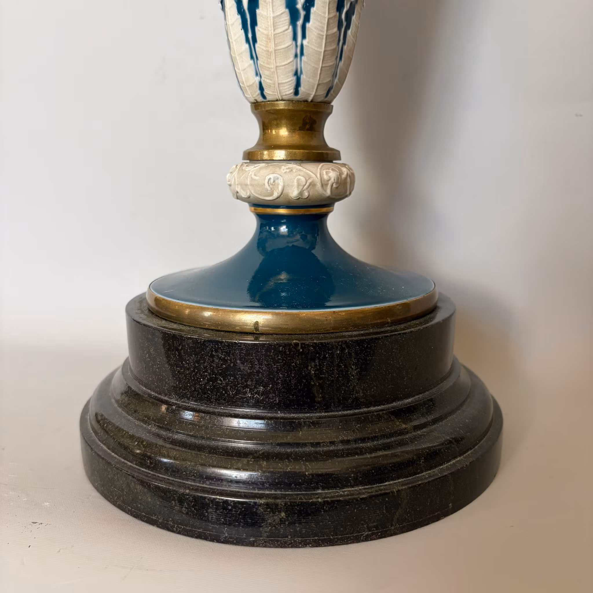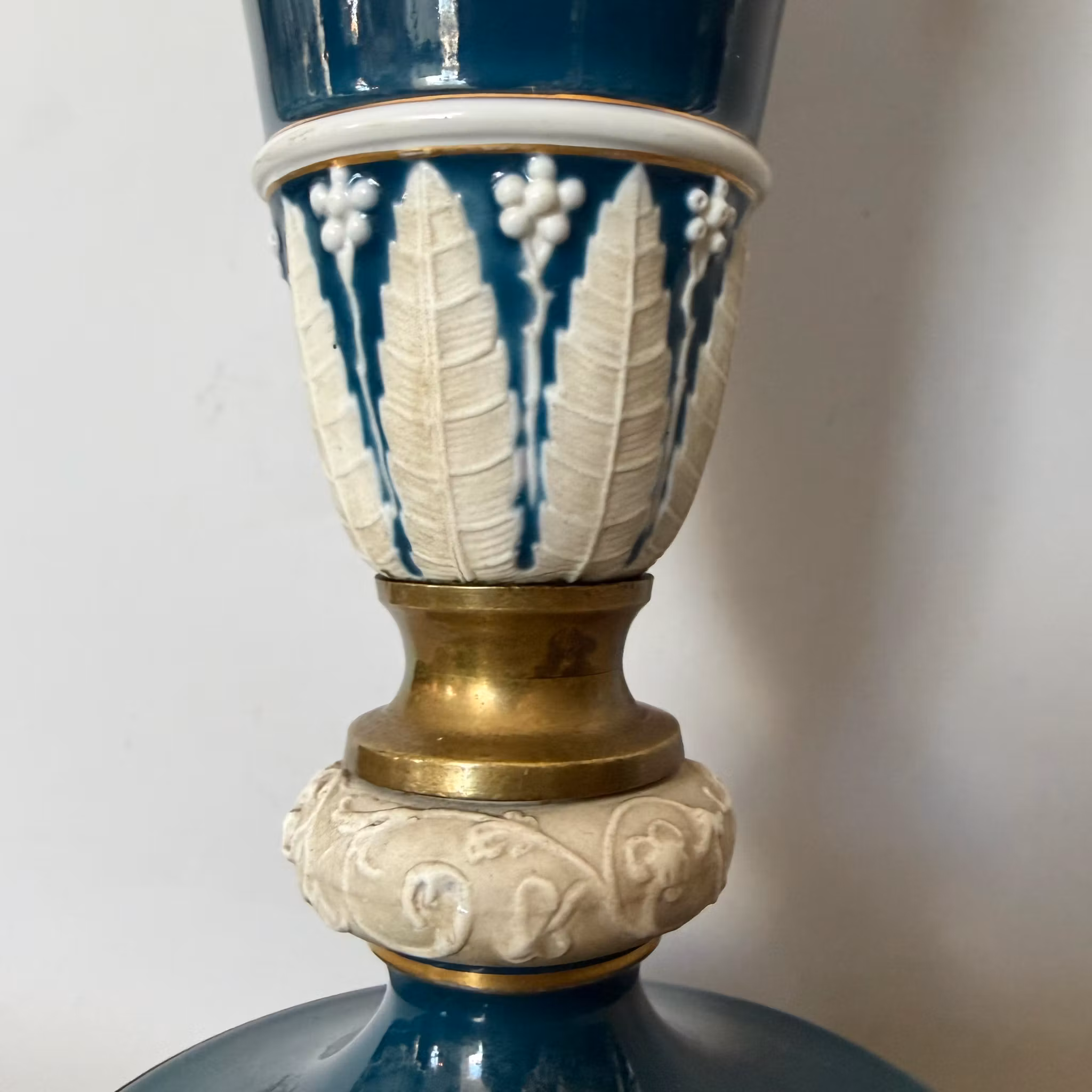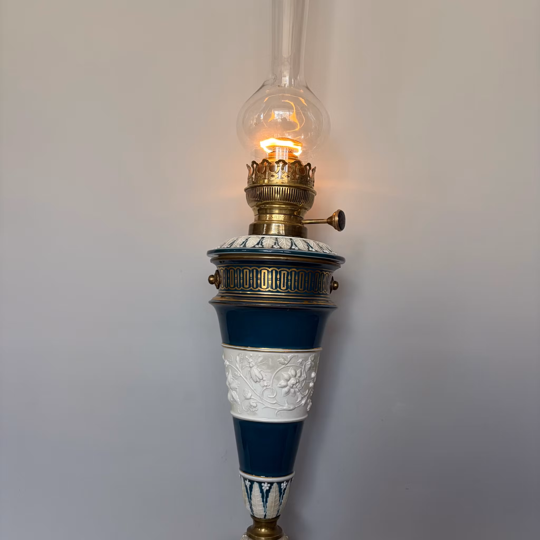 Fotogenlampa antik i turkost porslin med vita reliefmönster och gulddetaljer. Stor tung svart stenfot.