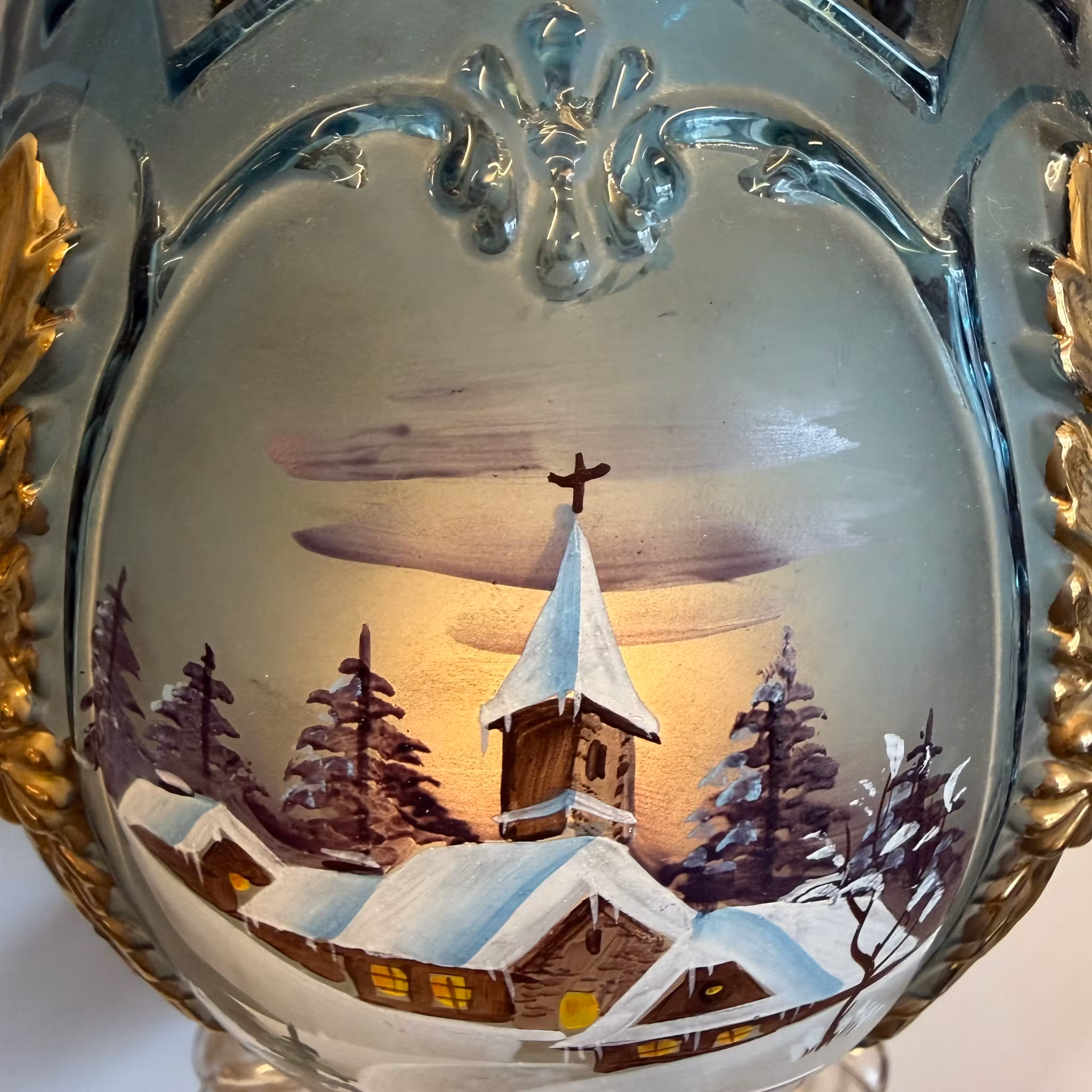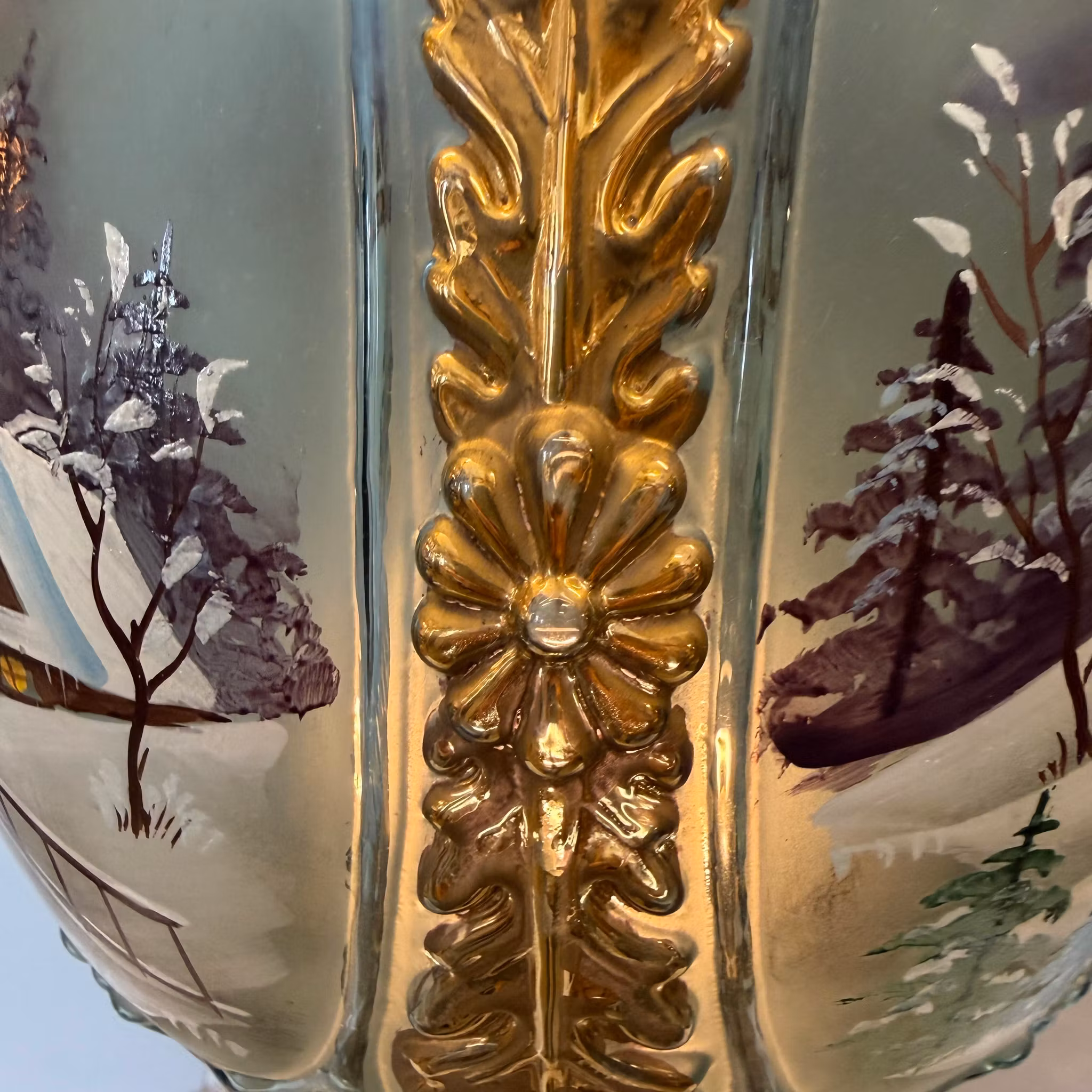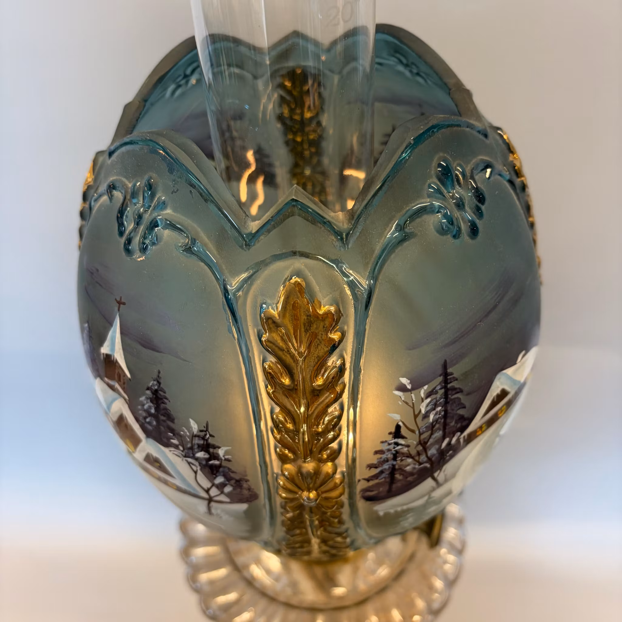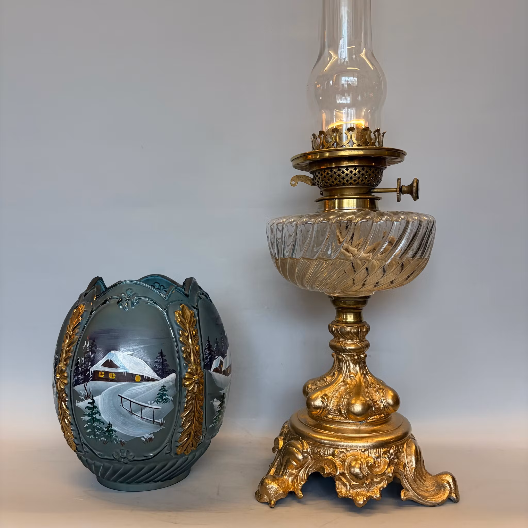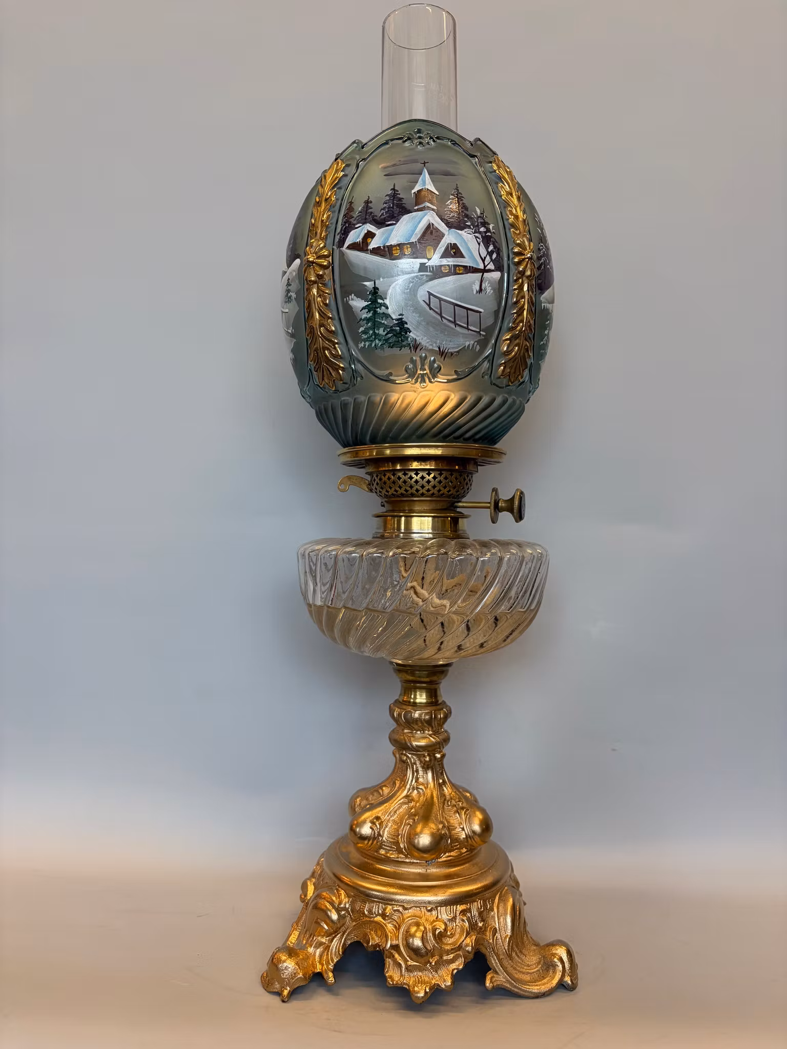 En antik fotogenlampa med glasoljehus och guldmålad fot och fantastiskt vacker handmålad antik tulpankupa med vintermotiv. När lampan brinner så är det som att solen tittar fram bakom snötyngda granar.