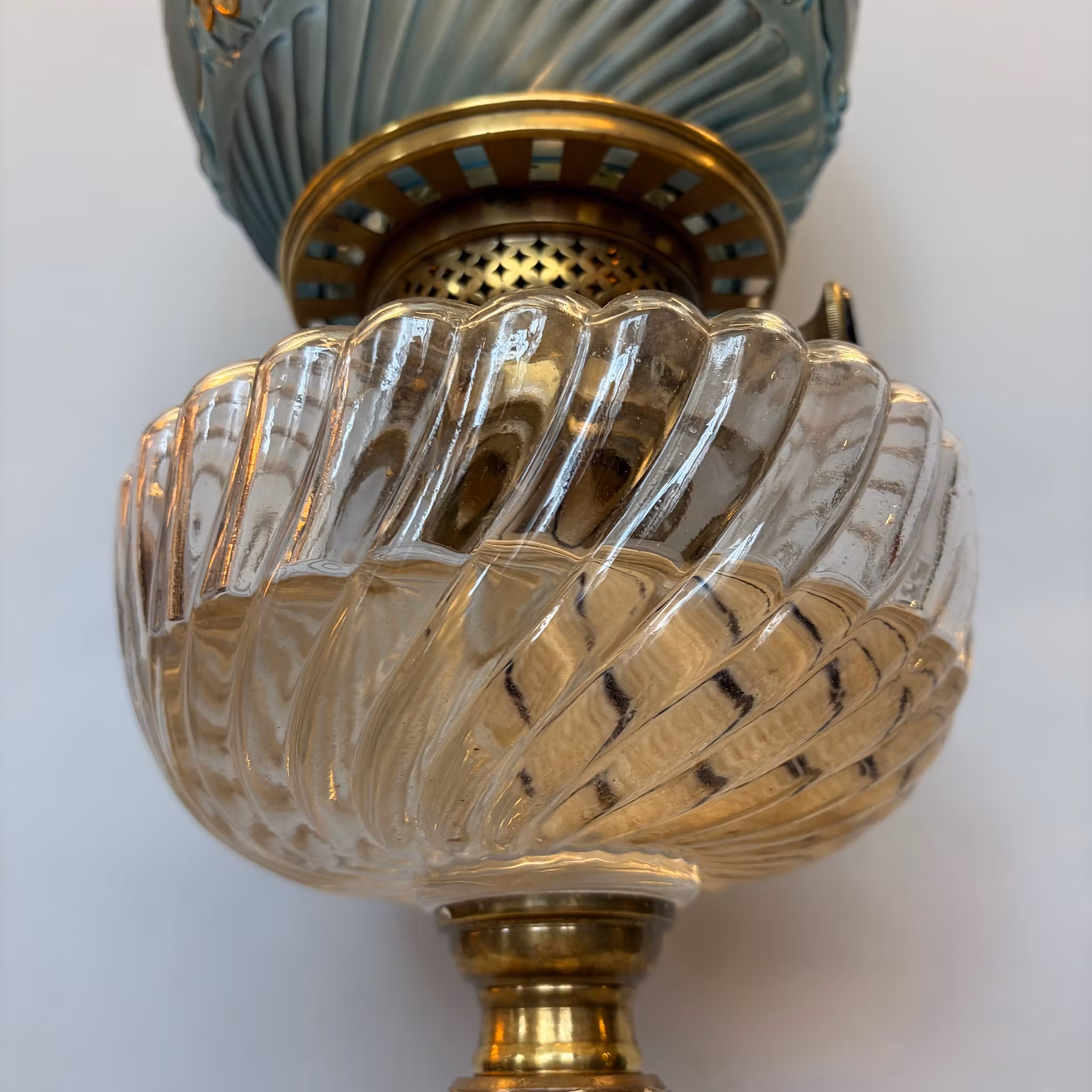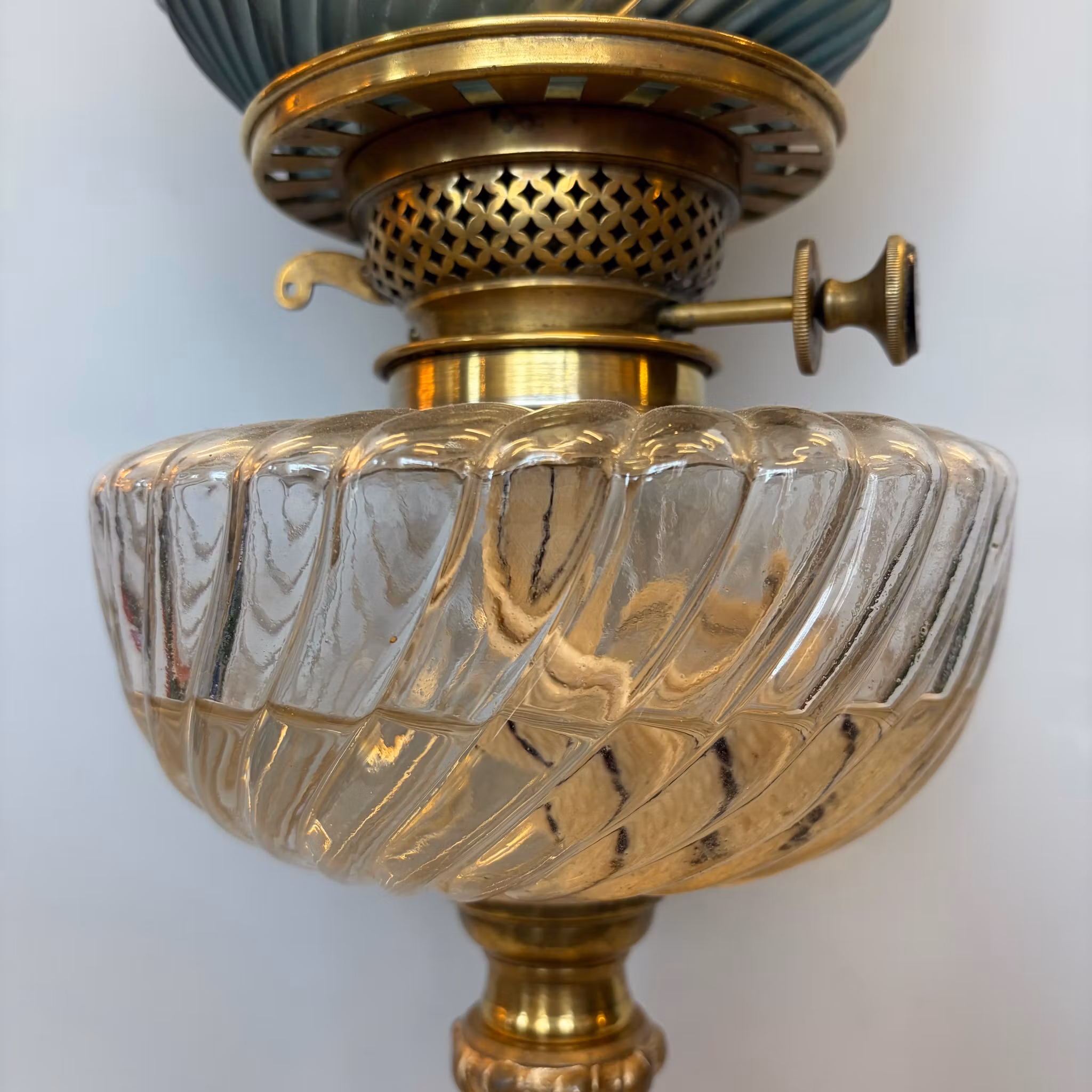 Fotogenlampa med duplexbrännare i polerad mässing.