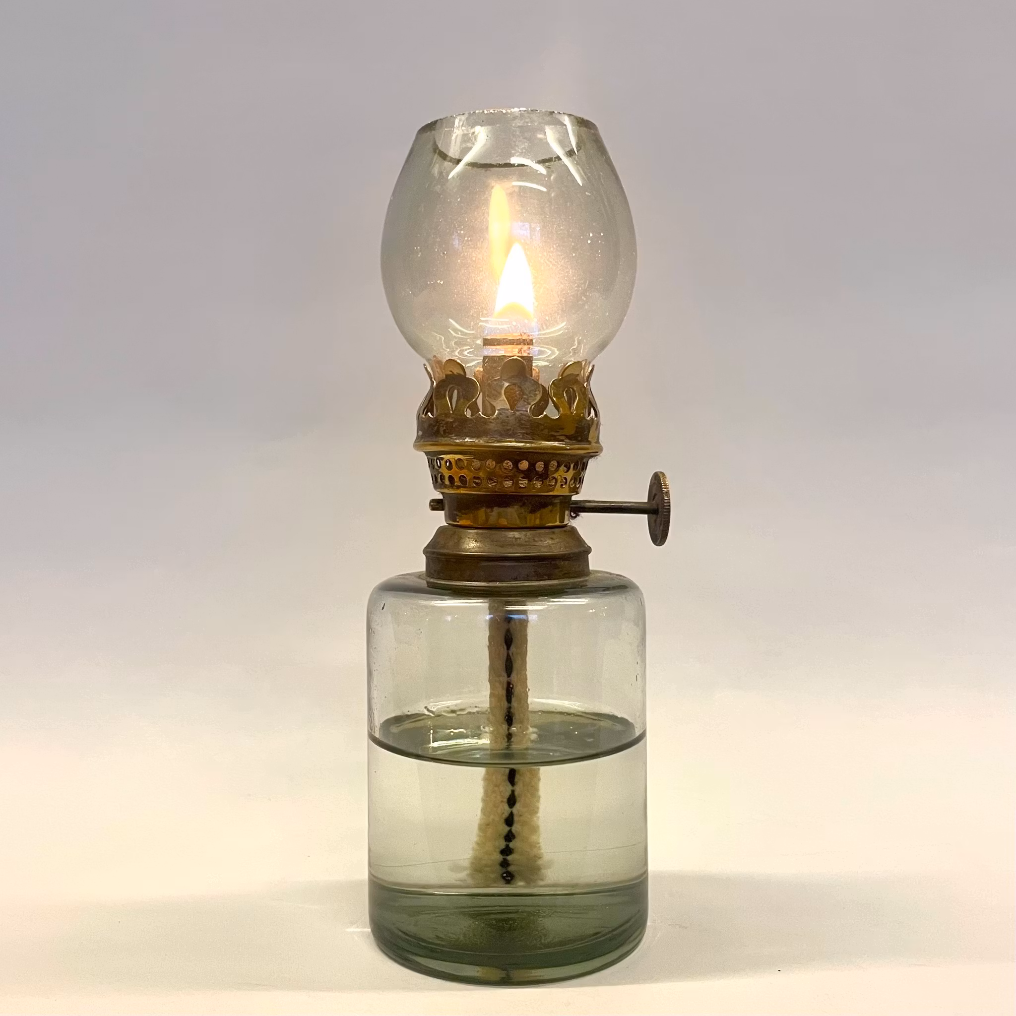 Miniatyrfotogenlampa med flatbrännare: Totalhöjd blott 15 cm och en fotdiameter på 5 cm bredd.