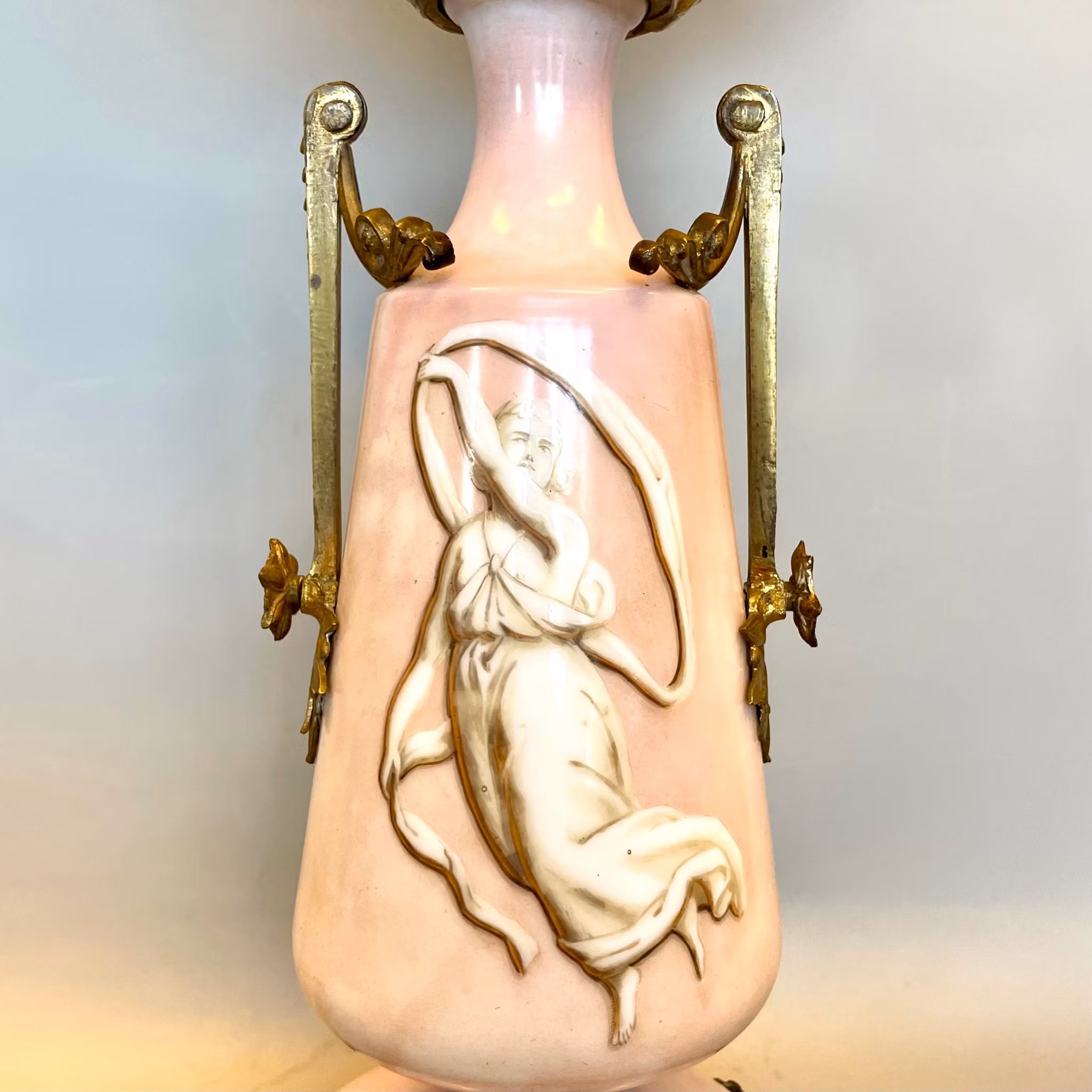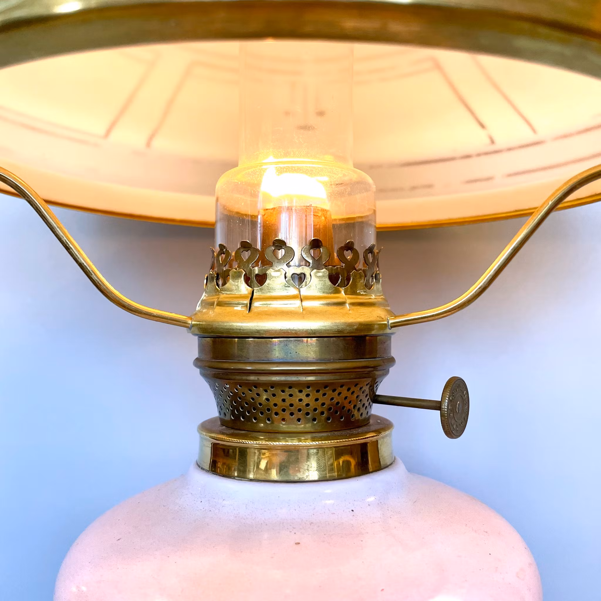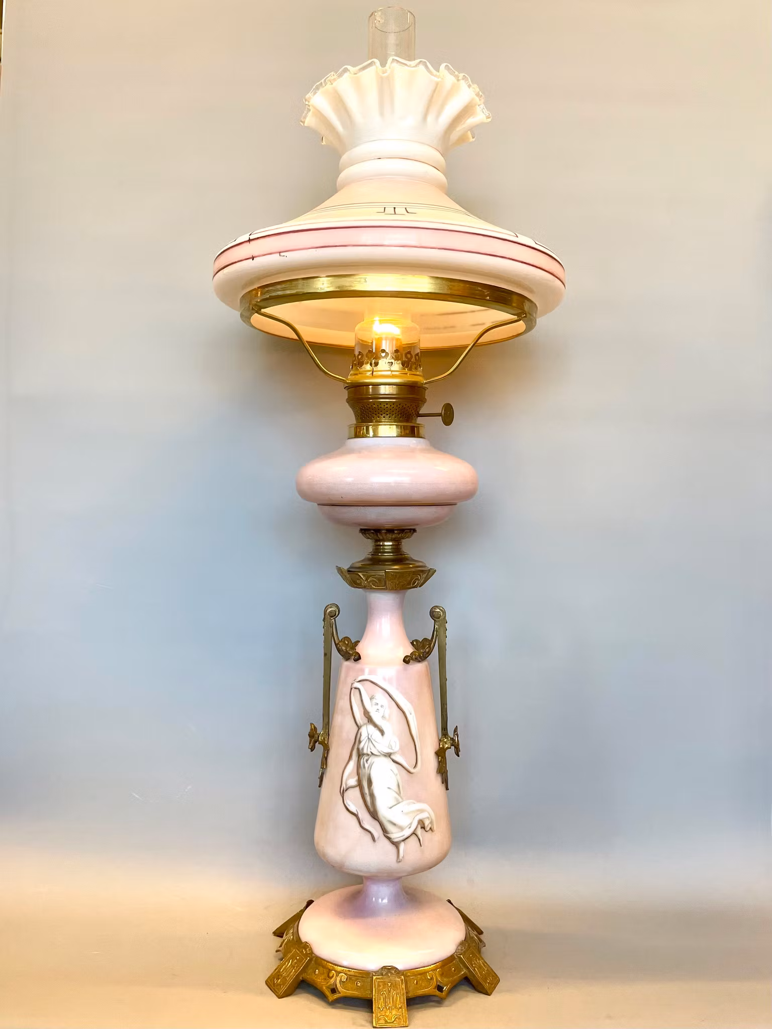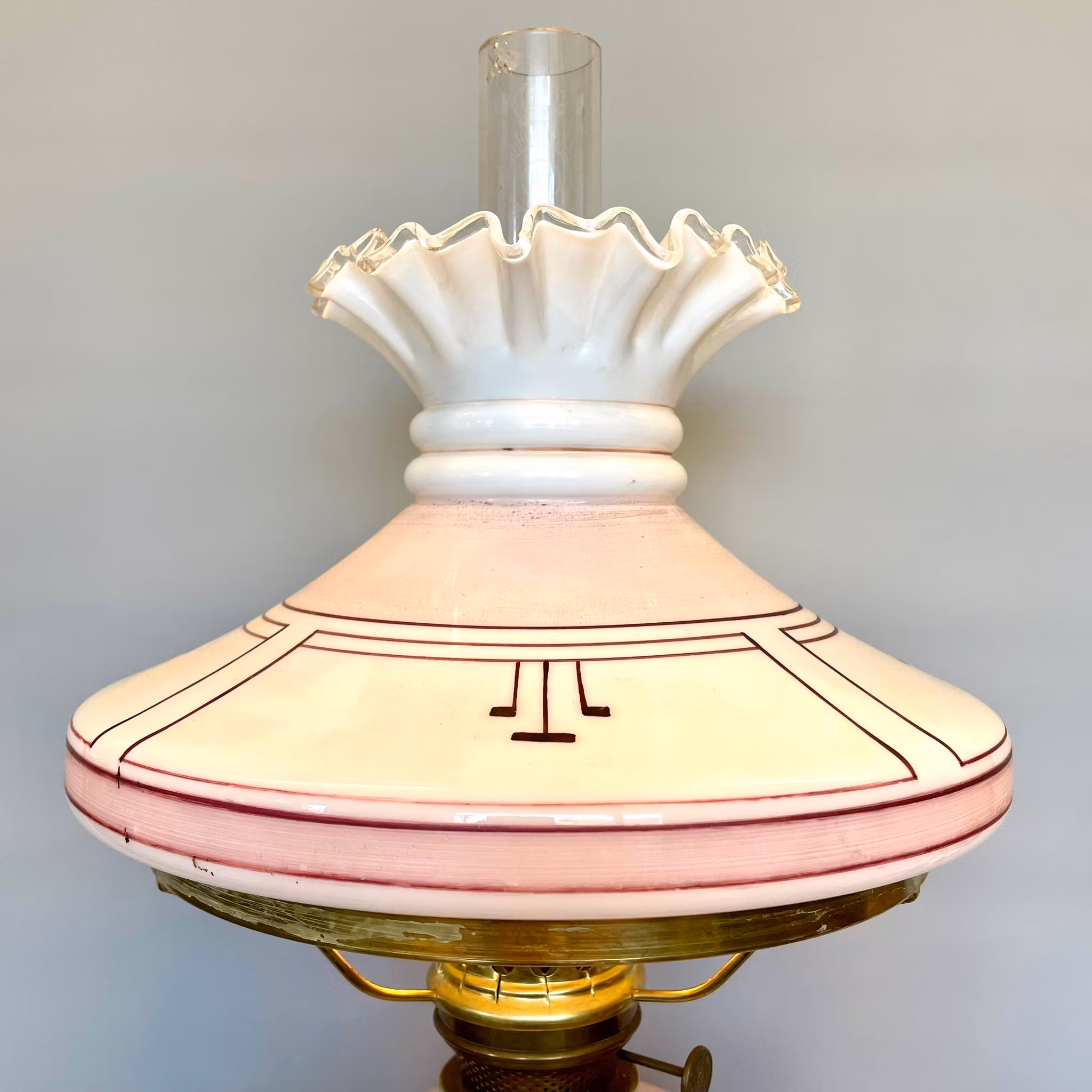 En unik antik fotogenlampa från cirka 1870/80-tal. Vacker handmålad fot och konad skärm i rosa färger. OBS: Skärmen har sämre färger på ena sidan. Fläckar finns på foten.