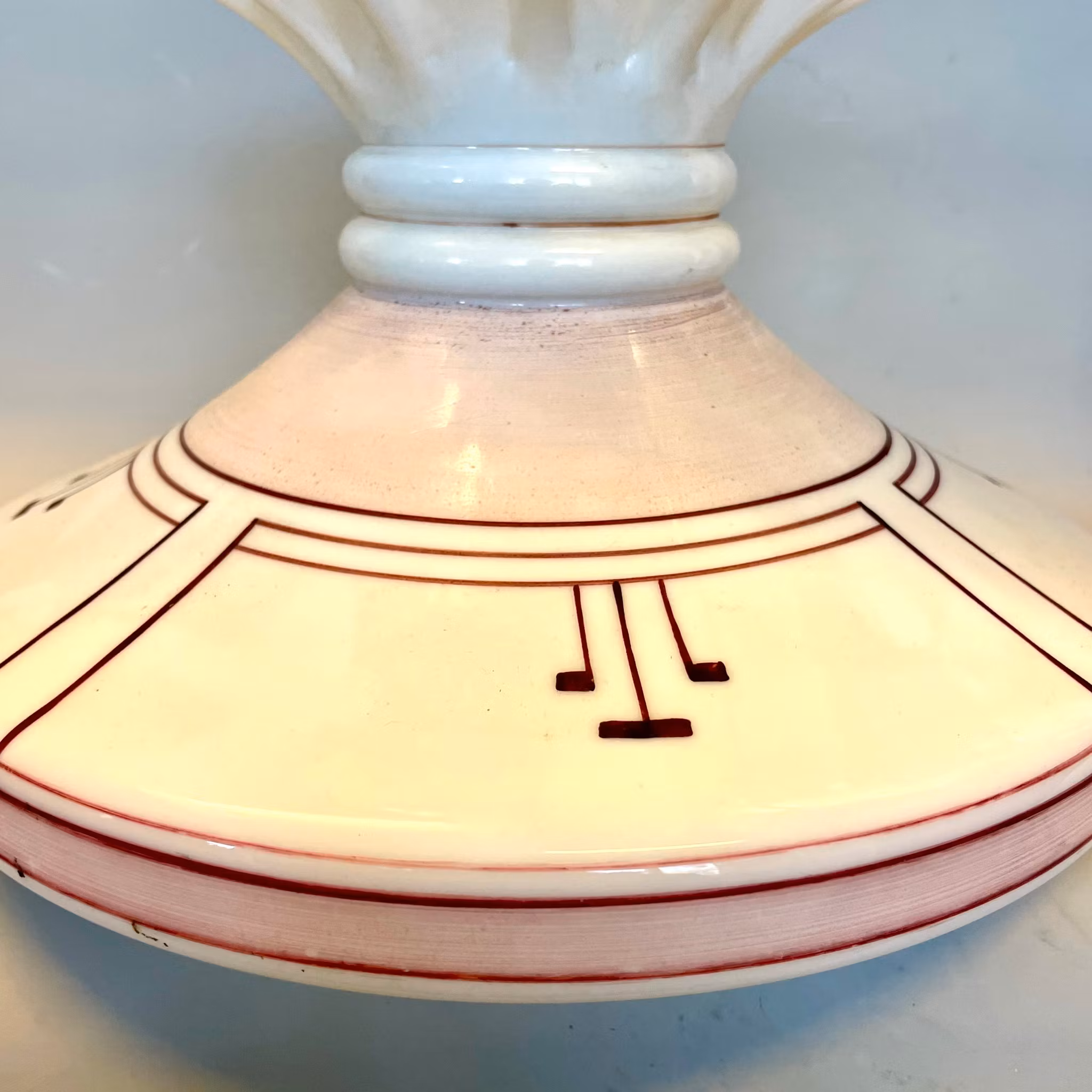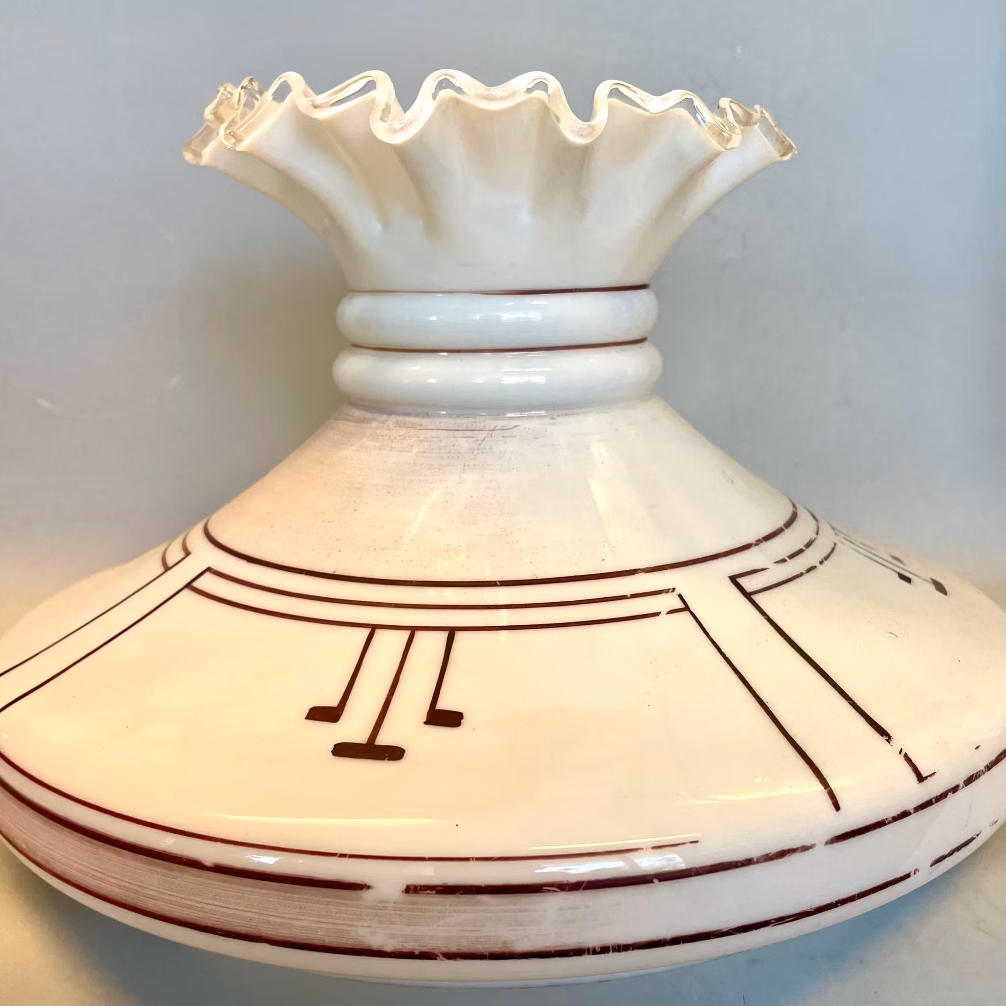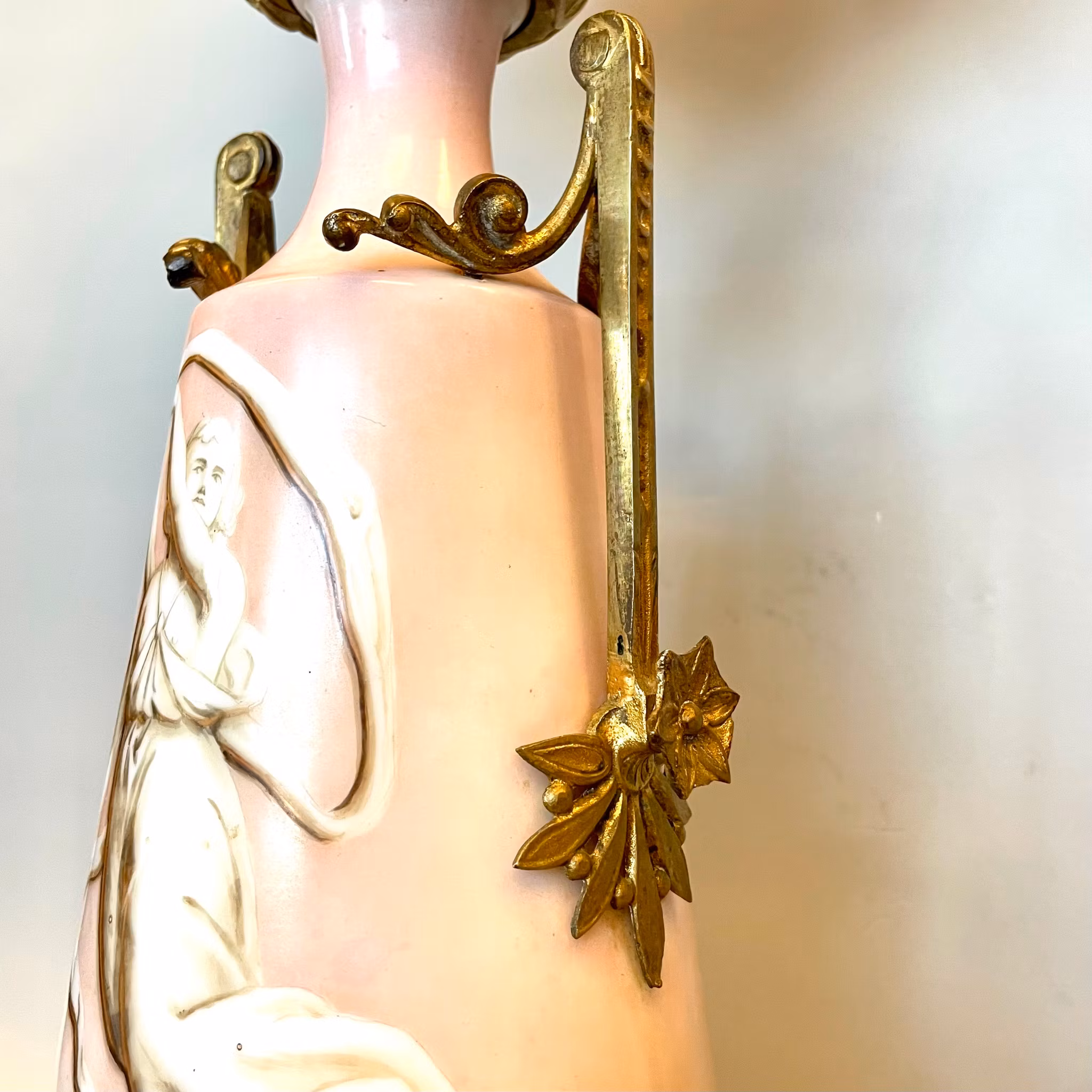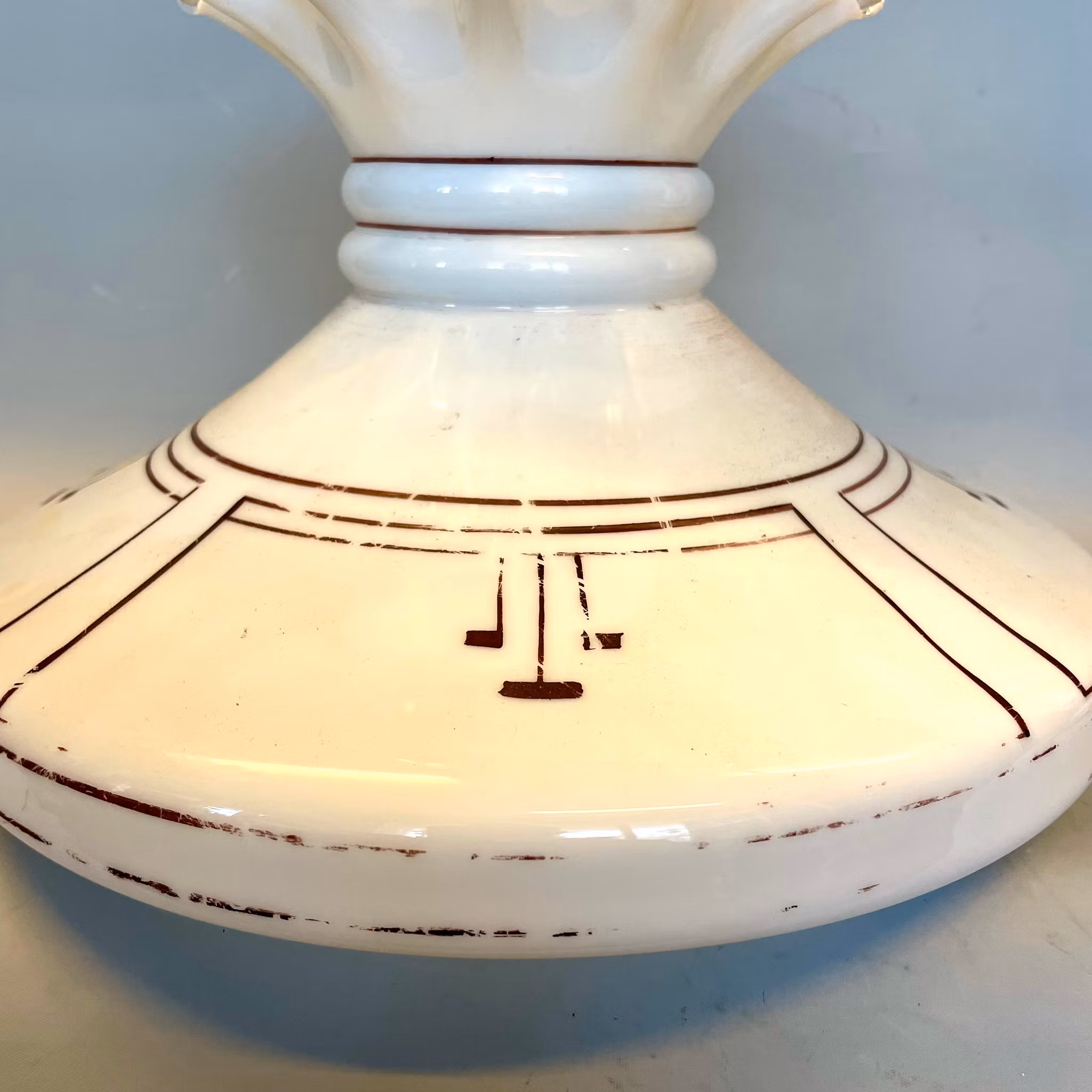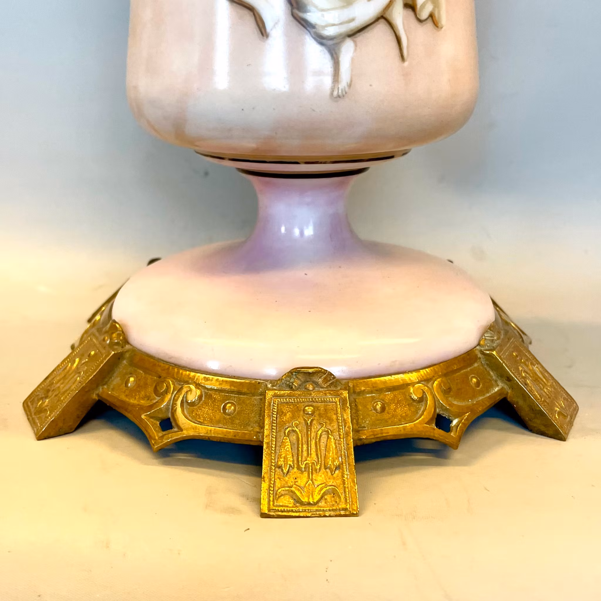 En unik antik fotogenlampa från cirka 1870/80-tal. Vacker handmålad fot och konad skärm i rosa färger. OBS: Skärmen har sämre färger på ena sidan. Fläckar finns på foten.