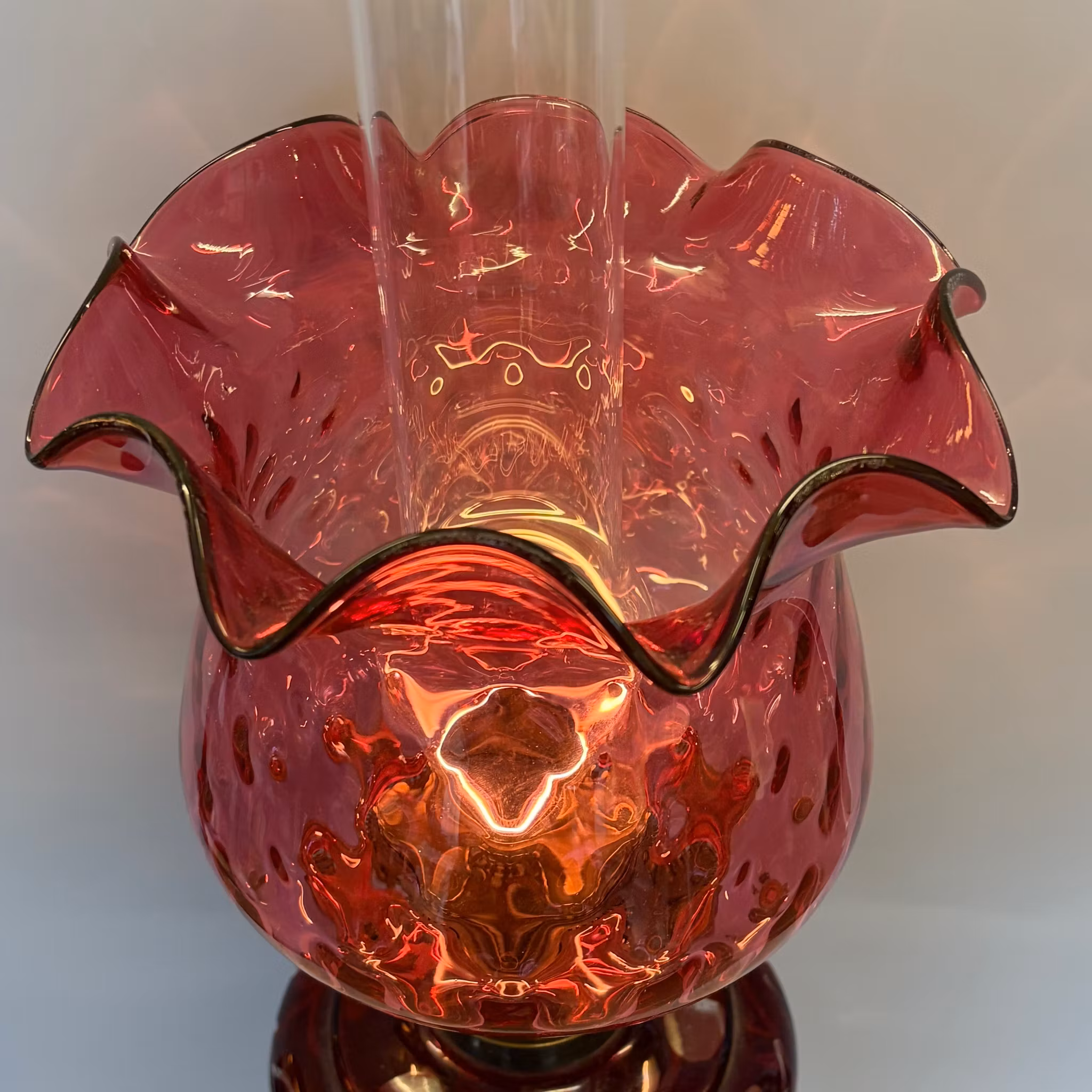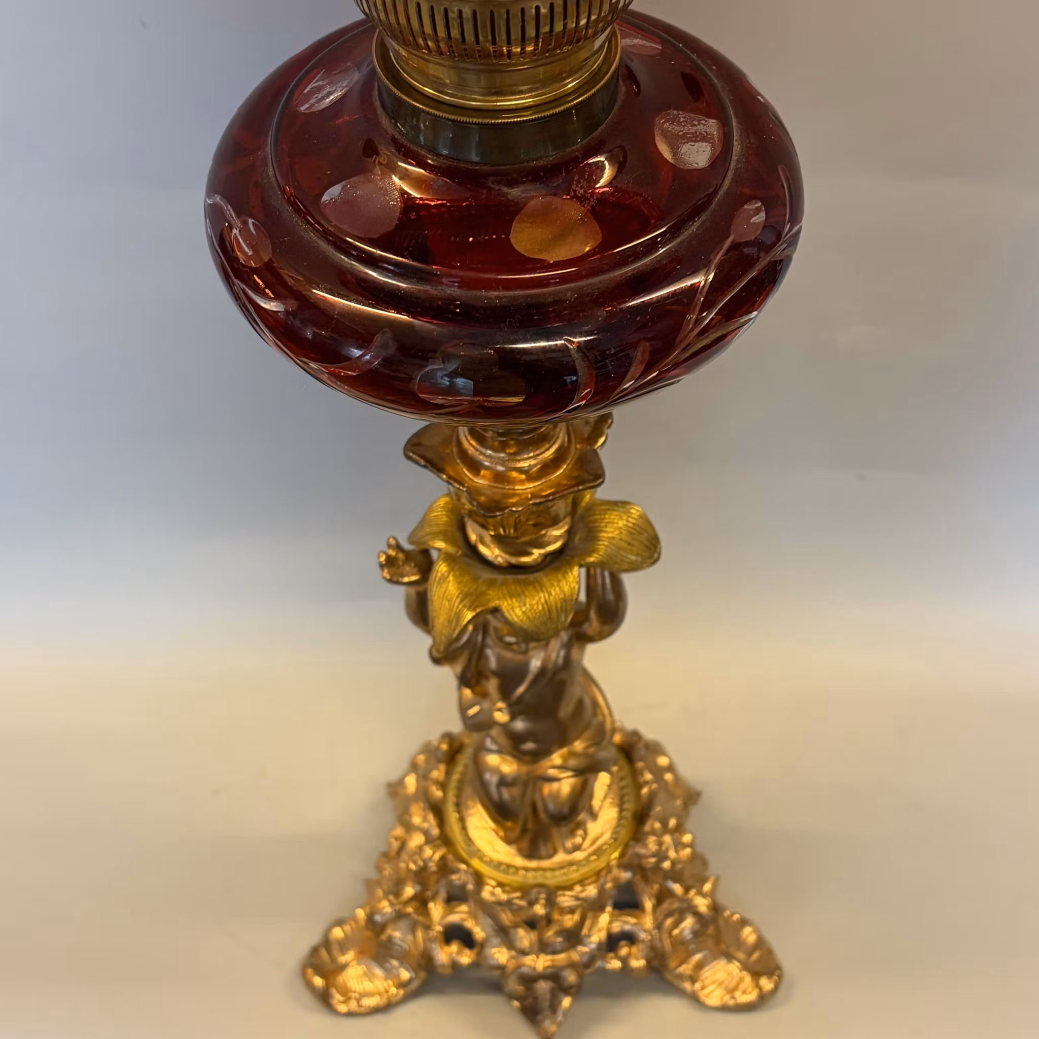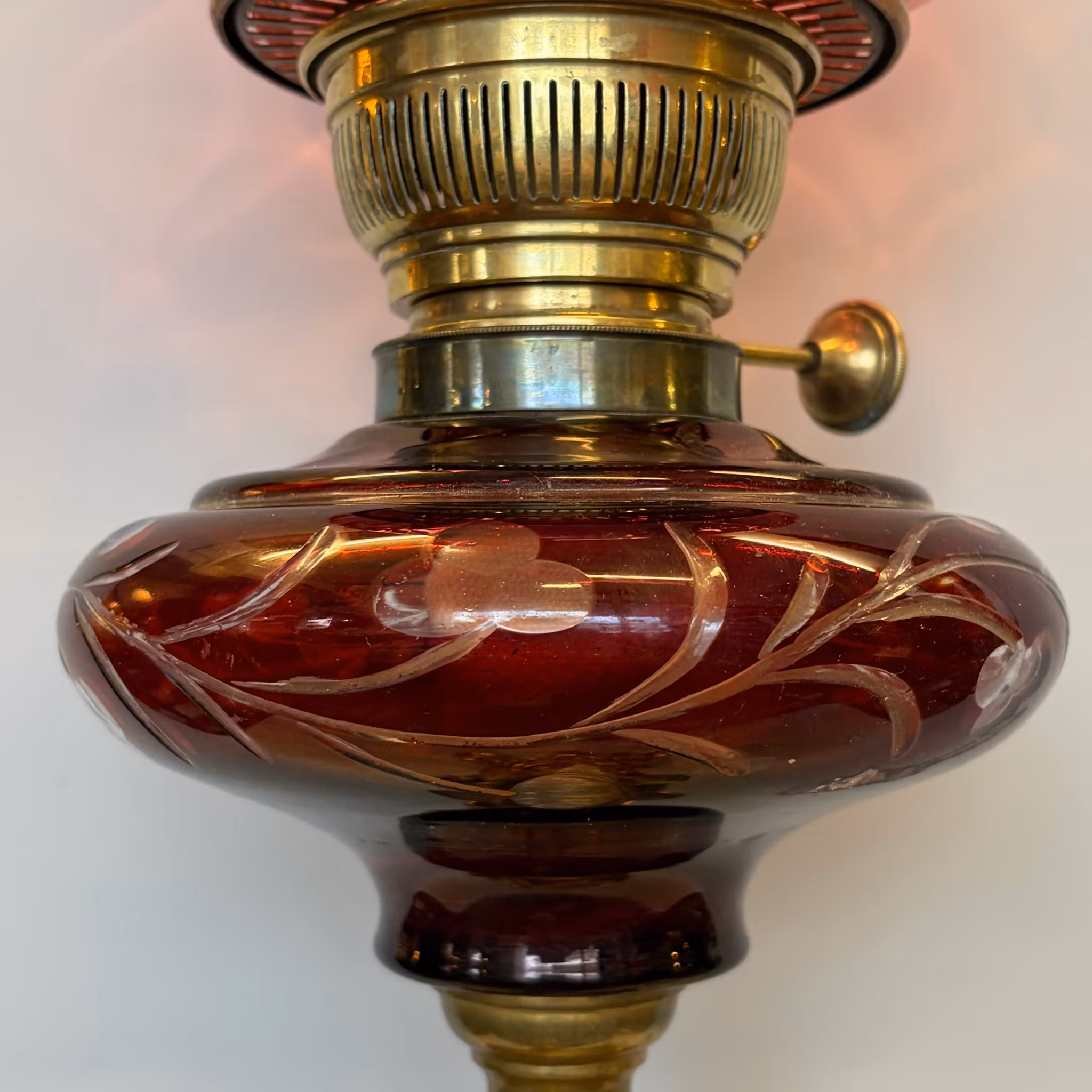 En helt fantastisk fotogenlampa med guldmålad fot och vinrött oljehus i 1870-tals modell. Utrustad med en rejäl Baldurbrännare och en underbar mörkrosa kupa.