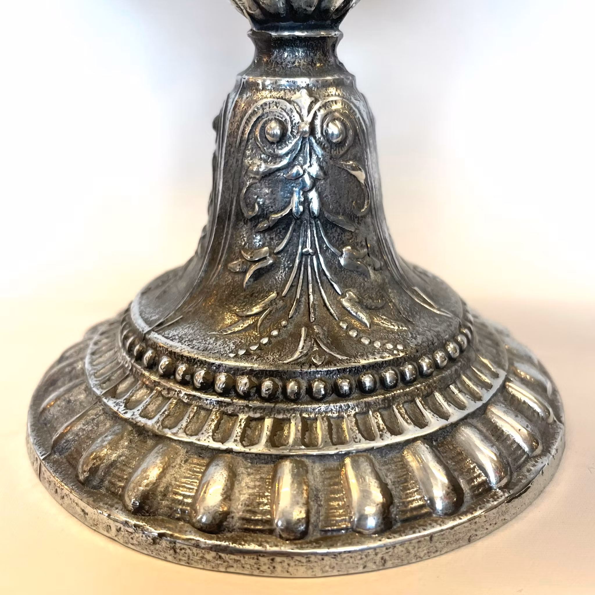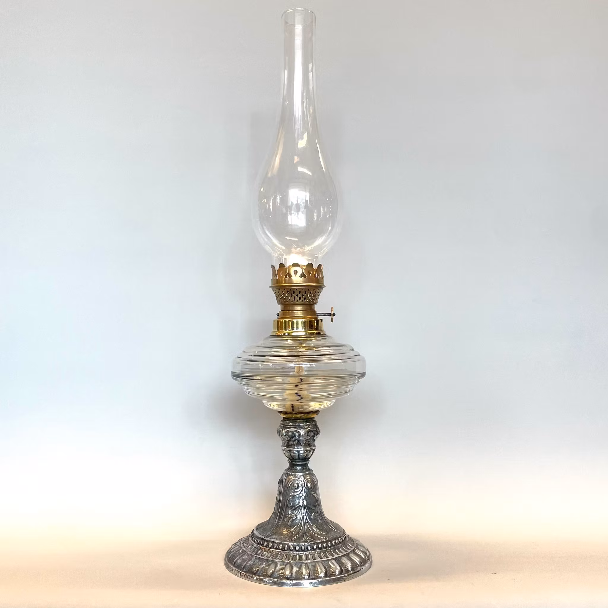 En klassisk mindre bordsfotogenlampa med äldre oljehus i glas och silvrig fot.