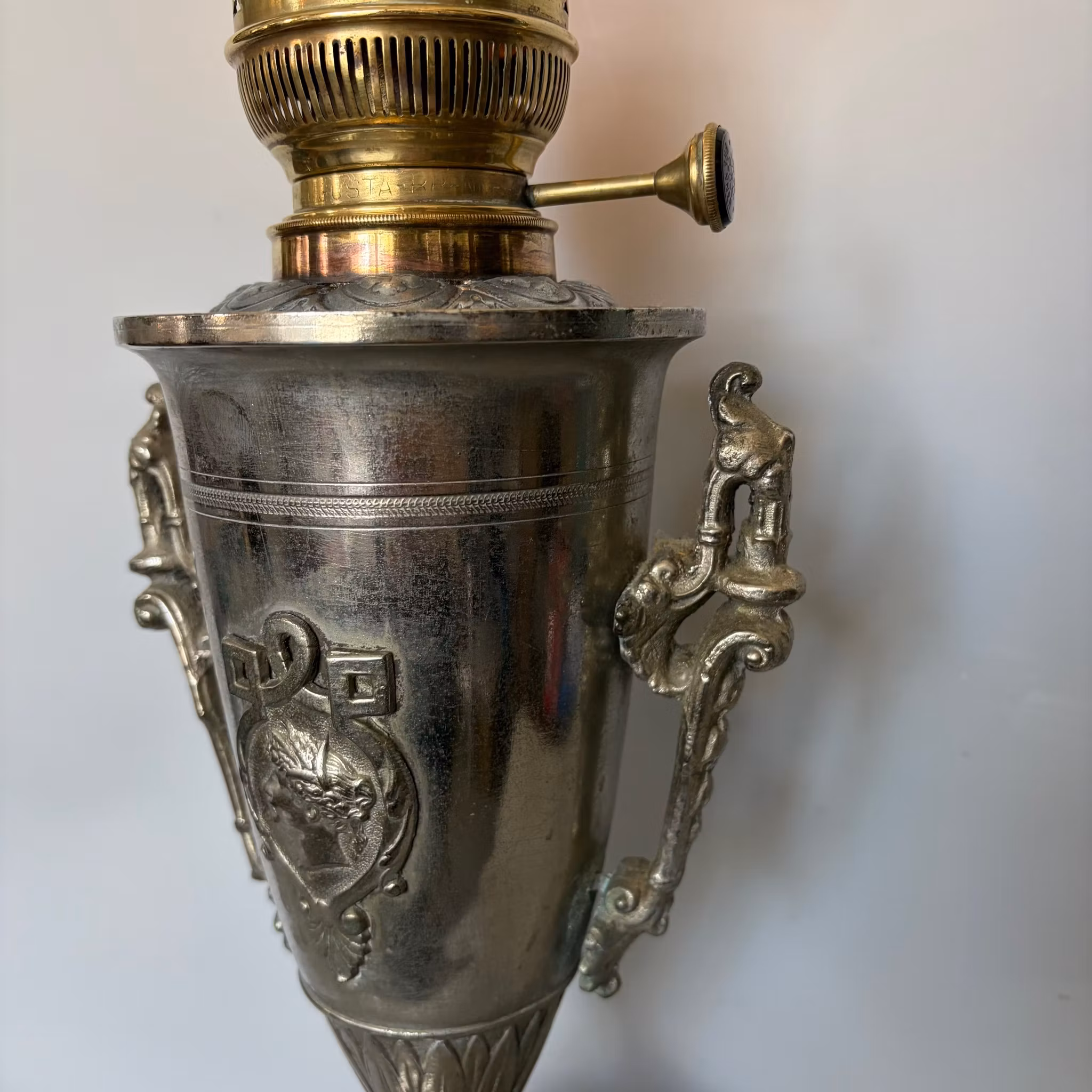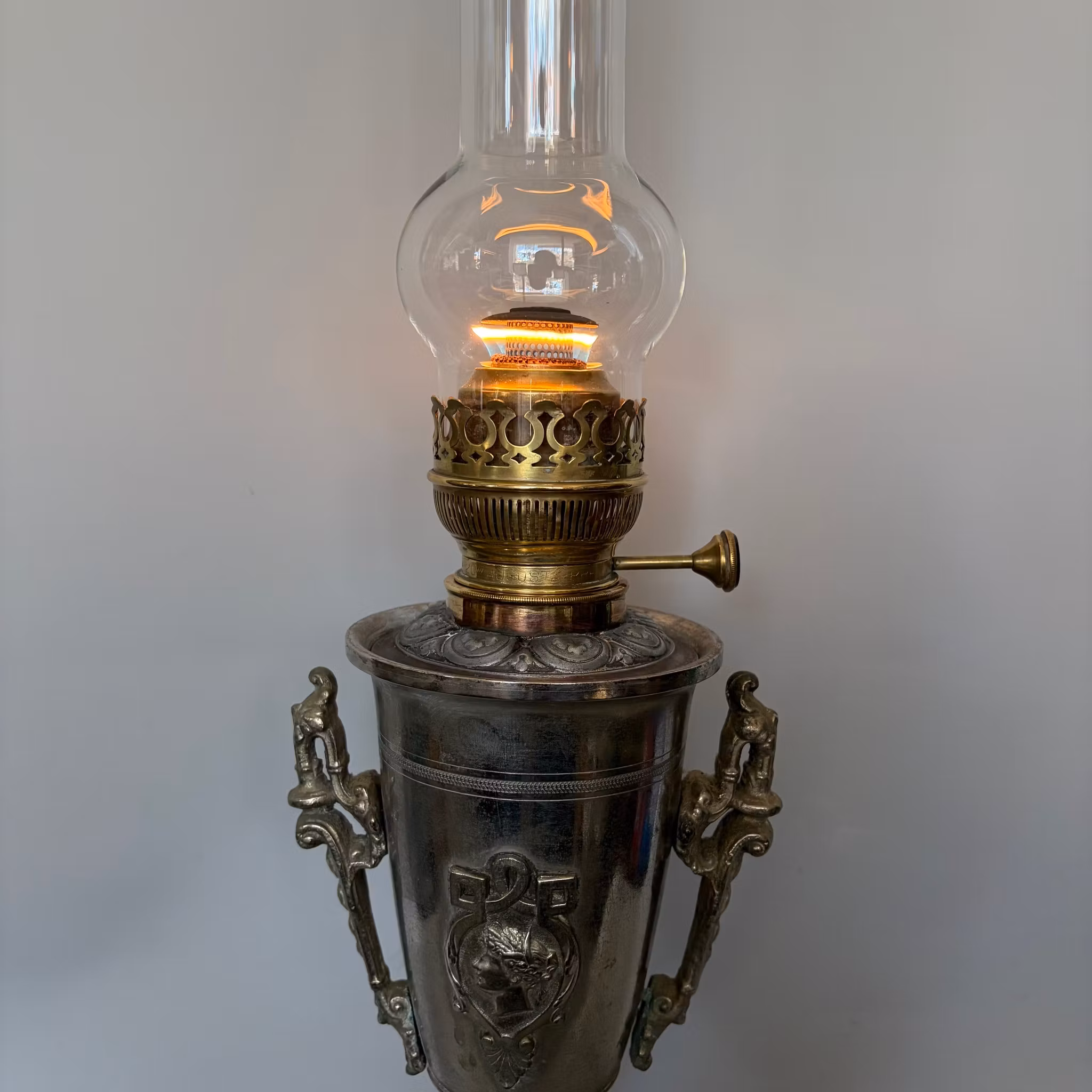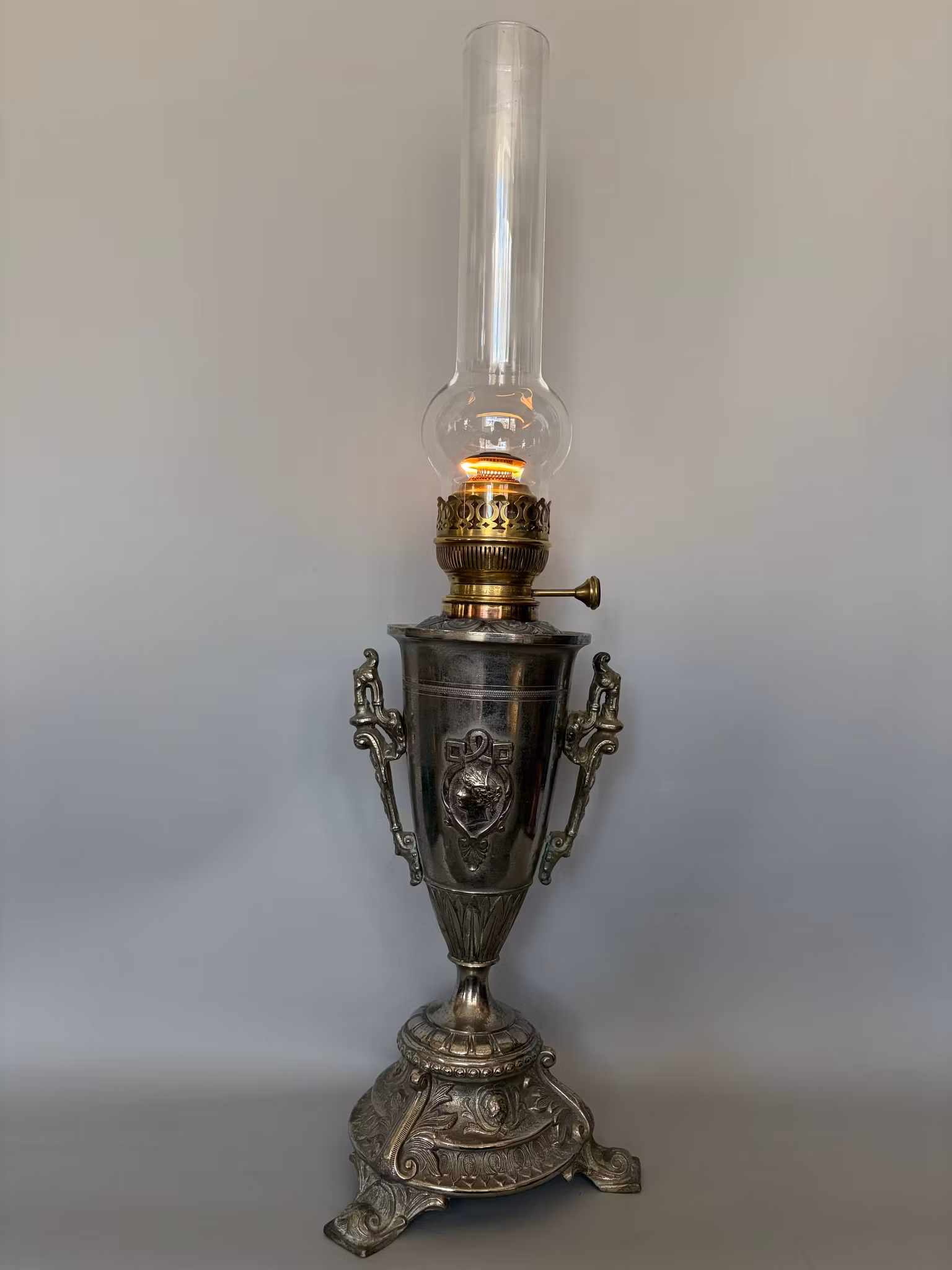 Fotogenlampa antik förnicklad. "Handtagen" sitter lite löst monterade.