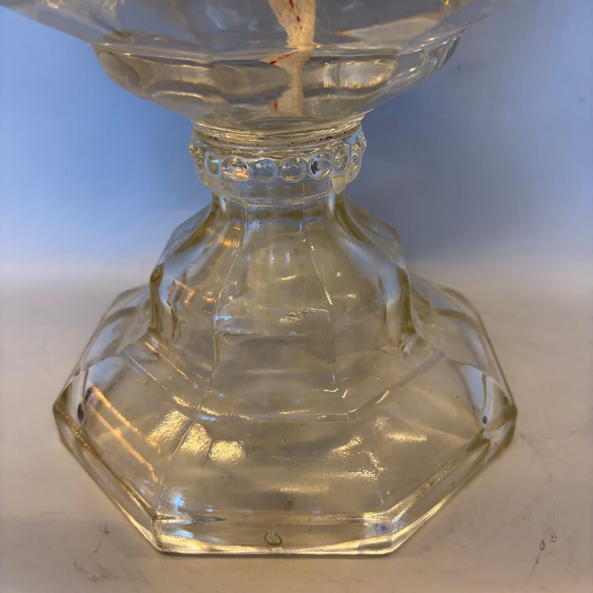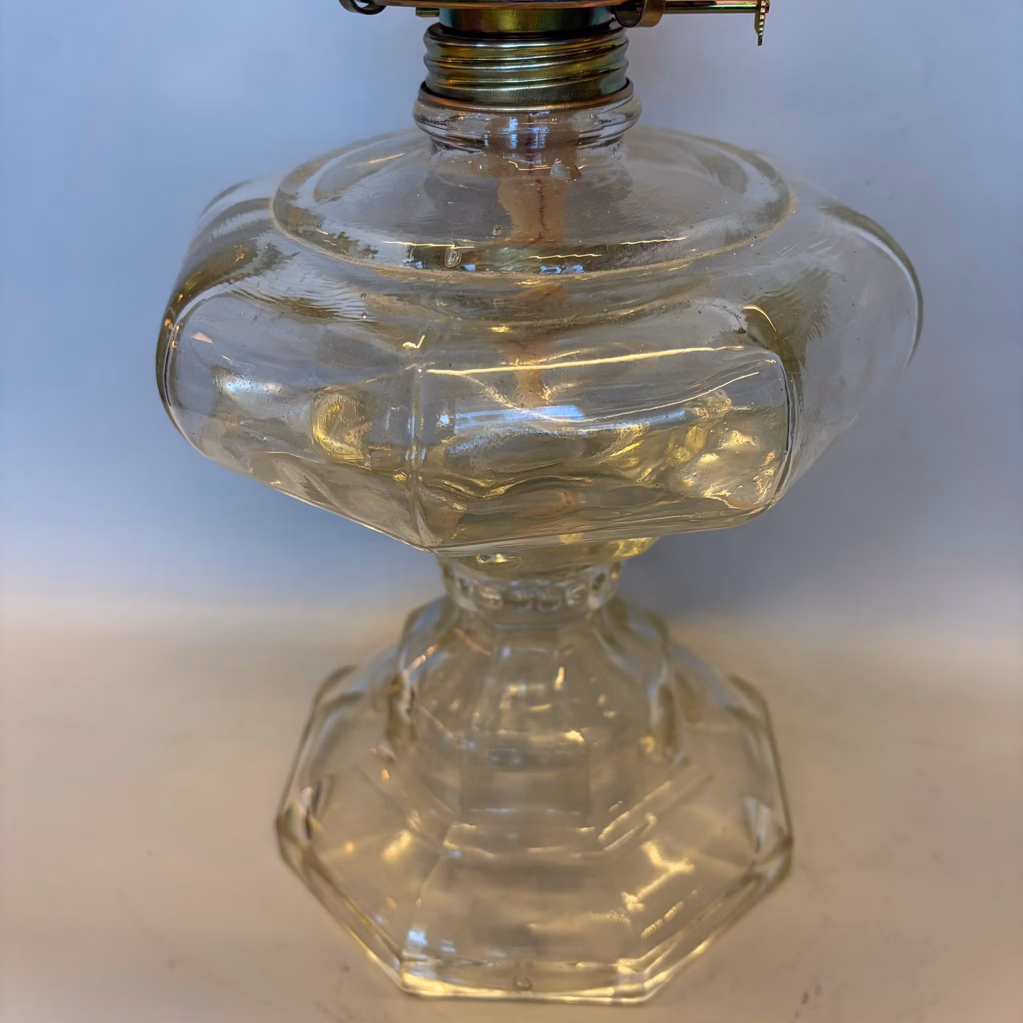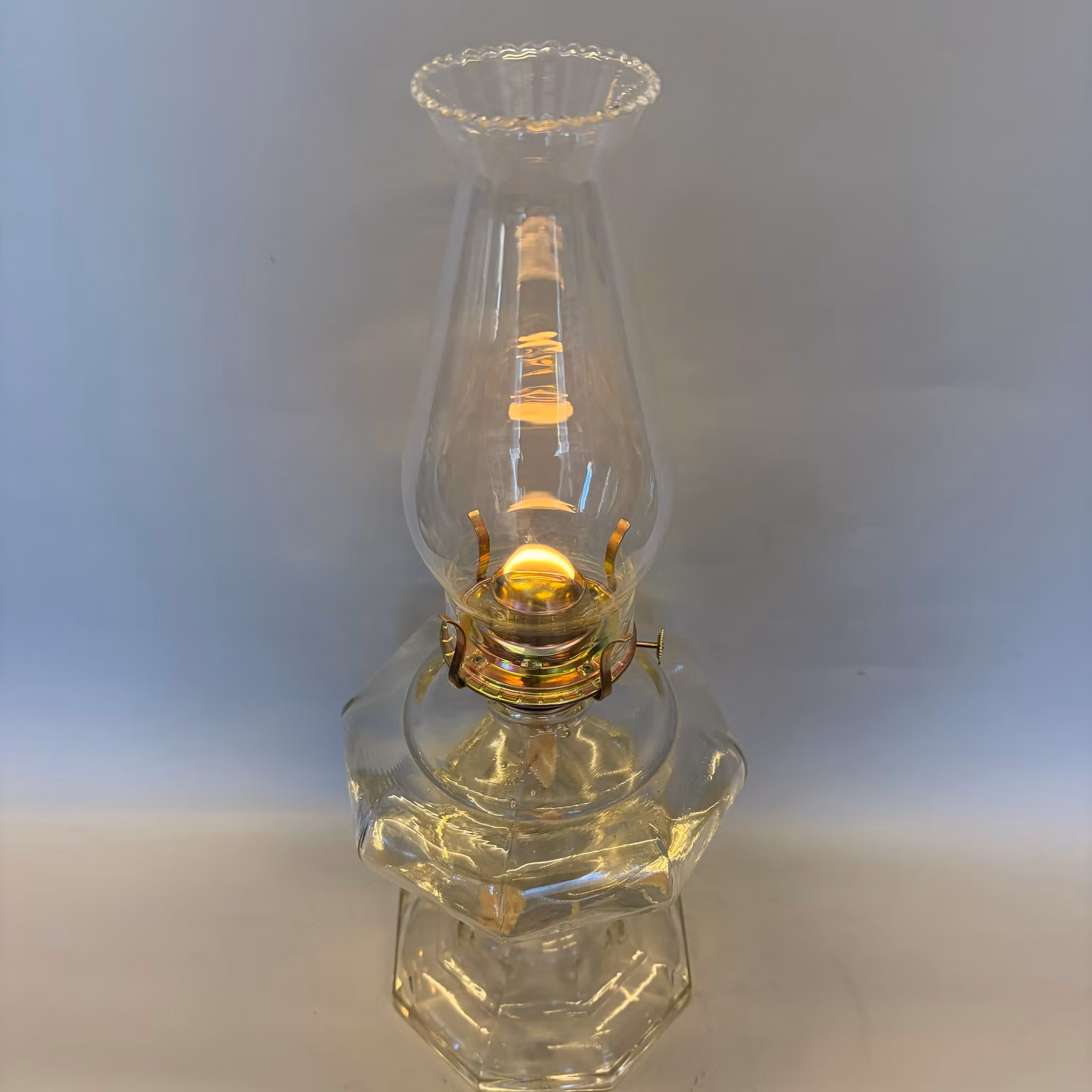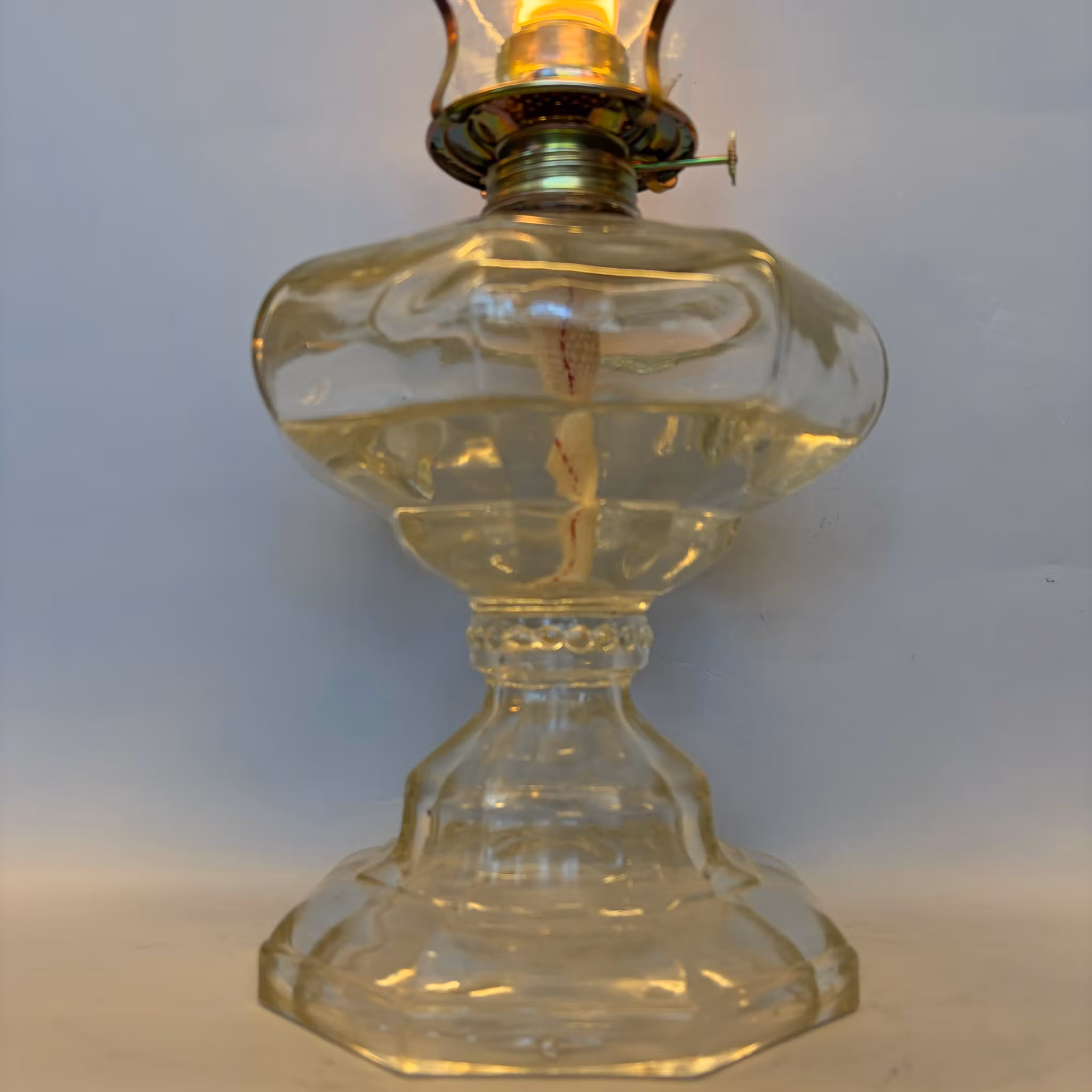 En stor maffig bordsfotogenlampa med fot och oljehus helt i glas och en stor Lotusbrännare samt ett krusigt lotusglas.