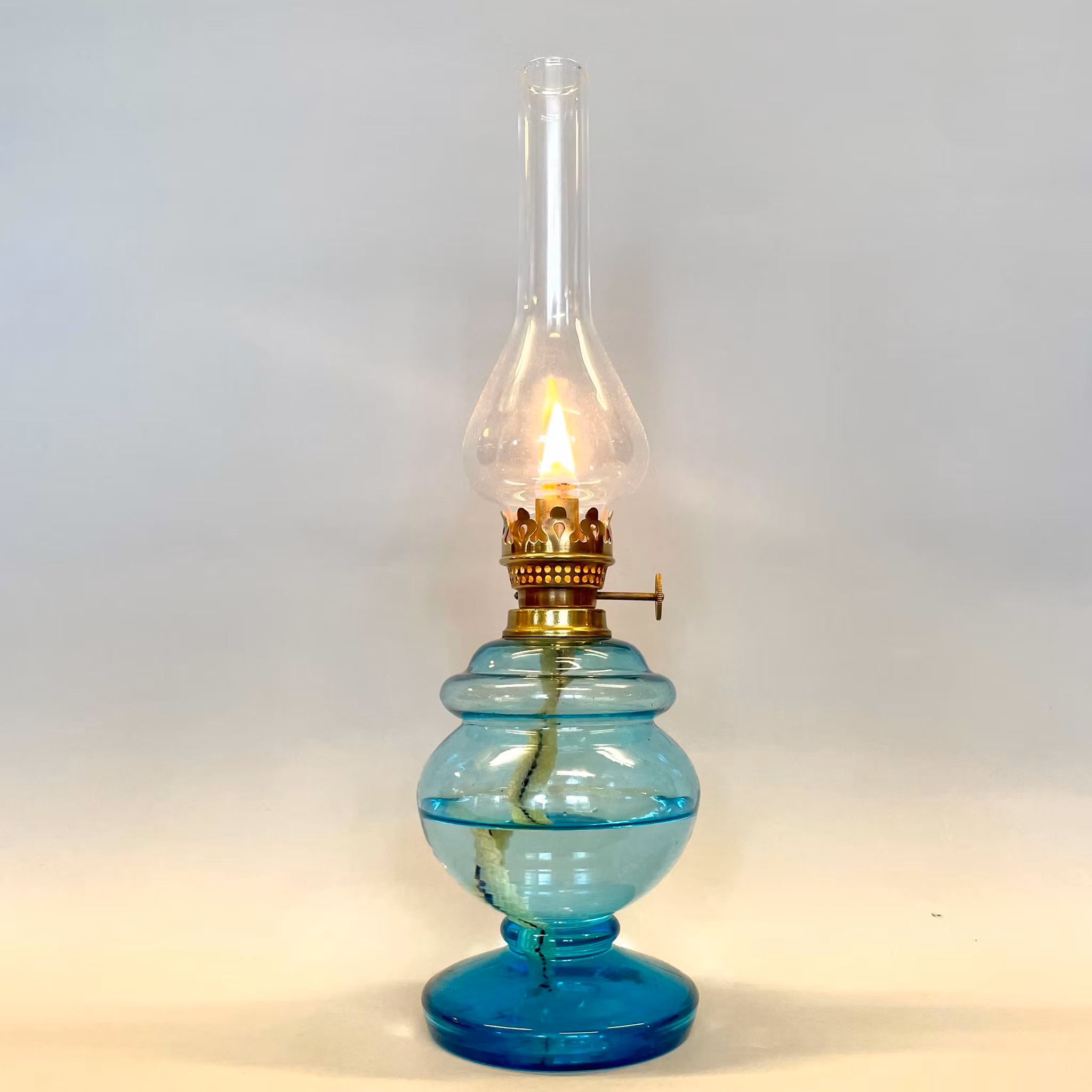 En riktigt läcker liten fotogenlampa med turkost oljehus i glas.