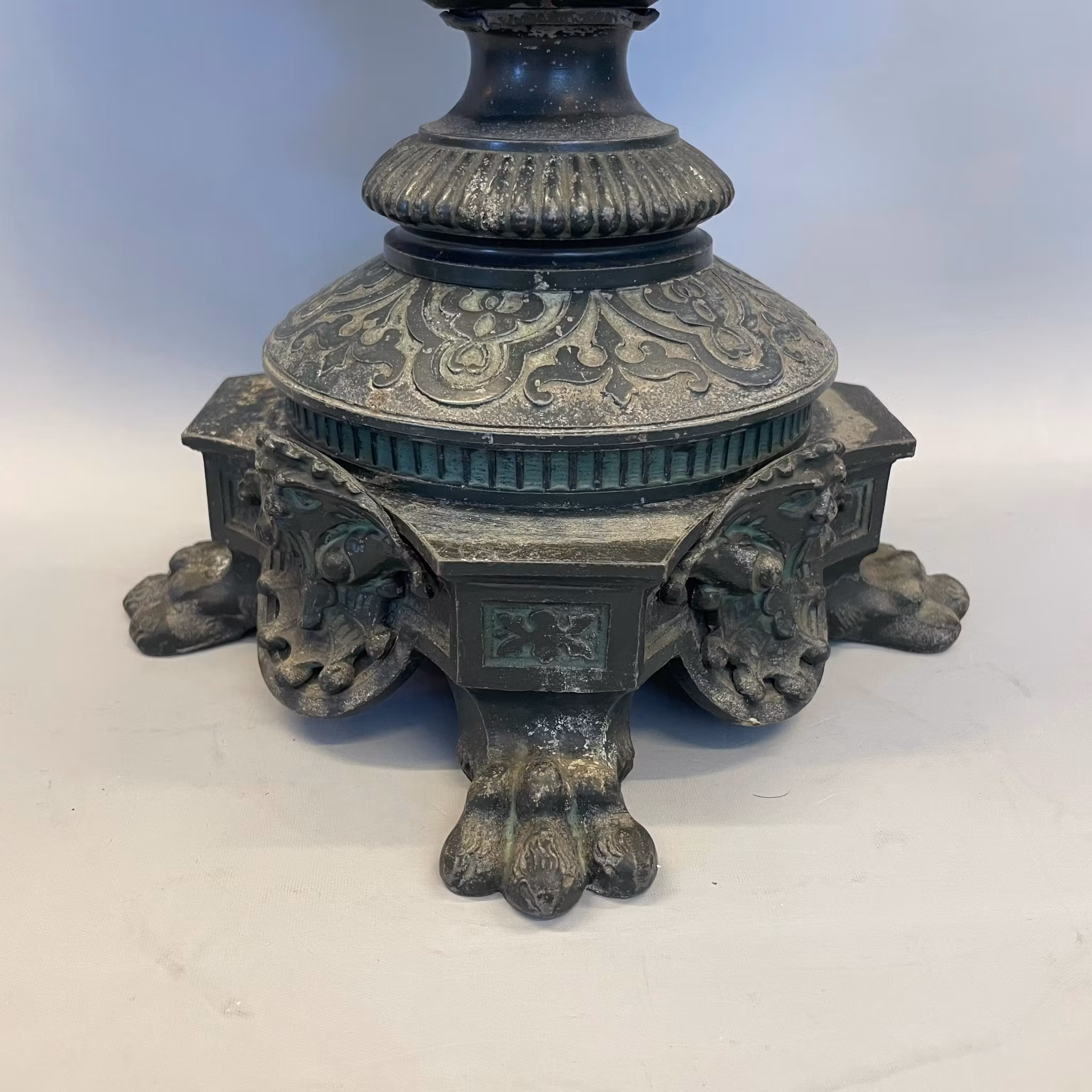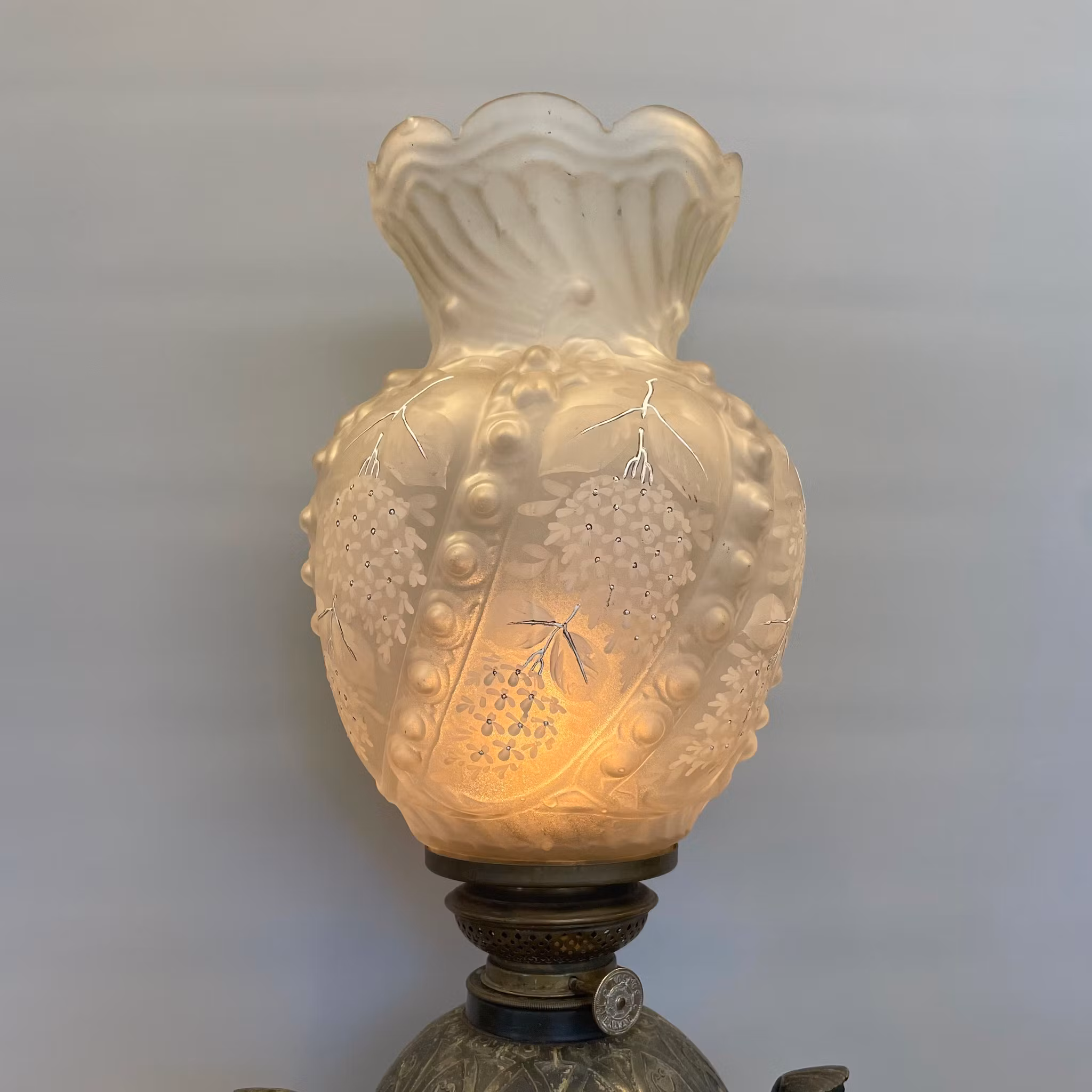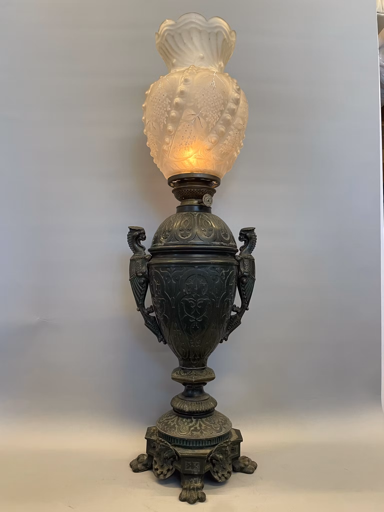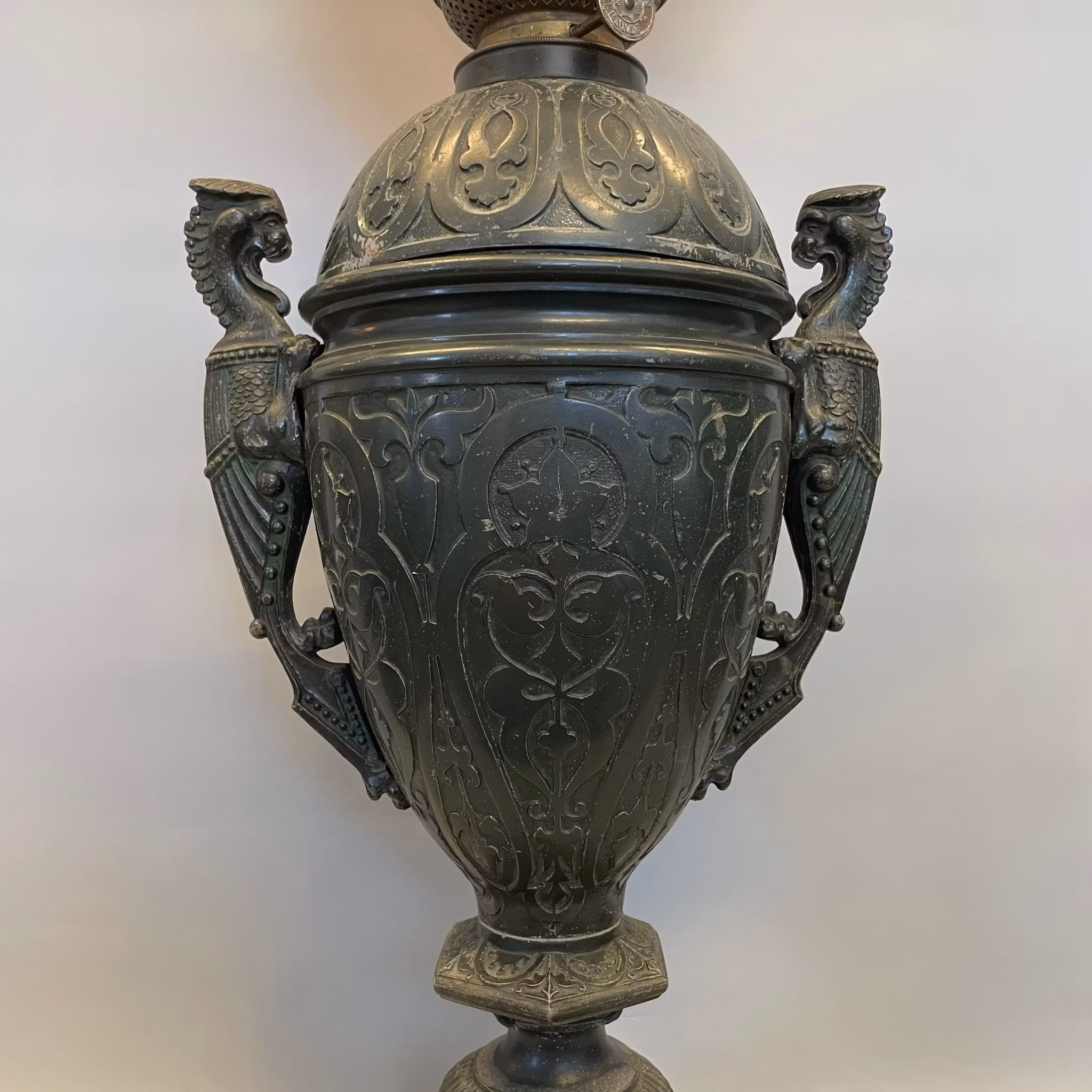 En häftig och snygg bordsfotogenlampa i urnmodell med en brännare i mässing i storlek 14'' och en riktigt snygg antik kupa.