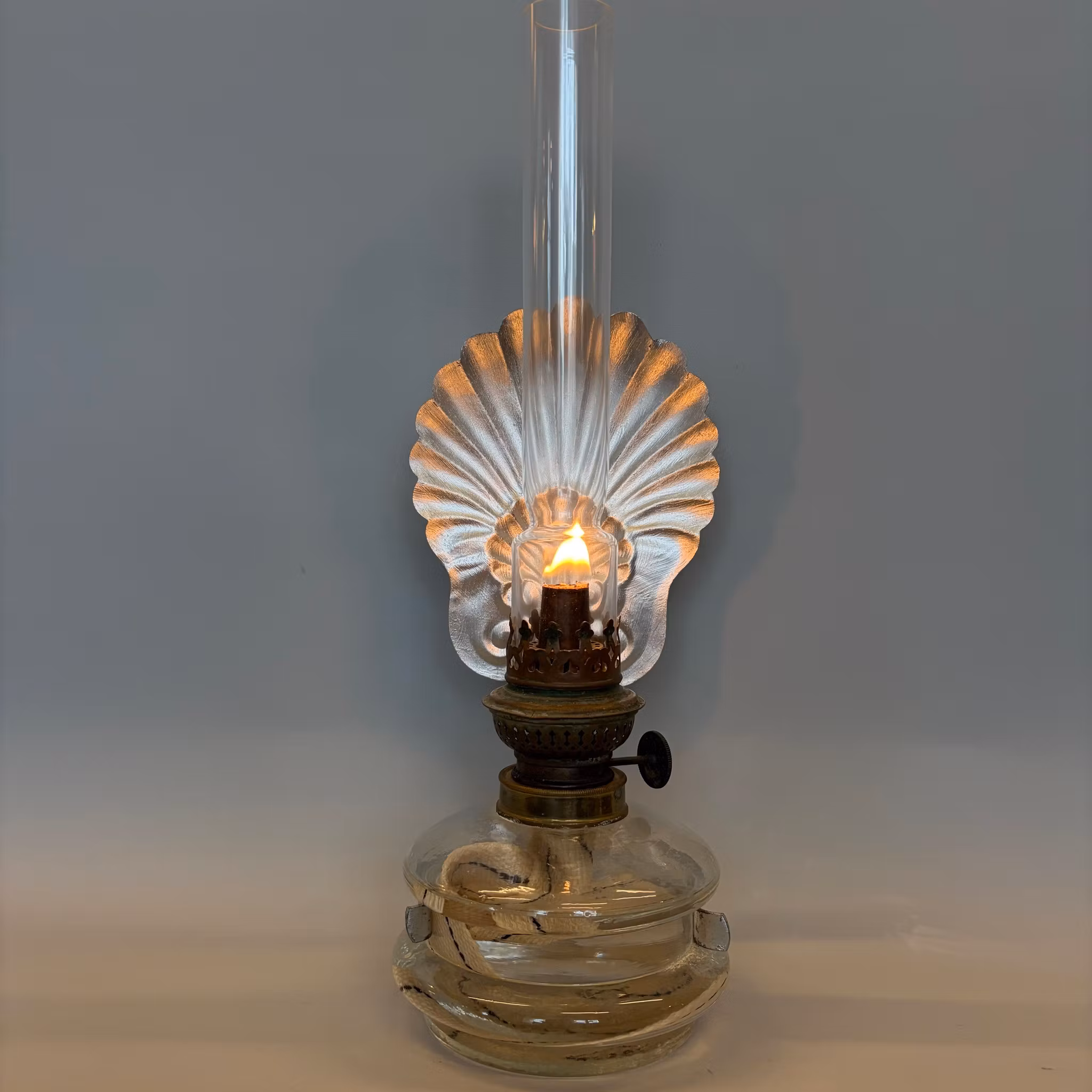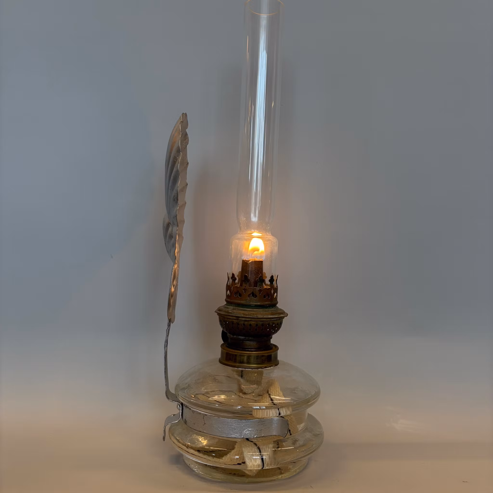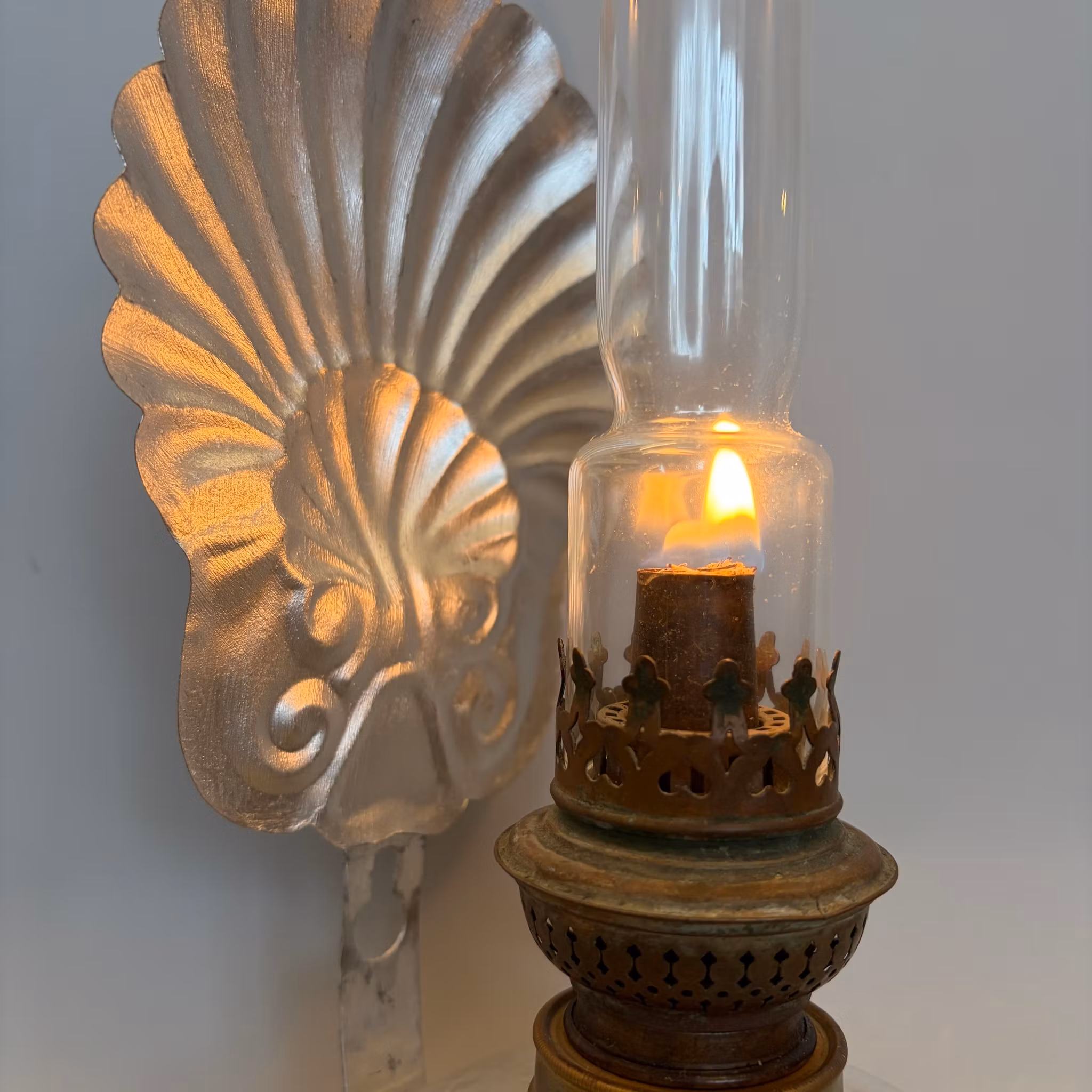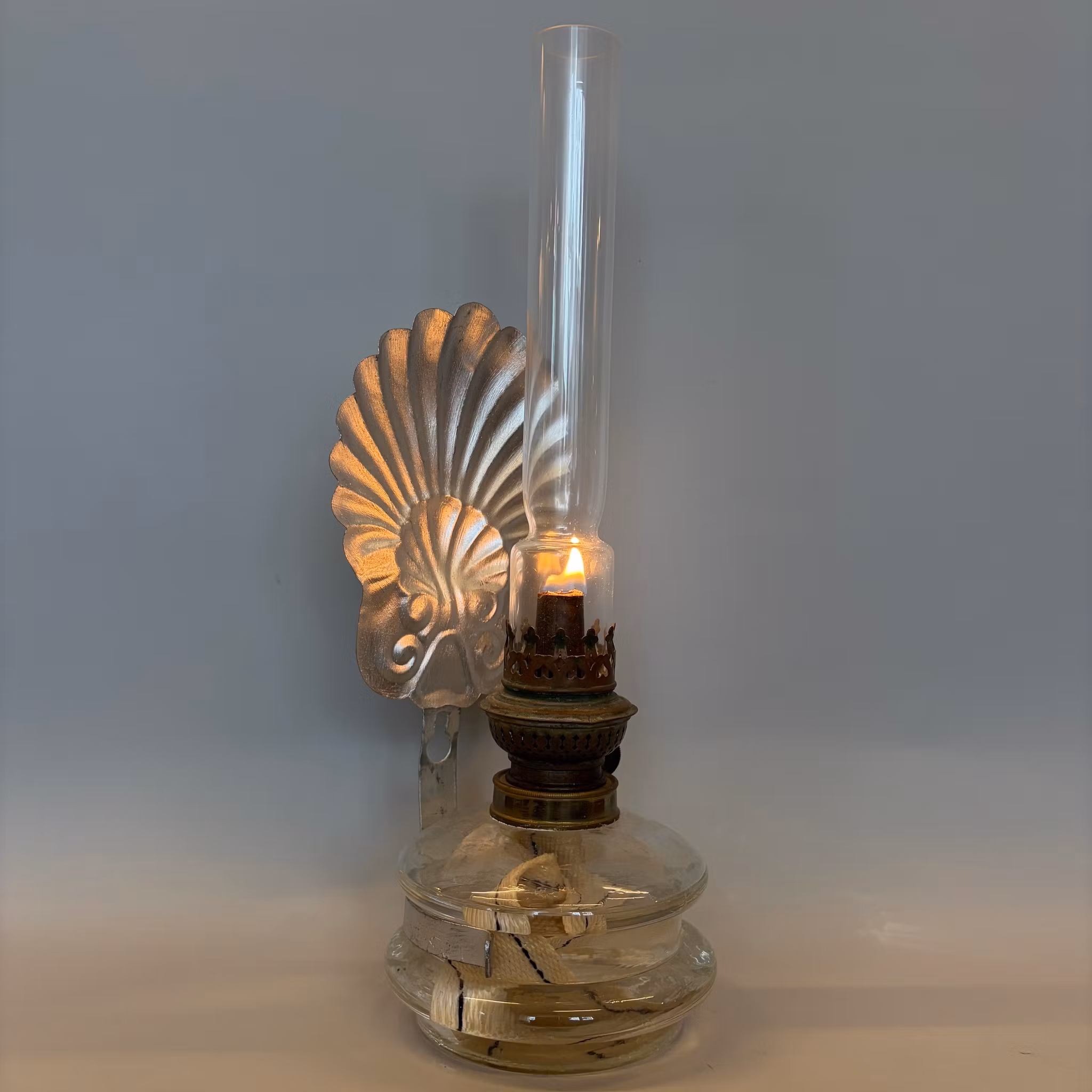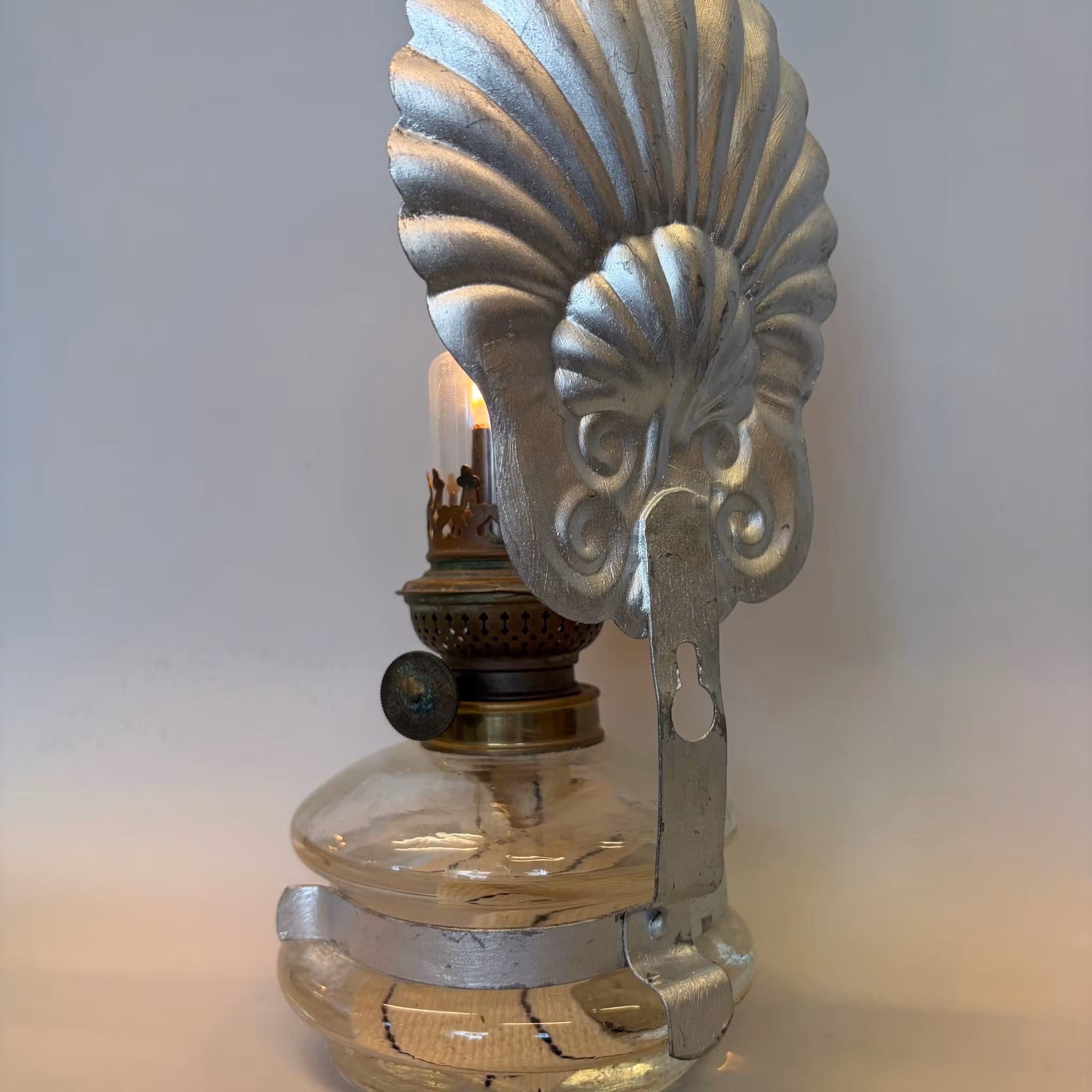 En vacker klassisk väggfotogenlampa i glas med väggreflektor i form av en silvermålad snäcka.
