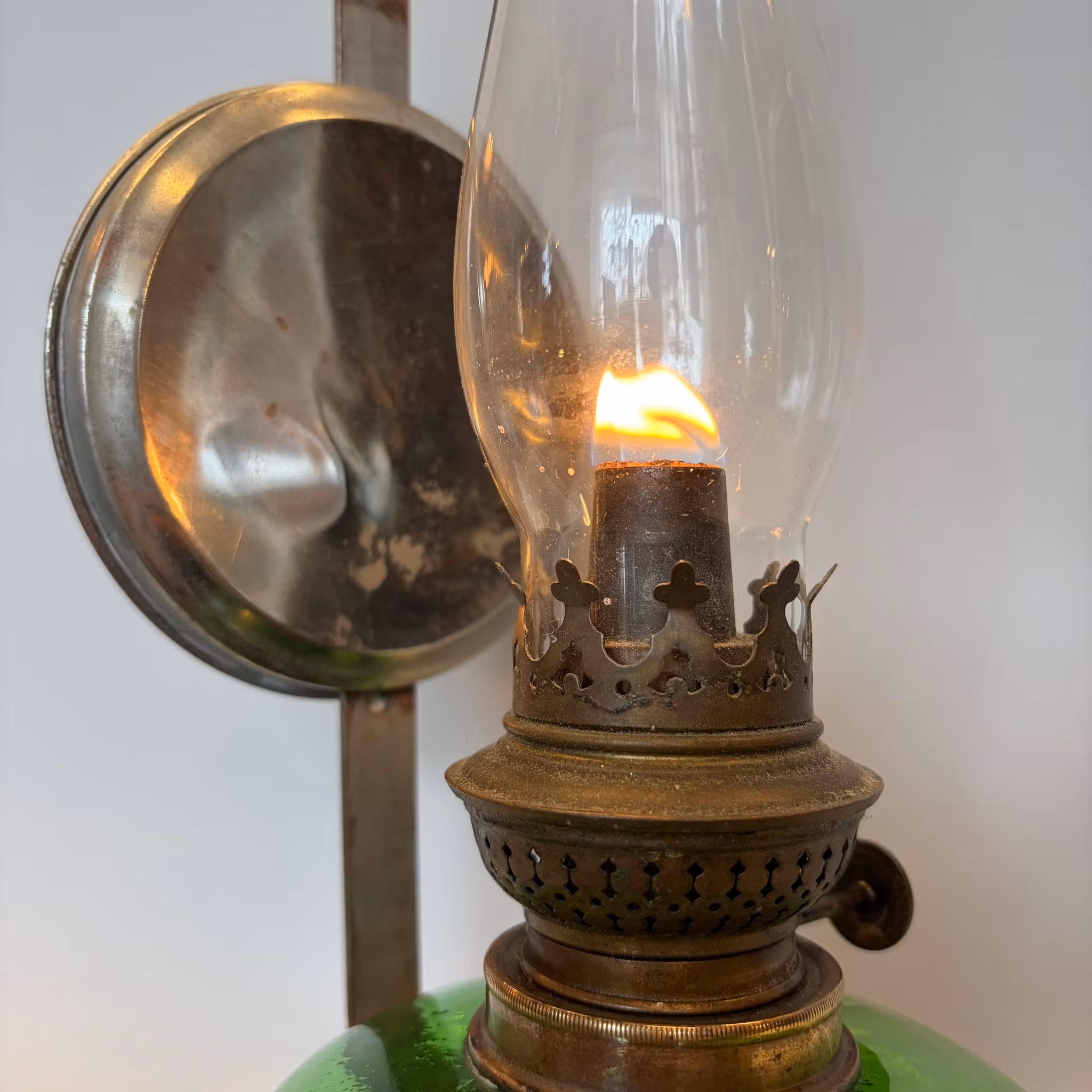 En snygg klassisk väggfotogenlampa i grönt glas med korgreflektor.