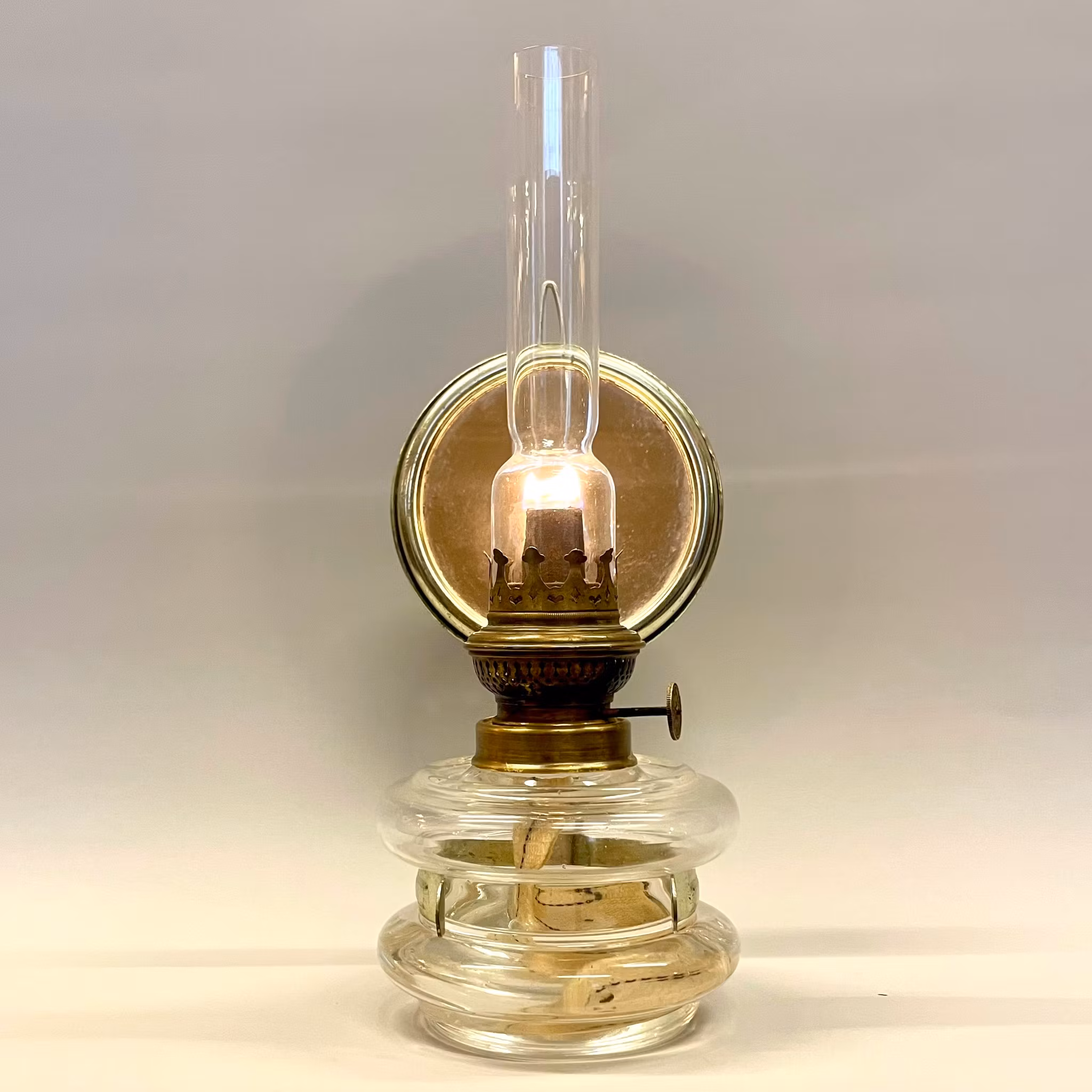En snygg klassisk väggfotogenlampa i glas med spegelreflektor.