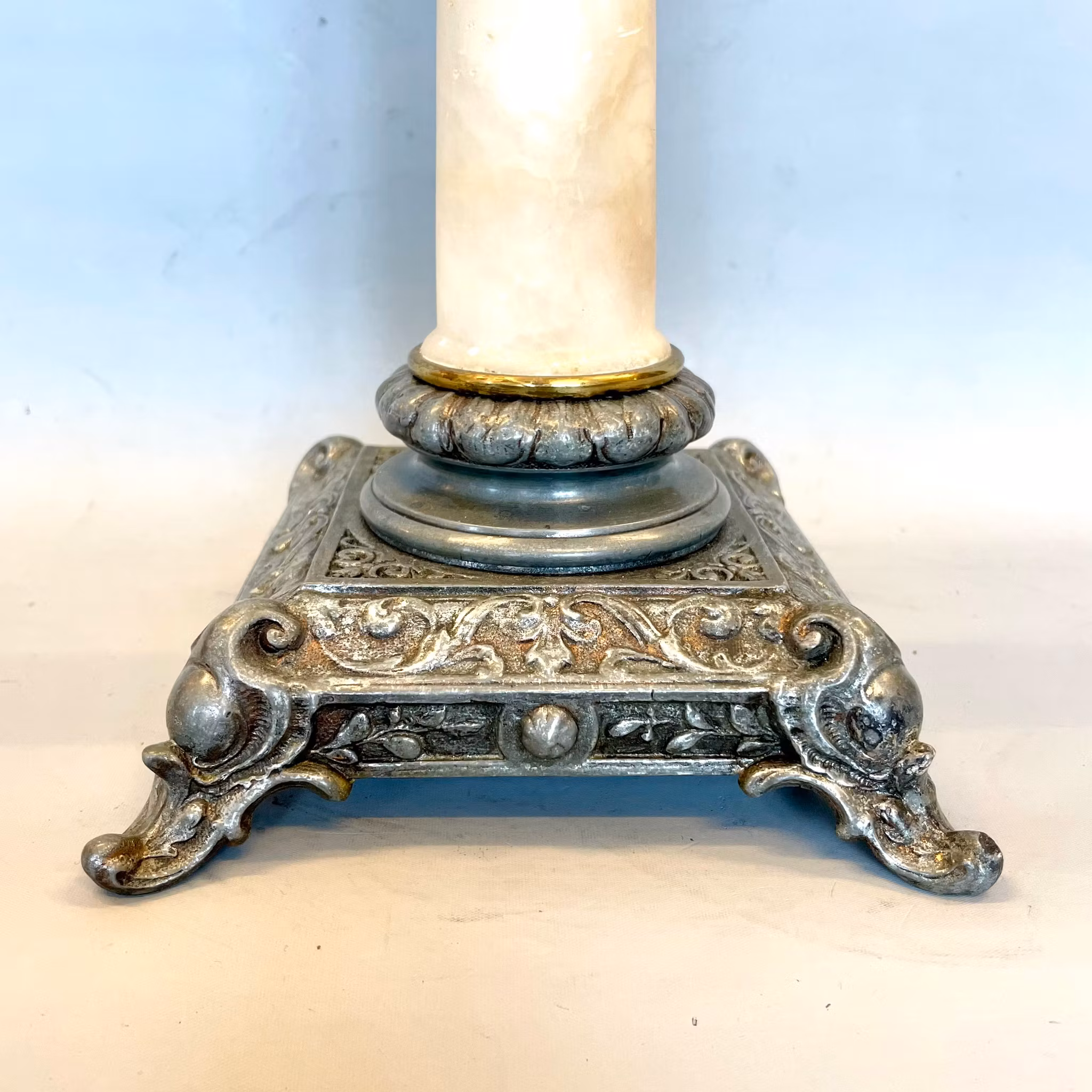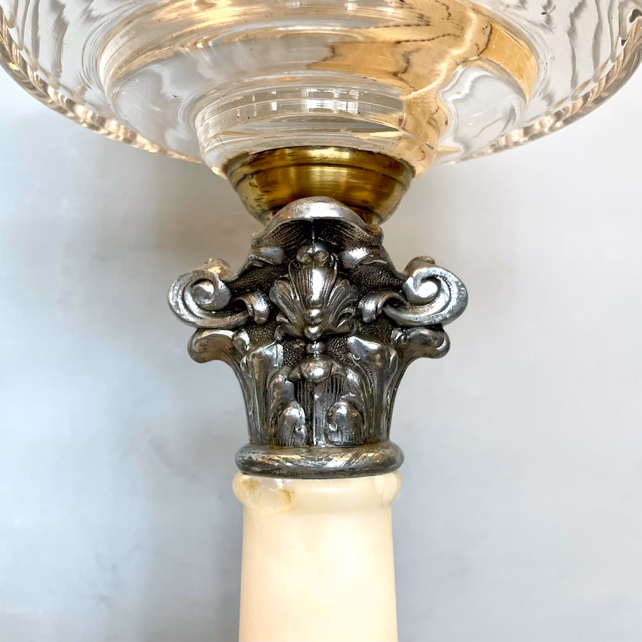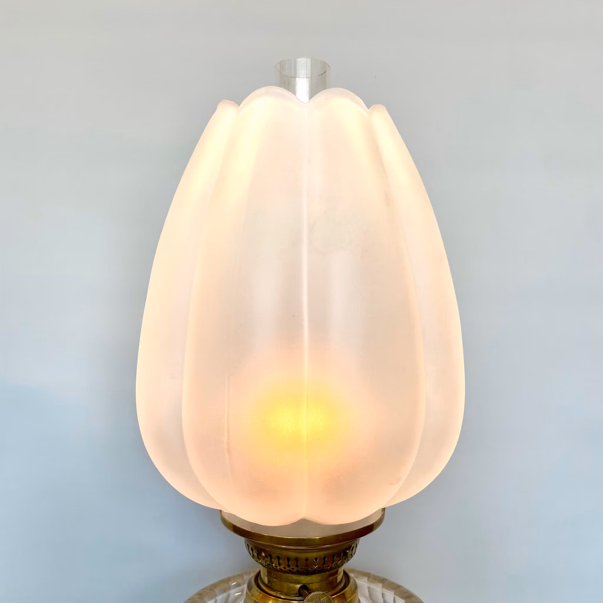 En antik fotogenlampa med slipat glasoljehus och hög vit piedestalfot i alabaster och snygg tulpankupa i frostat glas.