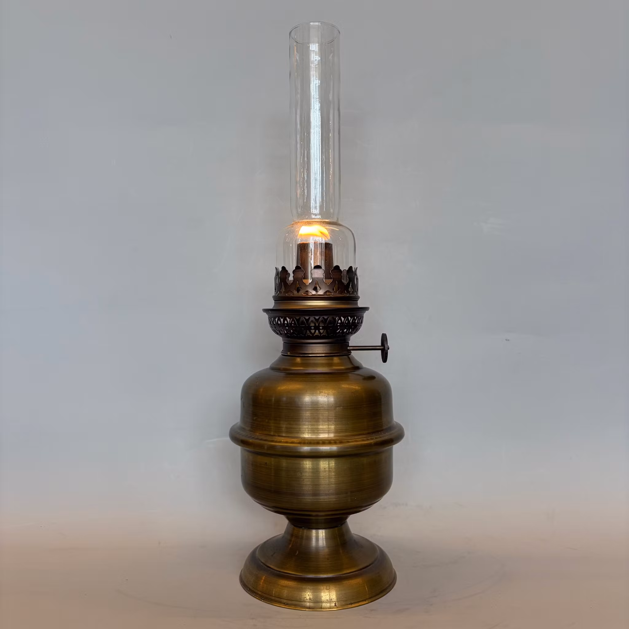 Enkel 14''' fotogenlampa i patinerad mässing. Fotens diameter är 10 cm och höjden 36cm. Den är relativt nytillverkad från franska lampfabriken Gaudard.