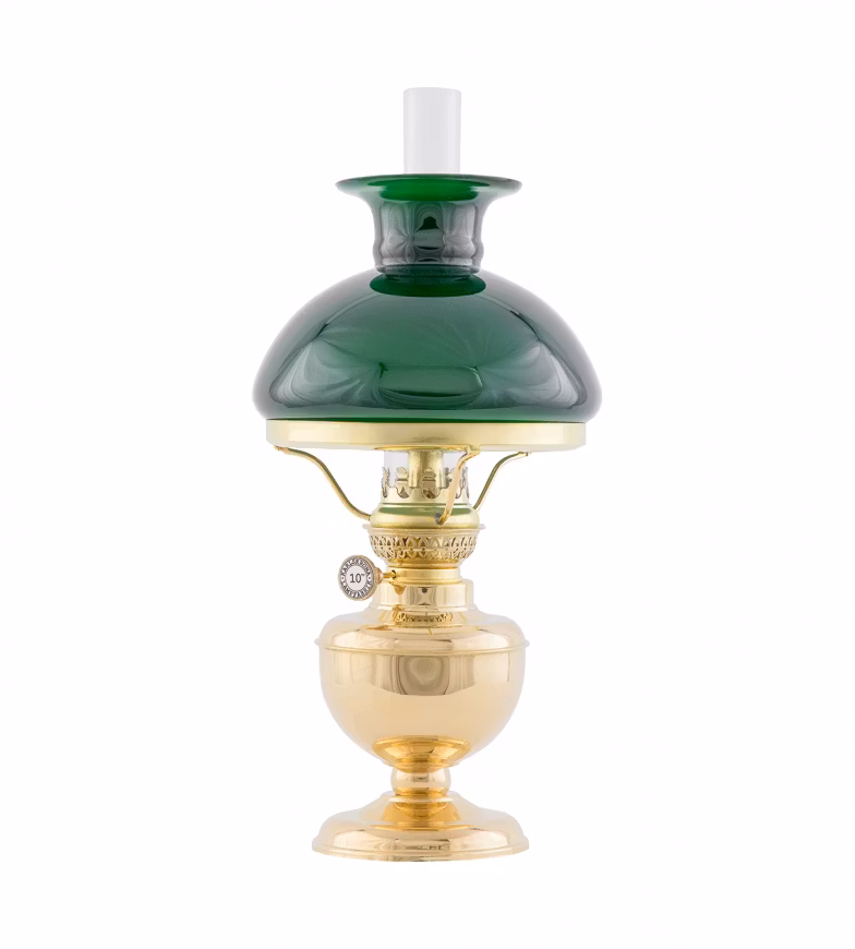 En klassisk bordsfotogenlampa i mässing med en 10'''(linjers) brännare och en 155 mm vestaskärm i mörkgrönt glas.