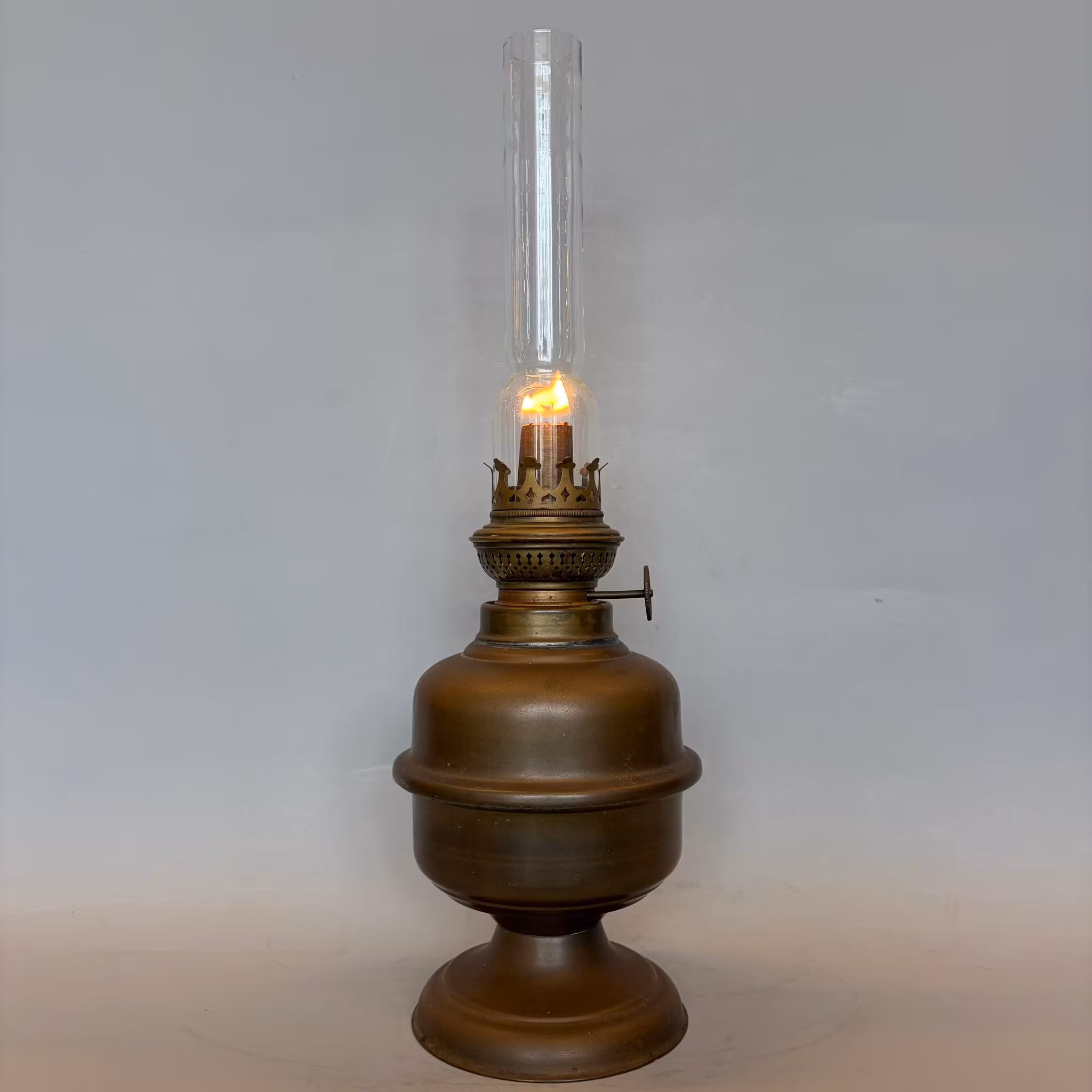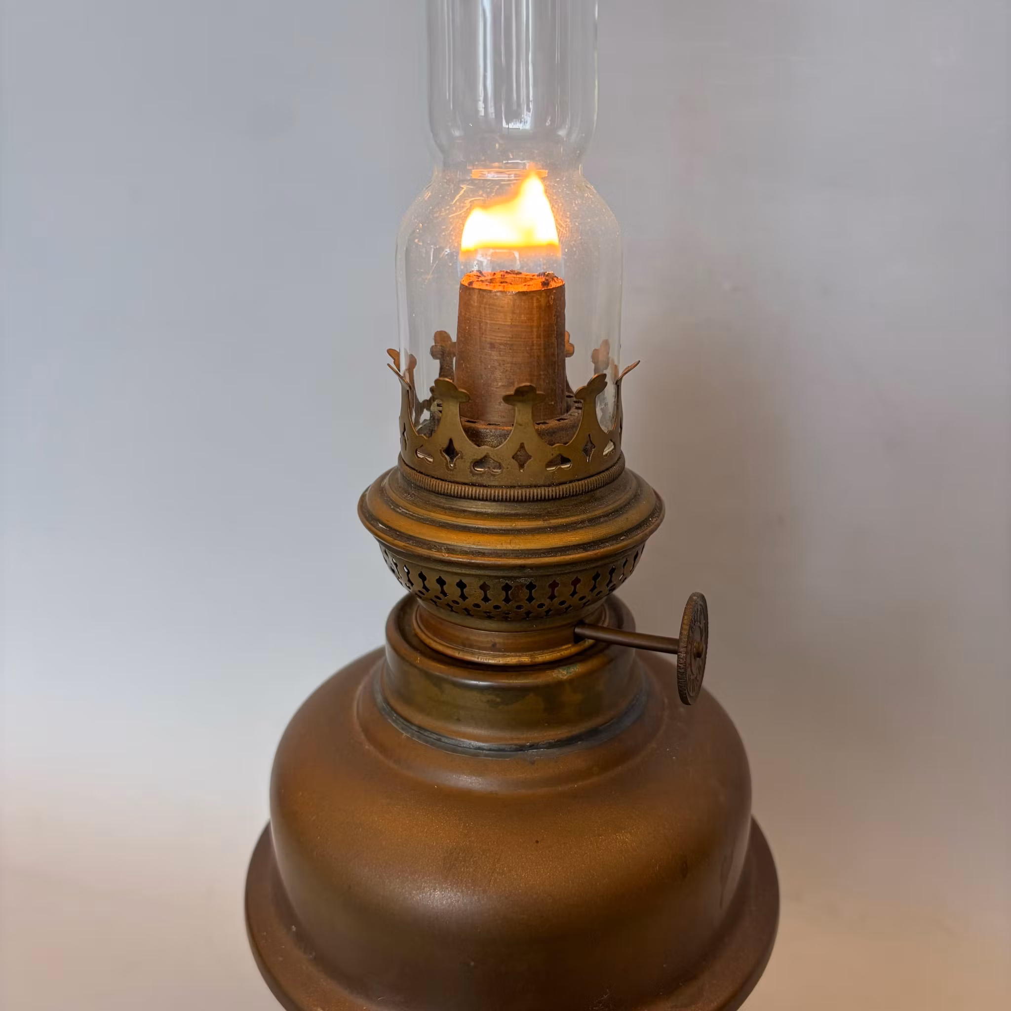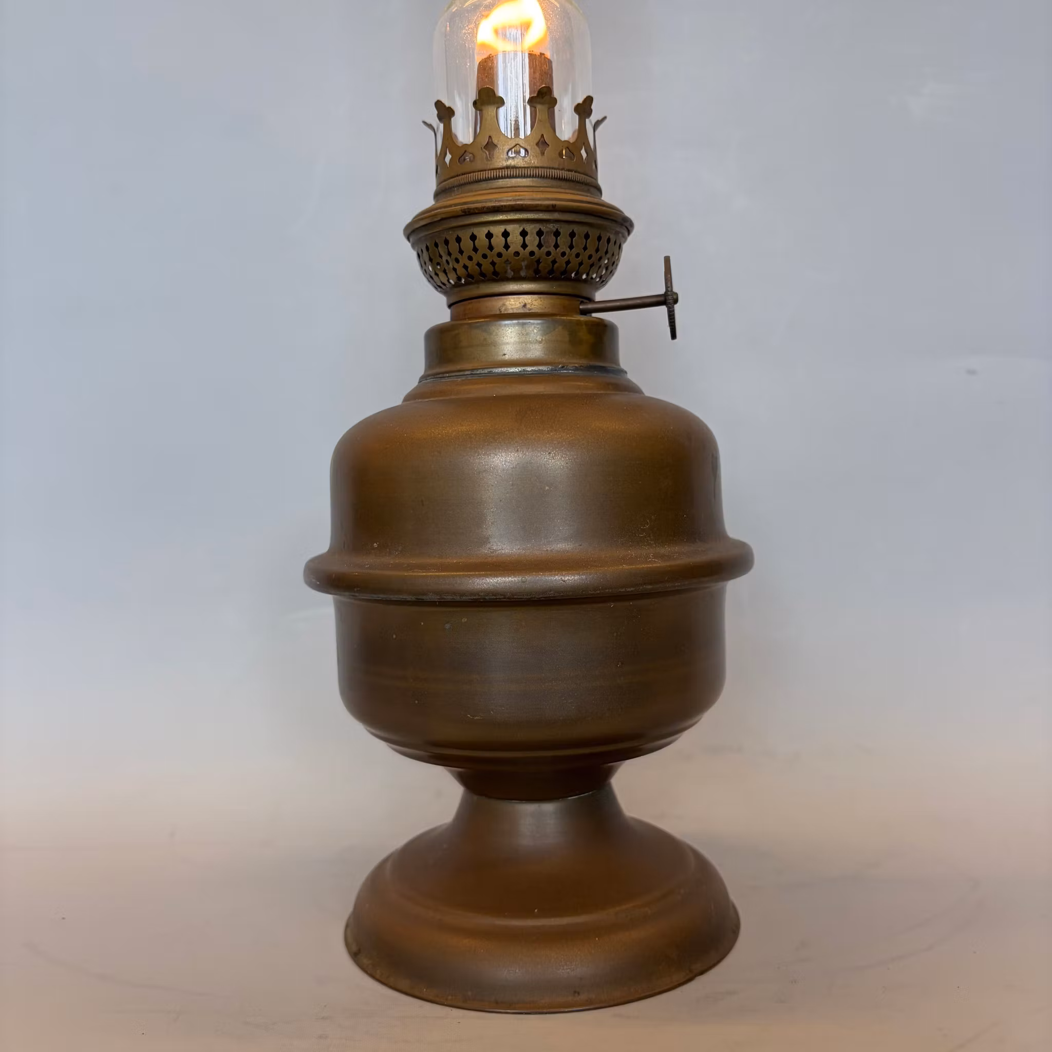 Enkel 10''' fotogenlampa i patinerad mässing. Fotens diameter är 10 cm och höjden 36cm. Den är relativt nytillverkad från franska lampfabriken Gaudard.