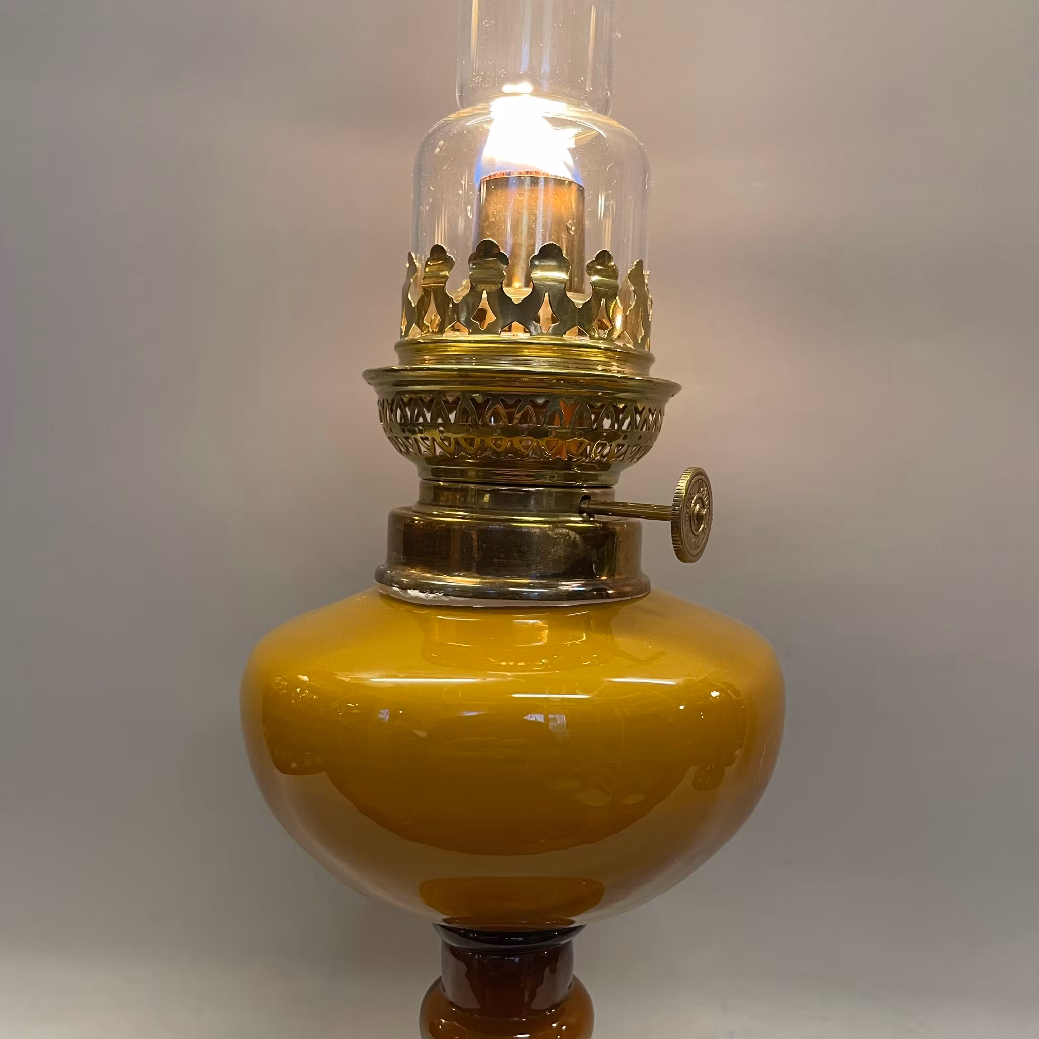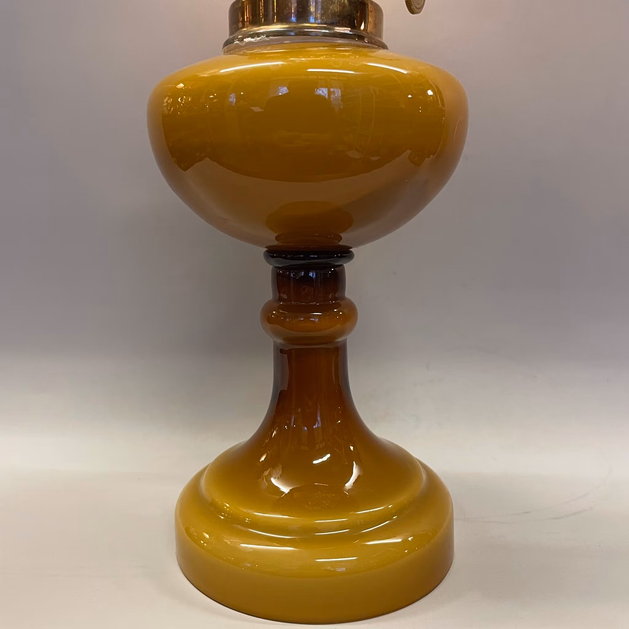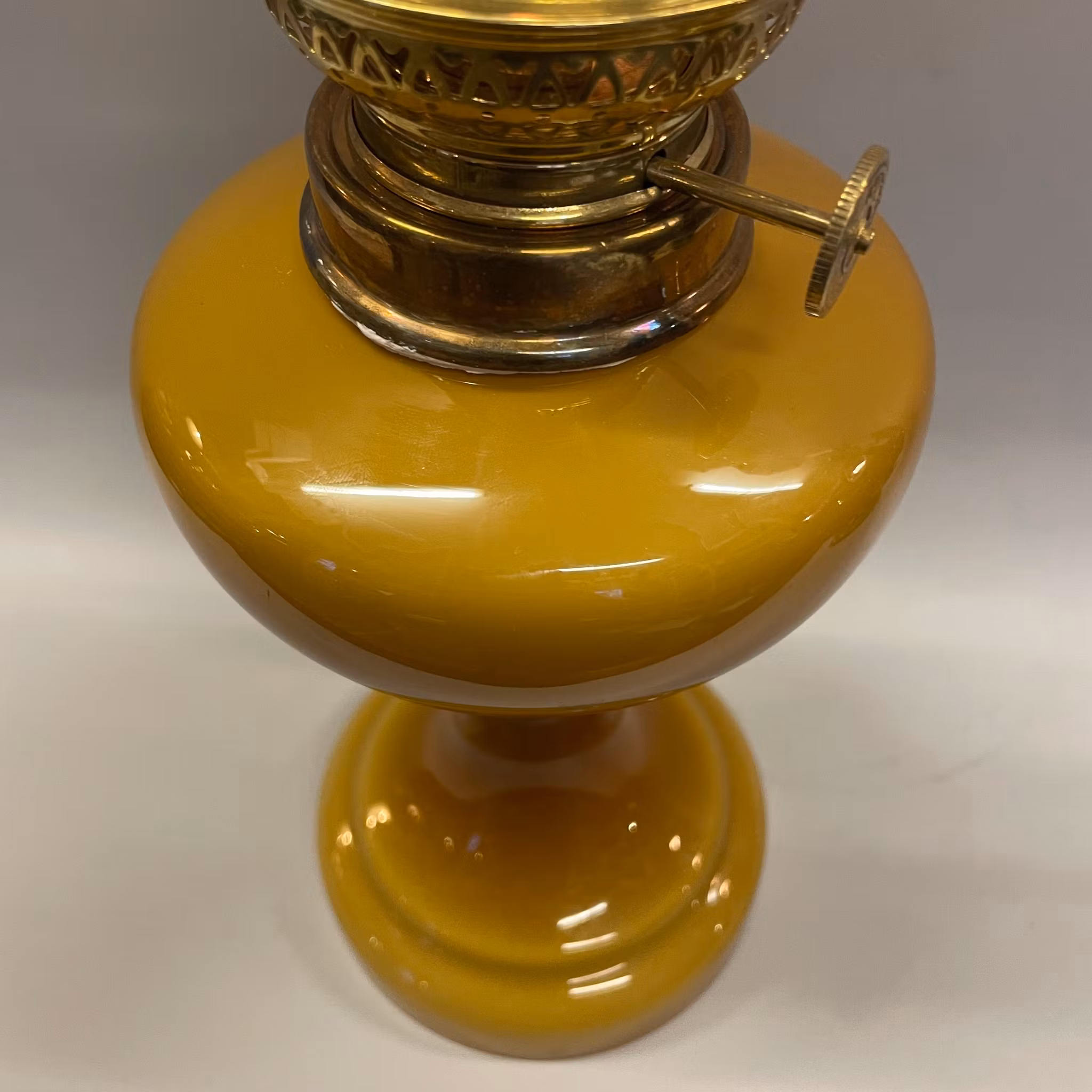 Det här är en annorlunda bordsfotogenlampa med ett äldre glasoljehus i senapsfärg. Vid fototillfället hade vi även en likadan fotogenlampa i olivgrönt.