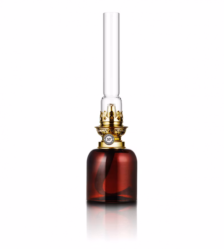 En klassisk mellanstor fotogenlampa med oljehus i mörkbrunt glas och en 10'''(linjers) brännare i polerad mässing.