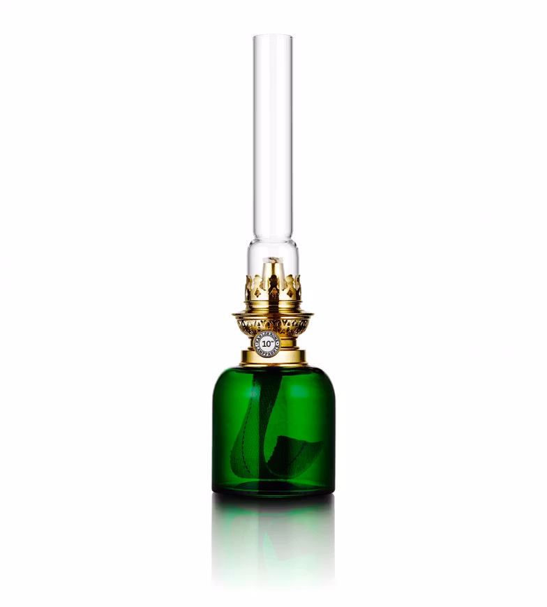 En klassisk mellanstor fotogenlampa med oljehus i mörkgrönt glas och en 10'''(linjers) brännare i polerad mässing.