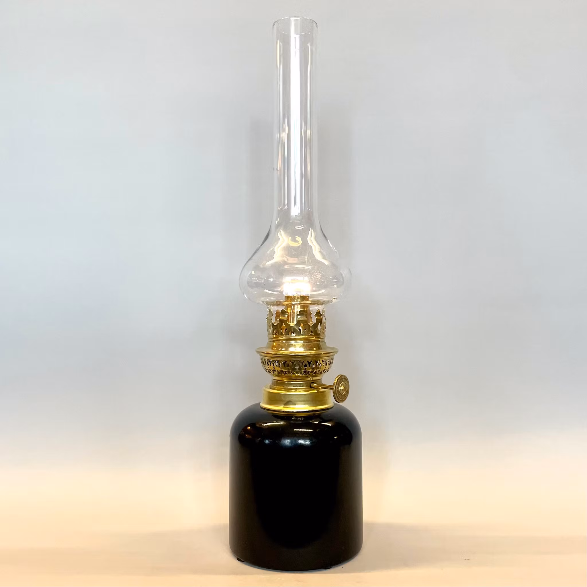 En klassisk mellanstor fotogenlampa med oljehus i svart glas och en 10'''(linjers) brännare i polerad mässing.