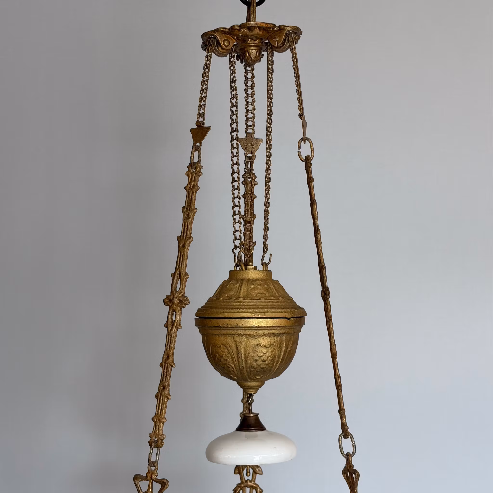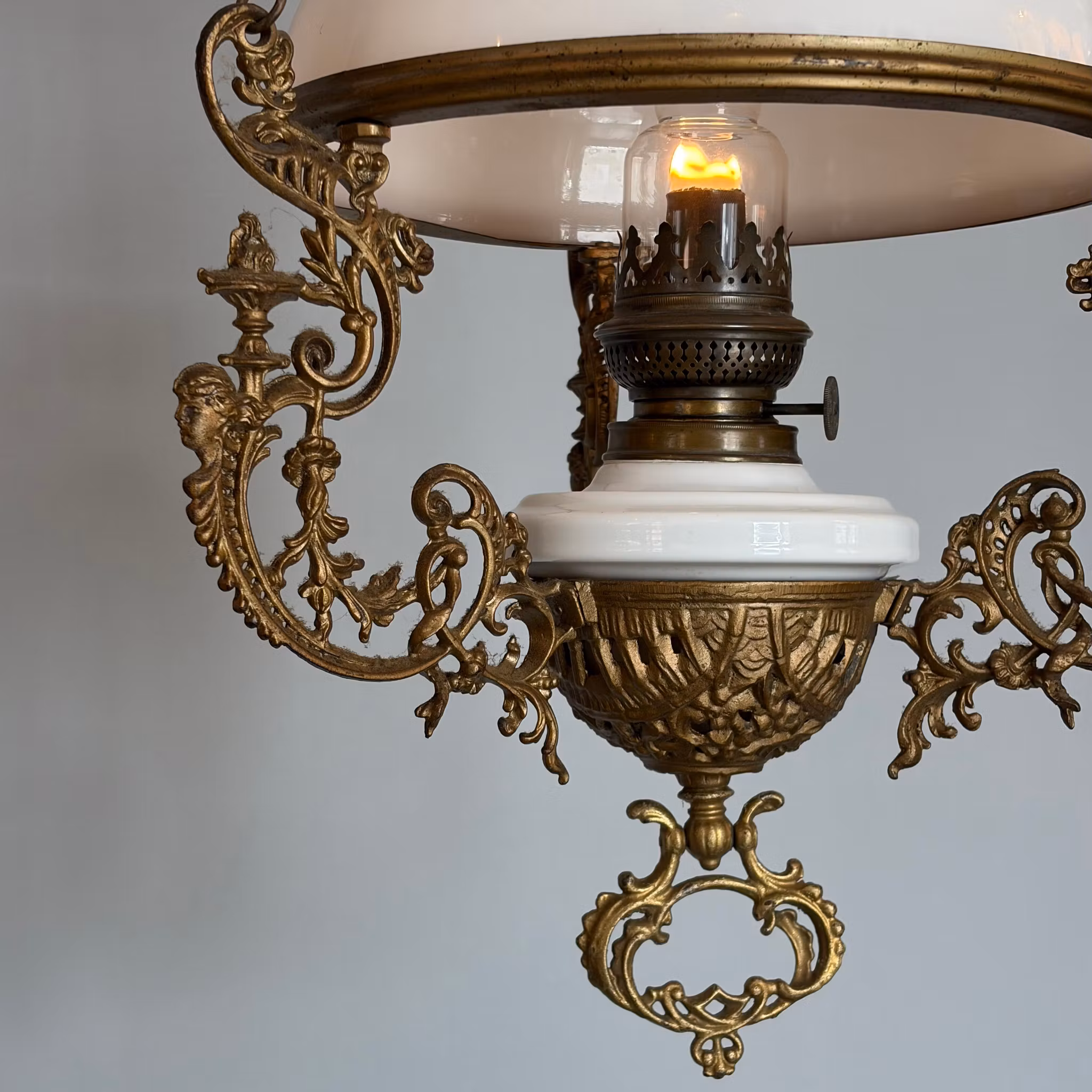 En äldre klassisk takfotogenlampa i bronsmålat gjutjärn med opalvitt korgoljehus och en 14'''(linjers) brännare i mässing. Snygg vit rochesterskärm, 28 cm i nedre fattning.