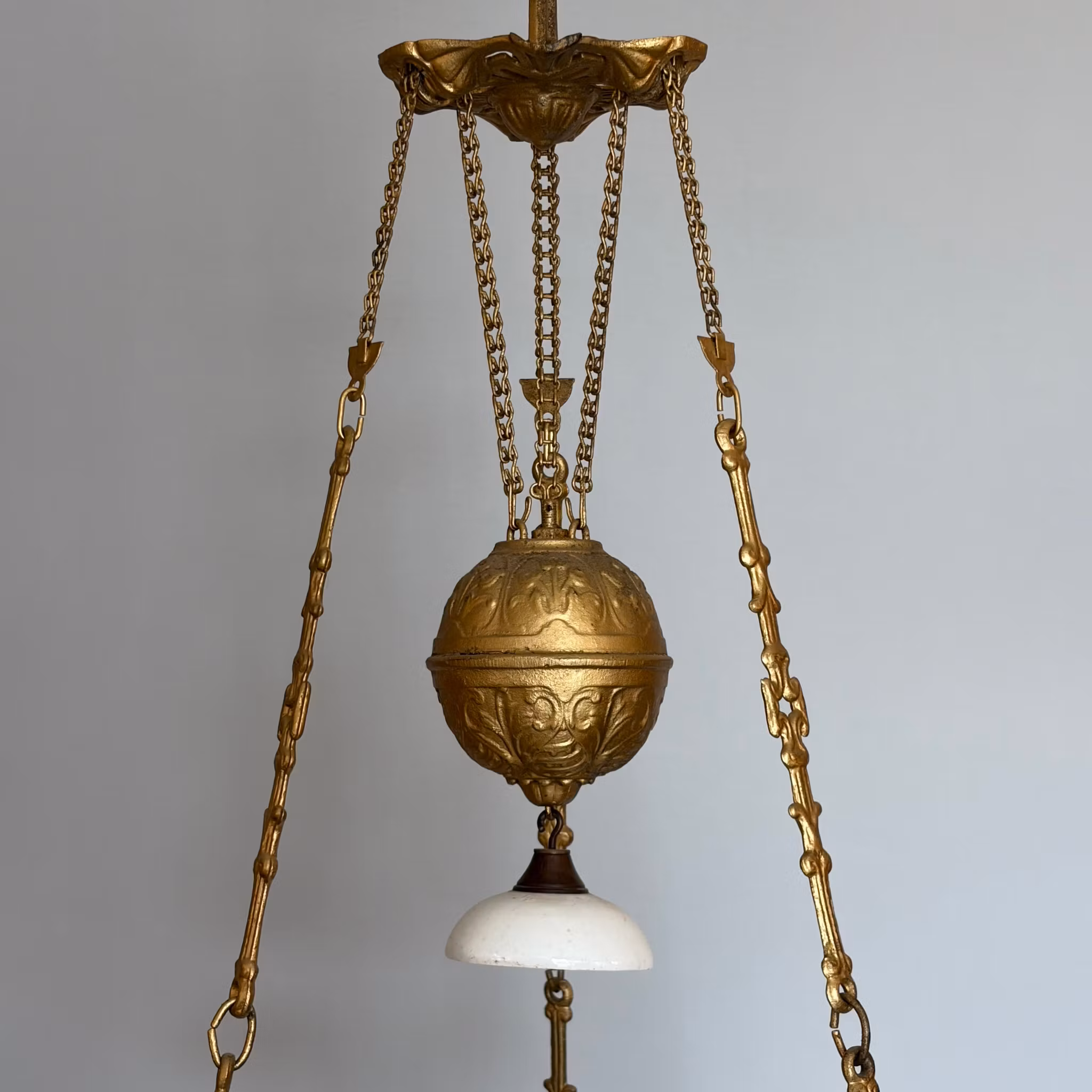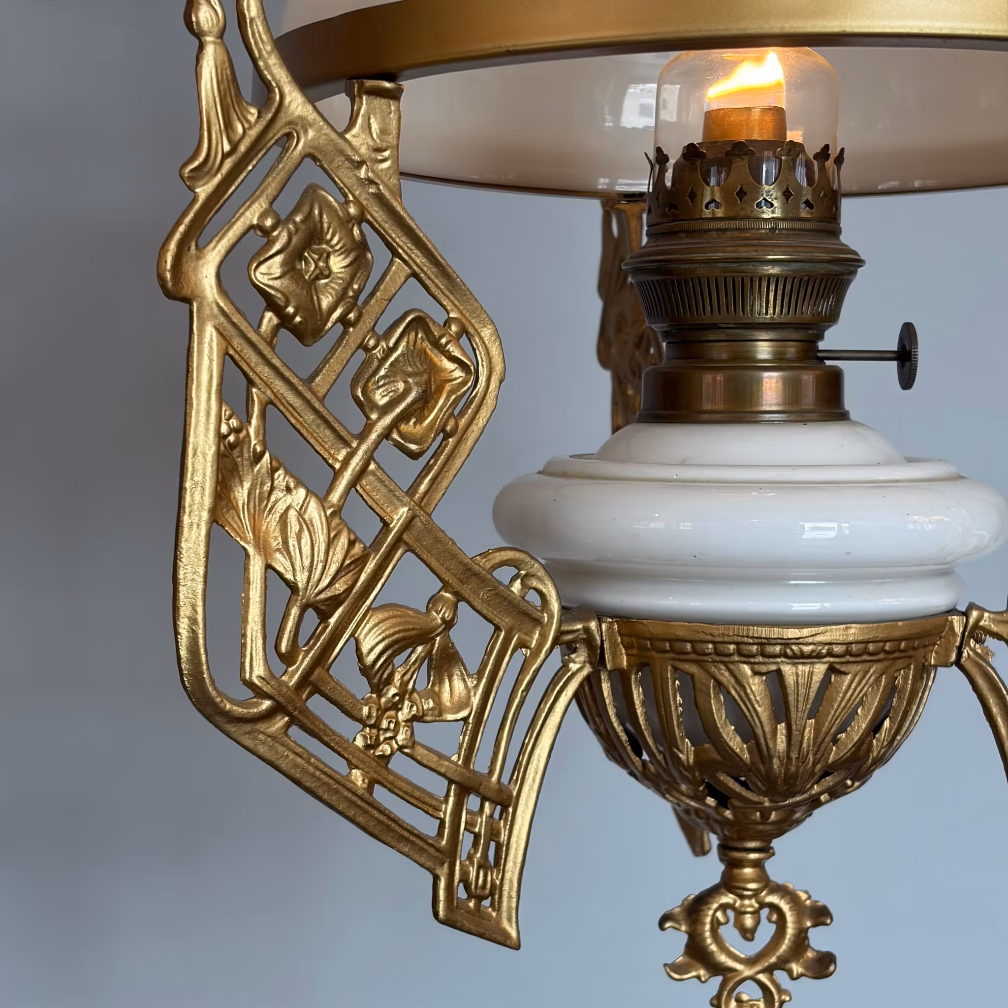 En äldre klassisk takfotogenlampa i guldmålat gjutjärn med opalvitt korgoljehus och en 14'''(linjers) brännare i mässing. Snygg vit rochesterskärm, 28 cm i nedre fattning. OBS: Ett nagg i övre delen av kragen på den vita skärmen, enligt sista bilden.