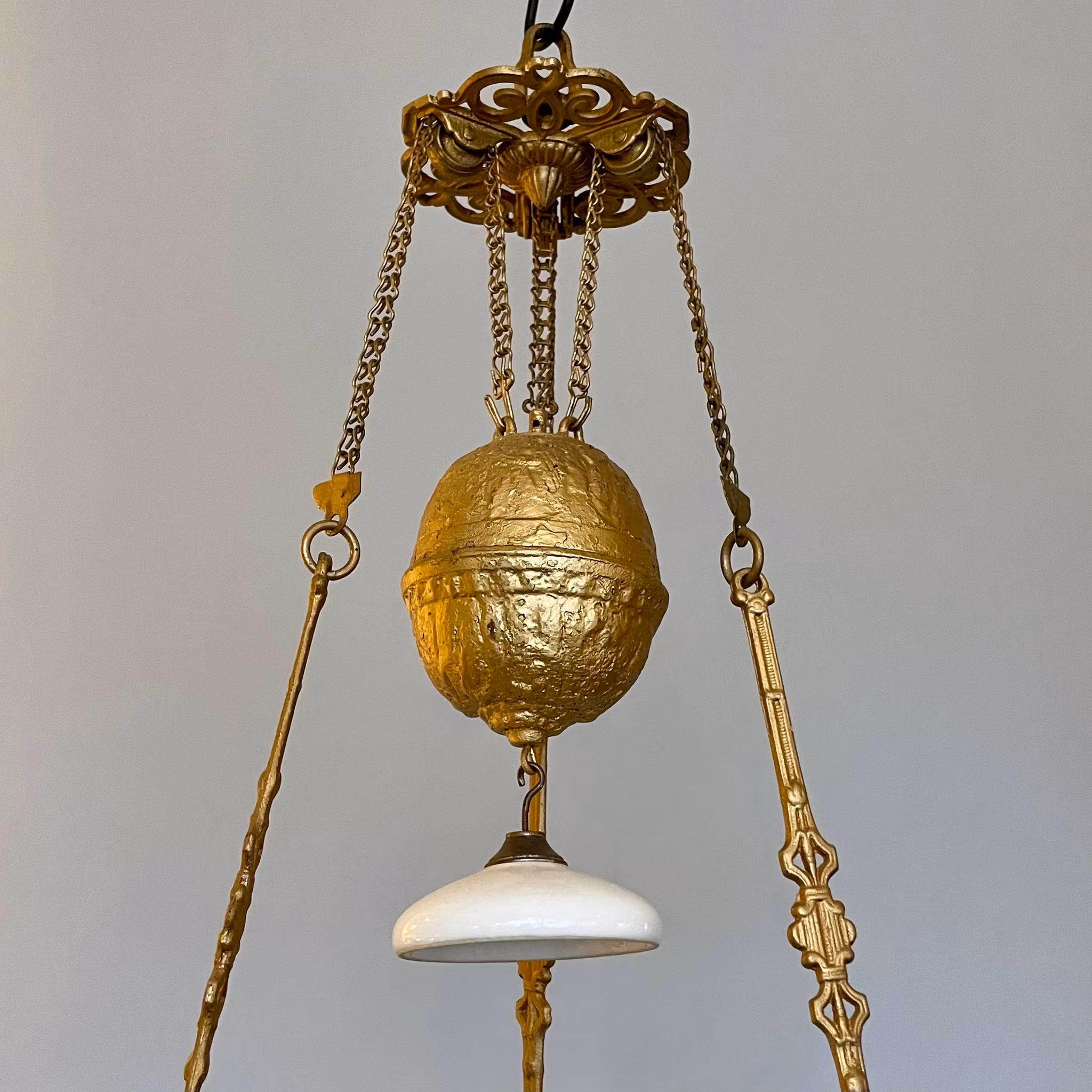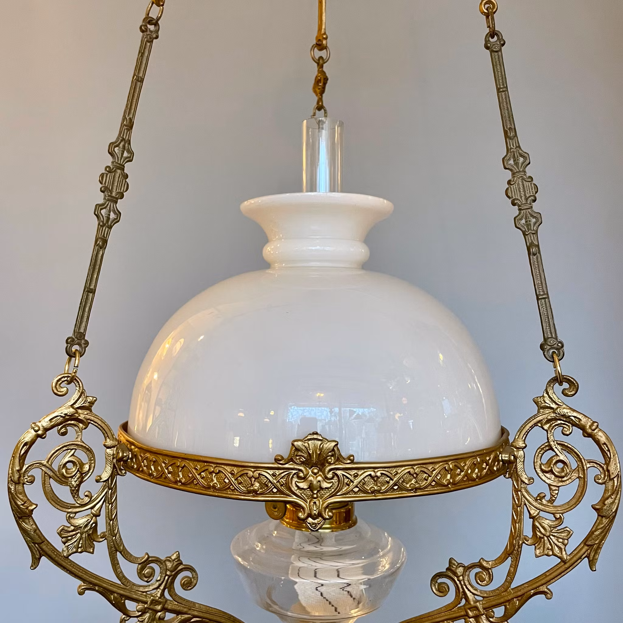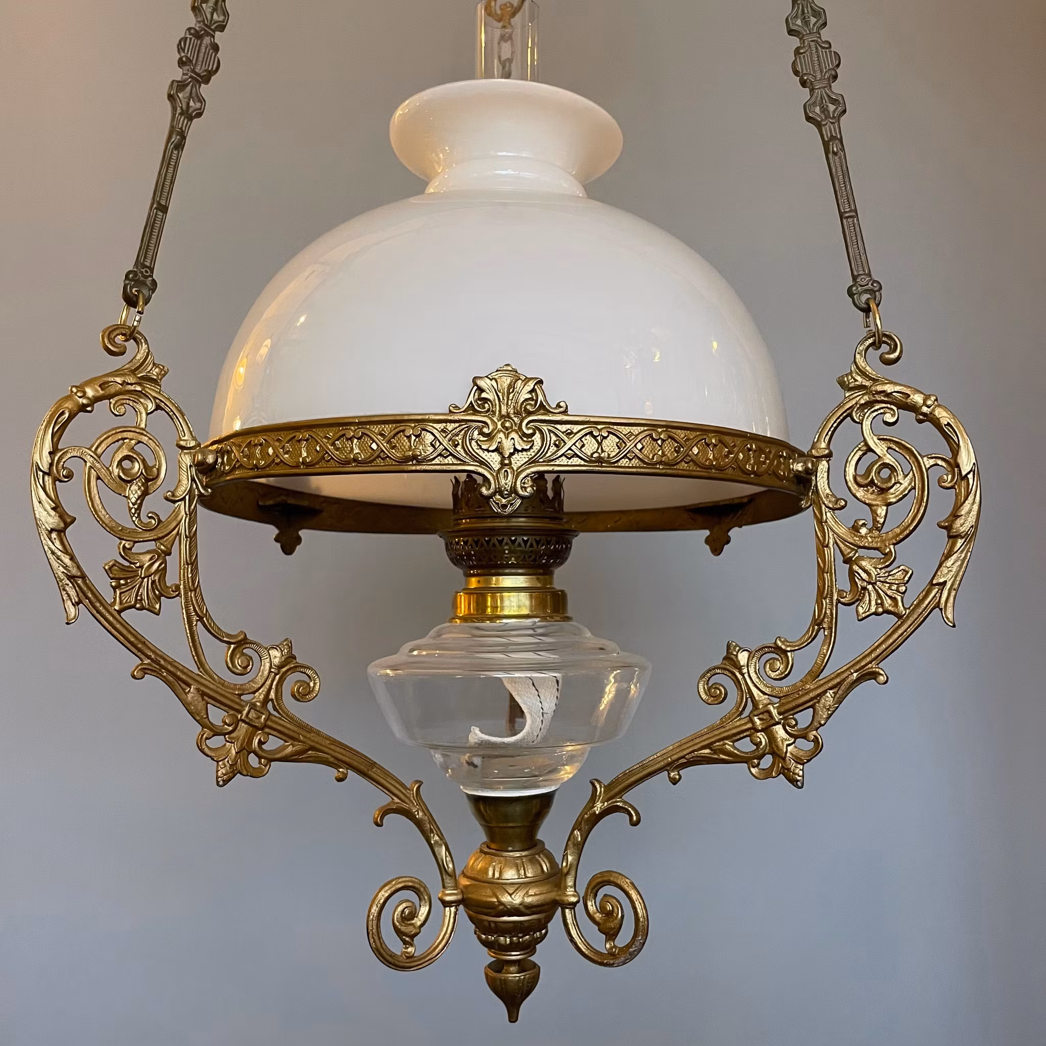 En äldre lite ovanlig takfotogenlampa i guldmålat gjutjärn medglasklart tappoljehus och en 14'''(linjers) brännare i mässing. En häftig skärmring som håller en 280 mm rochesterskärm.