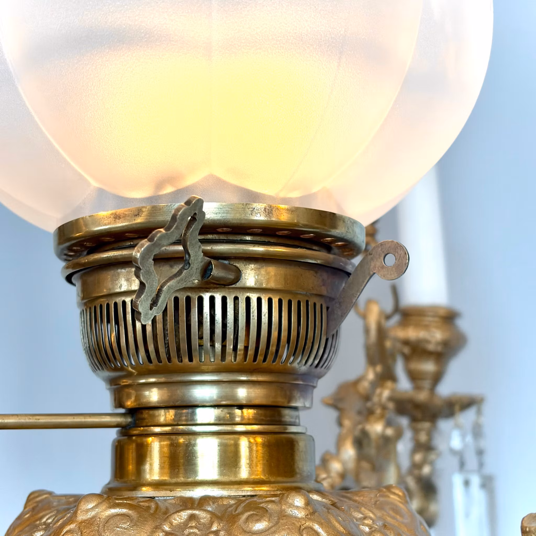 En sällsynt antik takfotogenlampa i mässing och gjutjärn. 20'''(linjers) Freya-brännare i mässing. Snygg frostad nytillverkad tulpankupa med mönster. Brännaren har en lyftspak så den är enkel att tända och släcka utan att behöva vidröra de heta glasen. Armar i guldmålat gjutjärn med plats för 3 stearinljus och oscarianska prismor.
