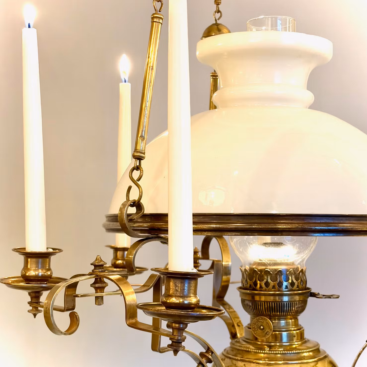 En fantastisk antik taklampa från vår egen kollektion av fotogenlampor ifrån Arvid Böhlmarks Lampfabrik i Stockholm. Fotogenlampan har modellnummer 1611 i fabrikskatalogen från 1909. Den har tre stycken dubbla ljusarmar för totalt 6 stearinljus. Den här lampan har en vacker antik rochesterskärm i opalvitt glas. Lampan kostade 38 kr och 32 öre i priskuranten för år 1909 enligt katalogbild.