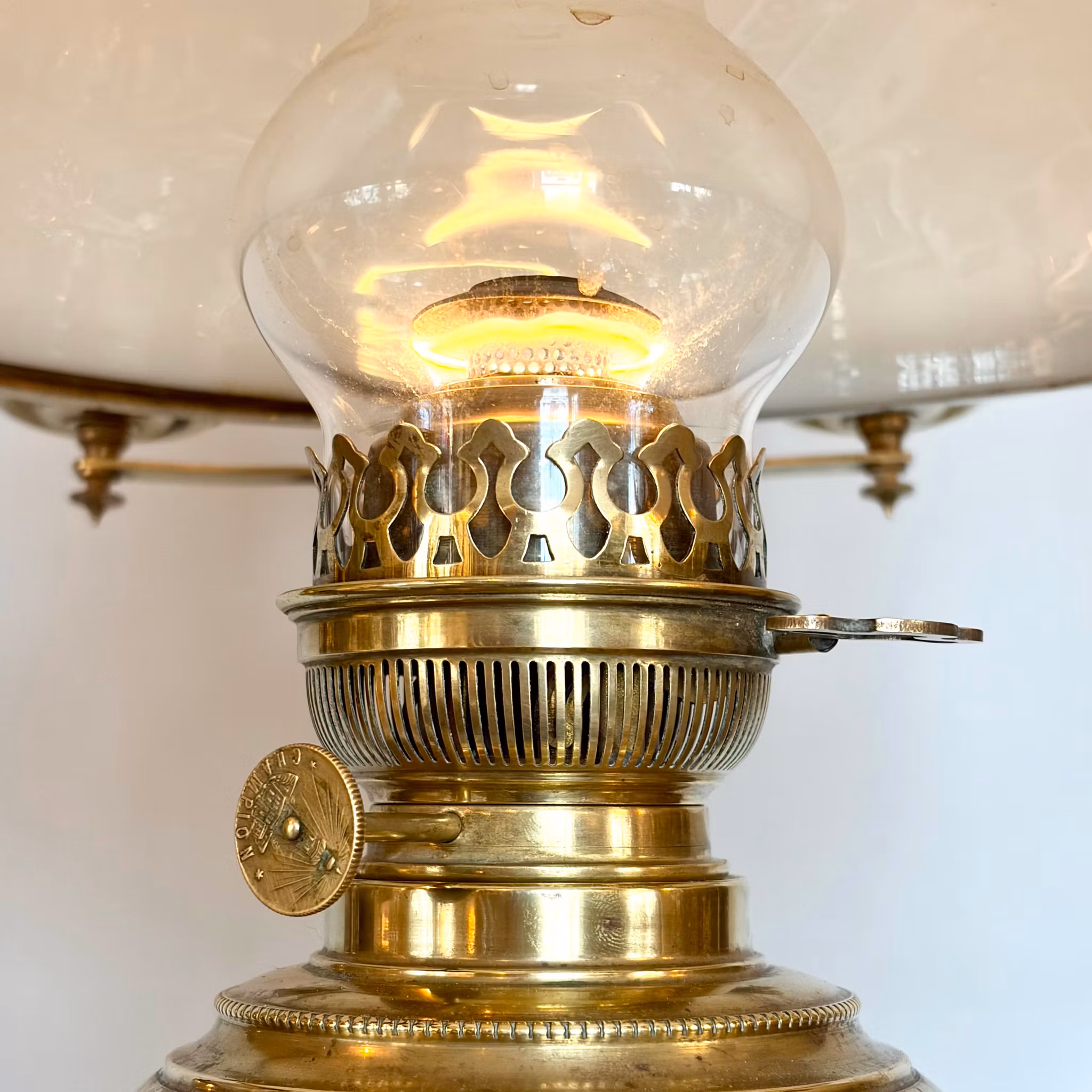 Fotogenlampa med 20''' Champion-brännare i polerad mässing som ger mycket ljus och värme, samt med lyftnyckel så man inte behöver vidröra glasen när man tänder eller släcker - väldigt smidigt och bekvämt.