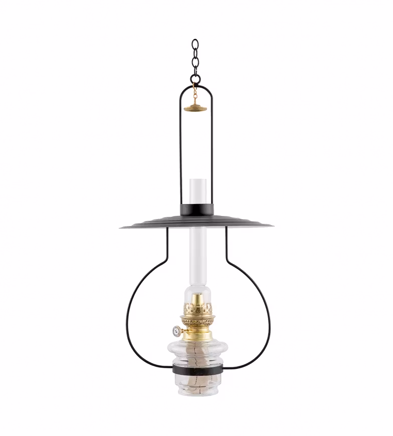 En klassisk takfotogenlampa med oljehus i glas och en 14'''(linjers) brännare i mässing. Skärm och ställning i svartmålad plåt.