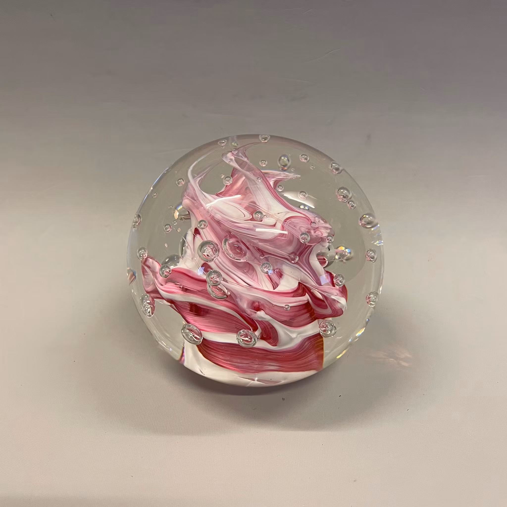 Glasklot som väger över 1 kg. Glasklart med en spännande virvlande rosa/vit form i mitten.