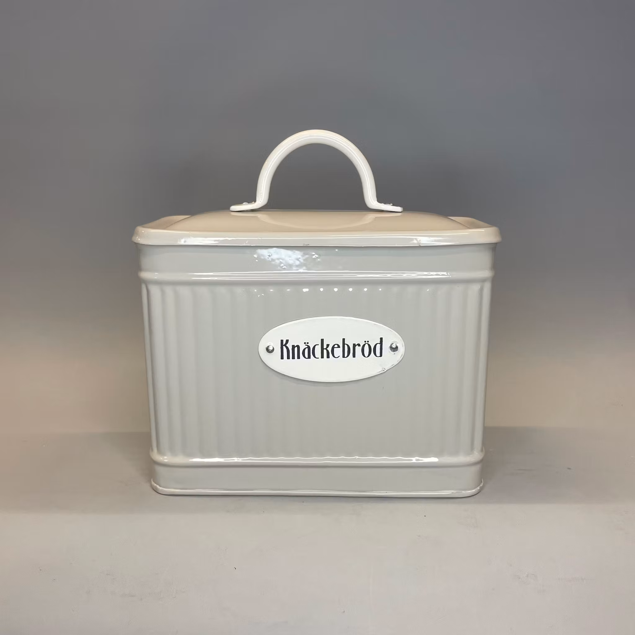 Vacker plåtburk som passar utmärkt till ett paket klassiskt knäckebröd med lock i målad plåt med vitt motiv på beige ribbad botten. Praktisk smulsamlare och dekorativ att ställa fram på bordet eller buffén.