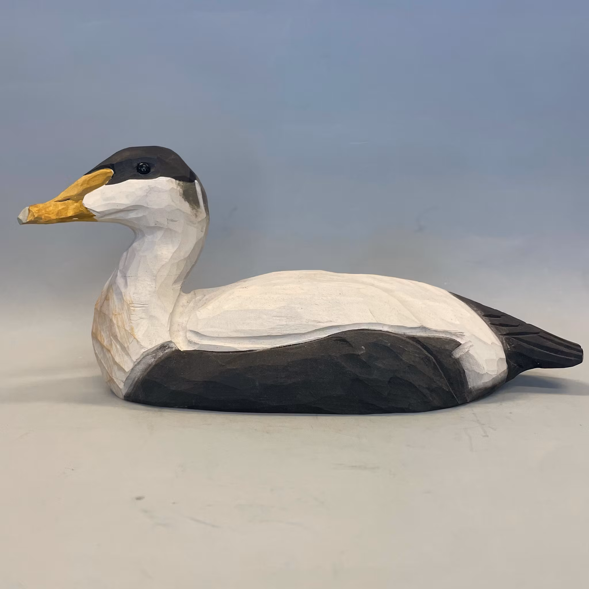 Träfågel: Ejder 495 kr Produkten är tyvärr slut i lager. :( Artikelnummer: P119 Dela Information Väldigt naturtroget träsnideri i form av en simmande ejder.Längd cirka 28 cm.