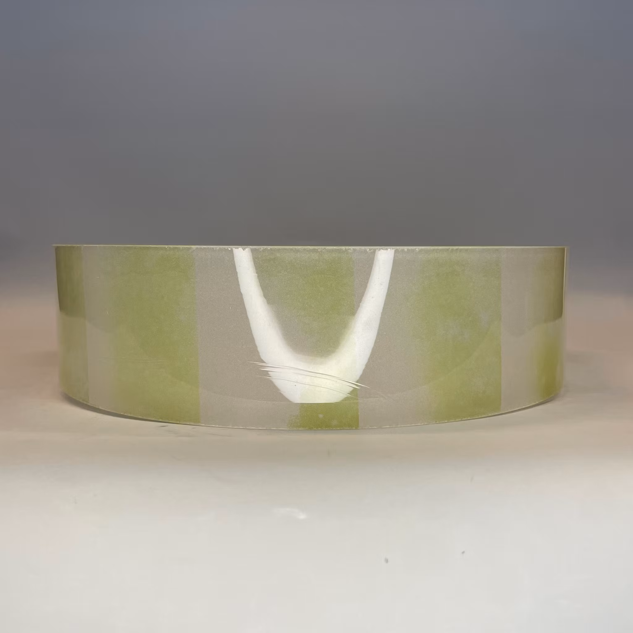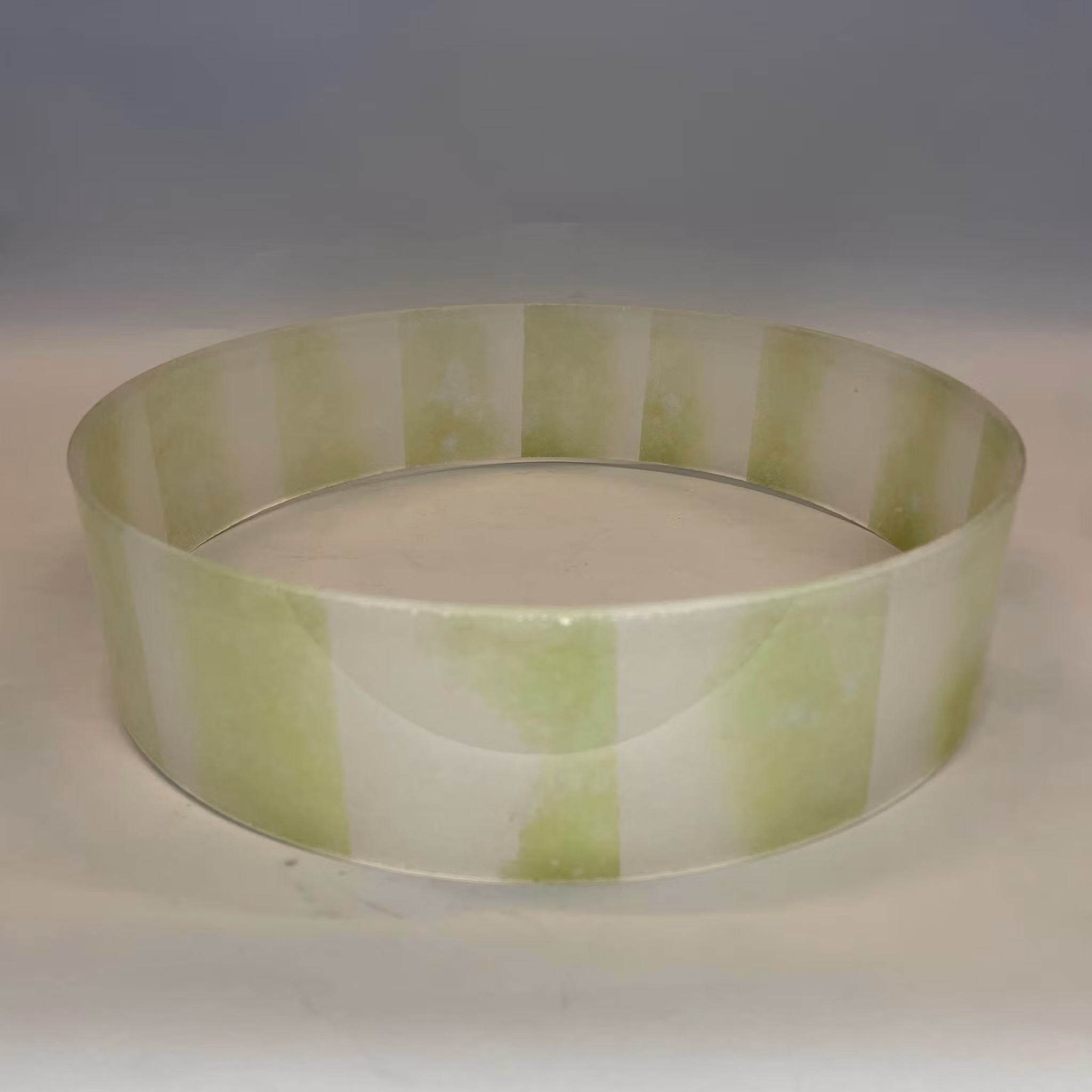 Denna plafondskärm har den nedre yttre diameter 258 mm och höjd cirka 64 mm.Den går i gröntonat glas med ränder i kanterna och det finns en matchande glasringscylinder till denna. Ett par för t.ex. en snygg 30-tals taklampa.
