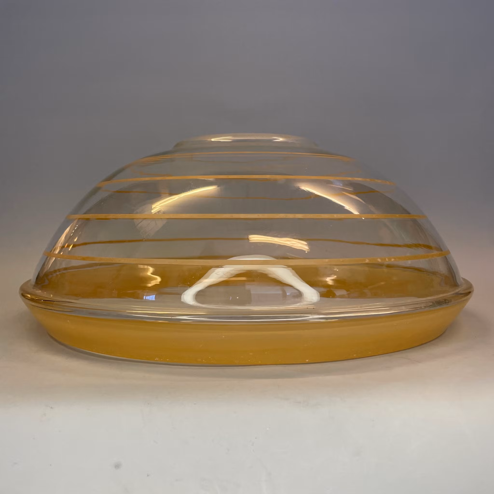 Den är tillverkad i klart glas med senapsfärgade streck och ränder.