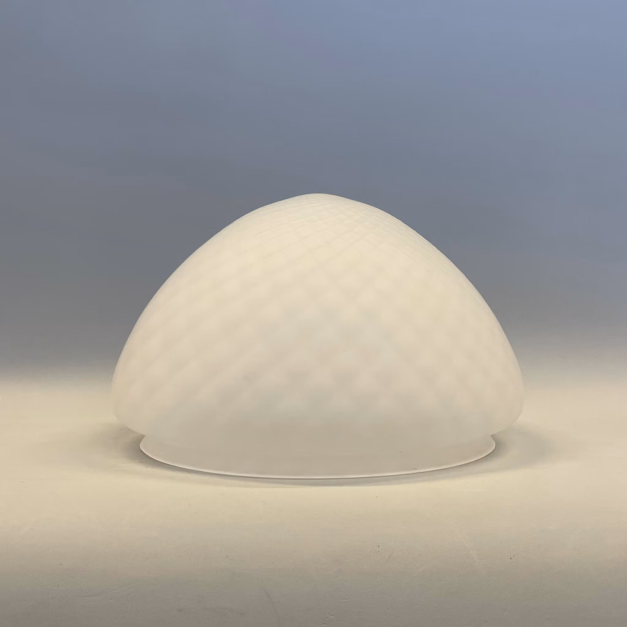 Denna Strindbergskupa/ampelskärm är frostad i ett optiskt rutmönster. Den har den nedre fattningen diameter 198 mm och är därför anpassad för skärmringar med en inre diameter på 200 mm.