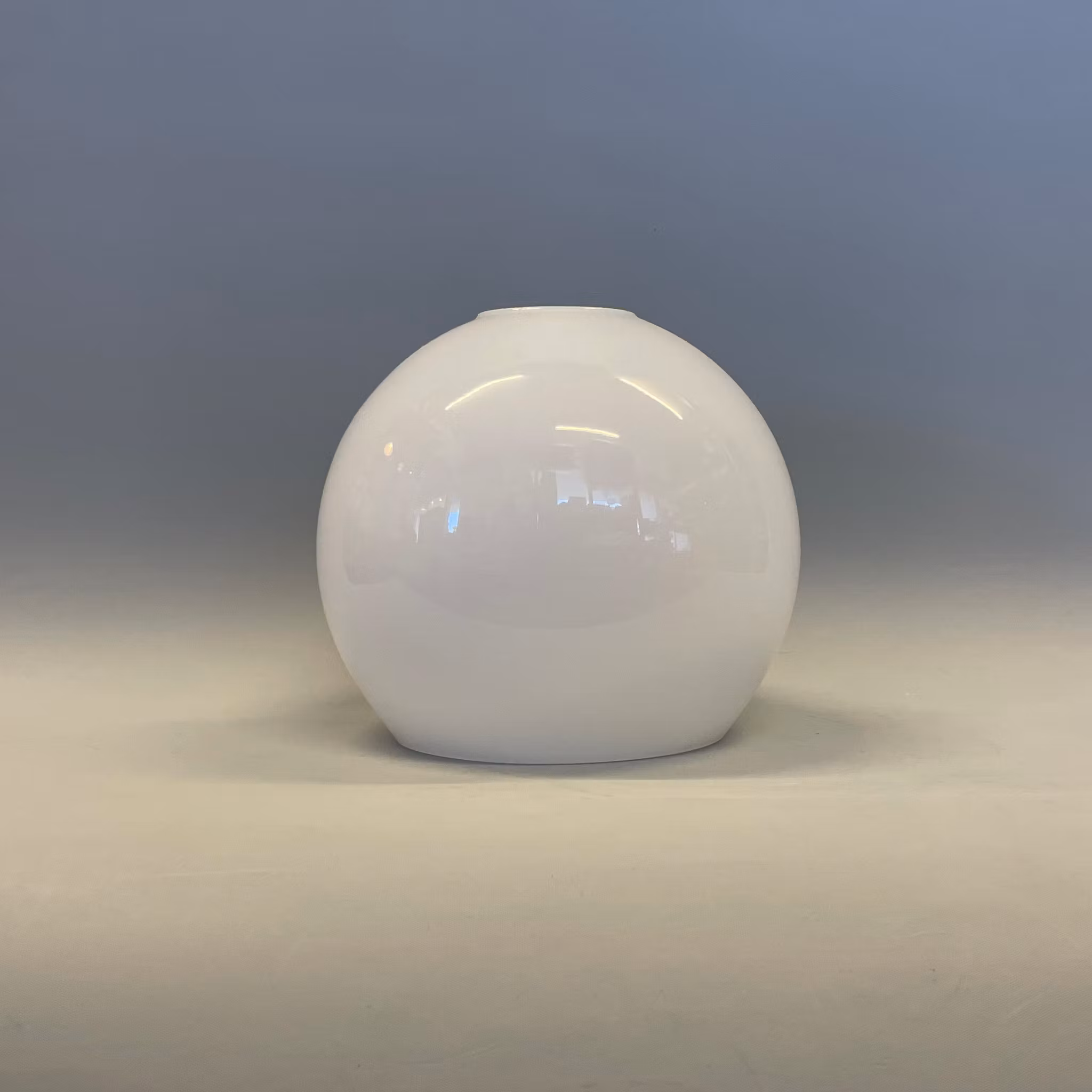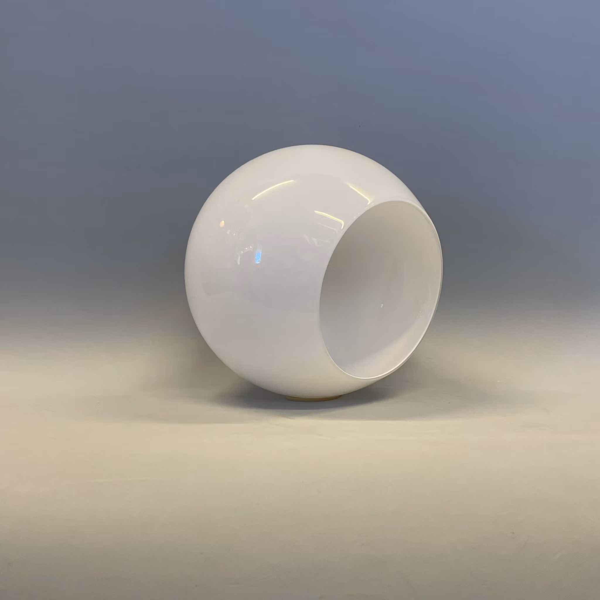 Den här skärmen är tillverkad i opalvit blankt glas. Skärmens diameter är cirka 160 mm. Den har två hål: det lilla är cirka 47 mm och det större är cirka 104 mm.