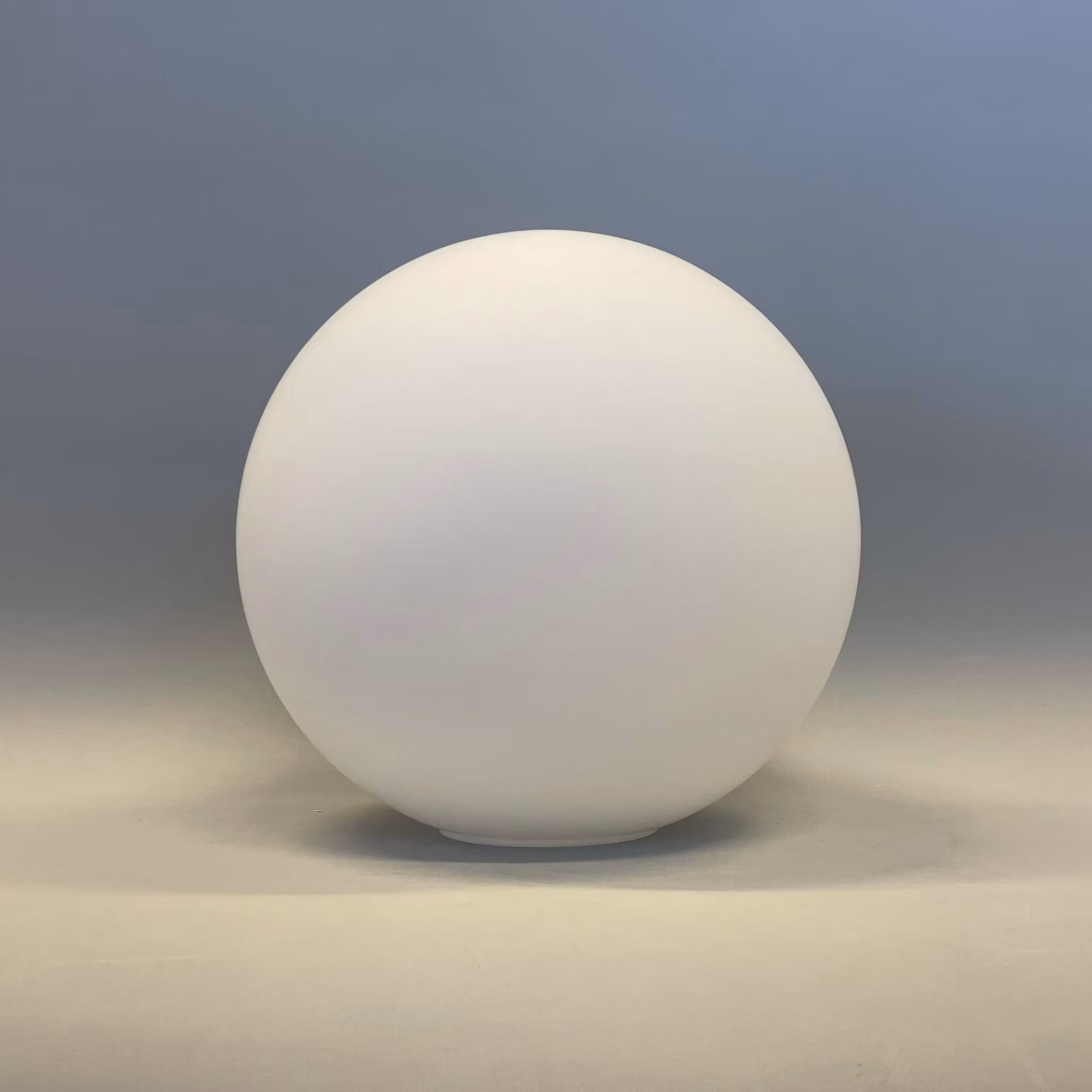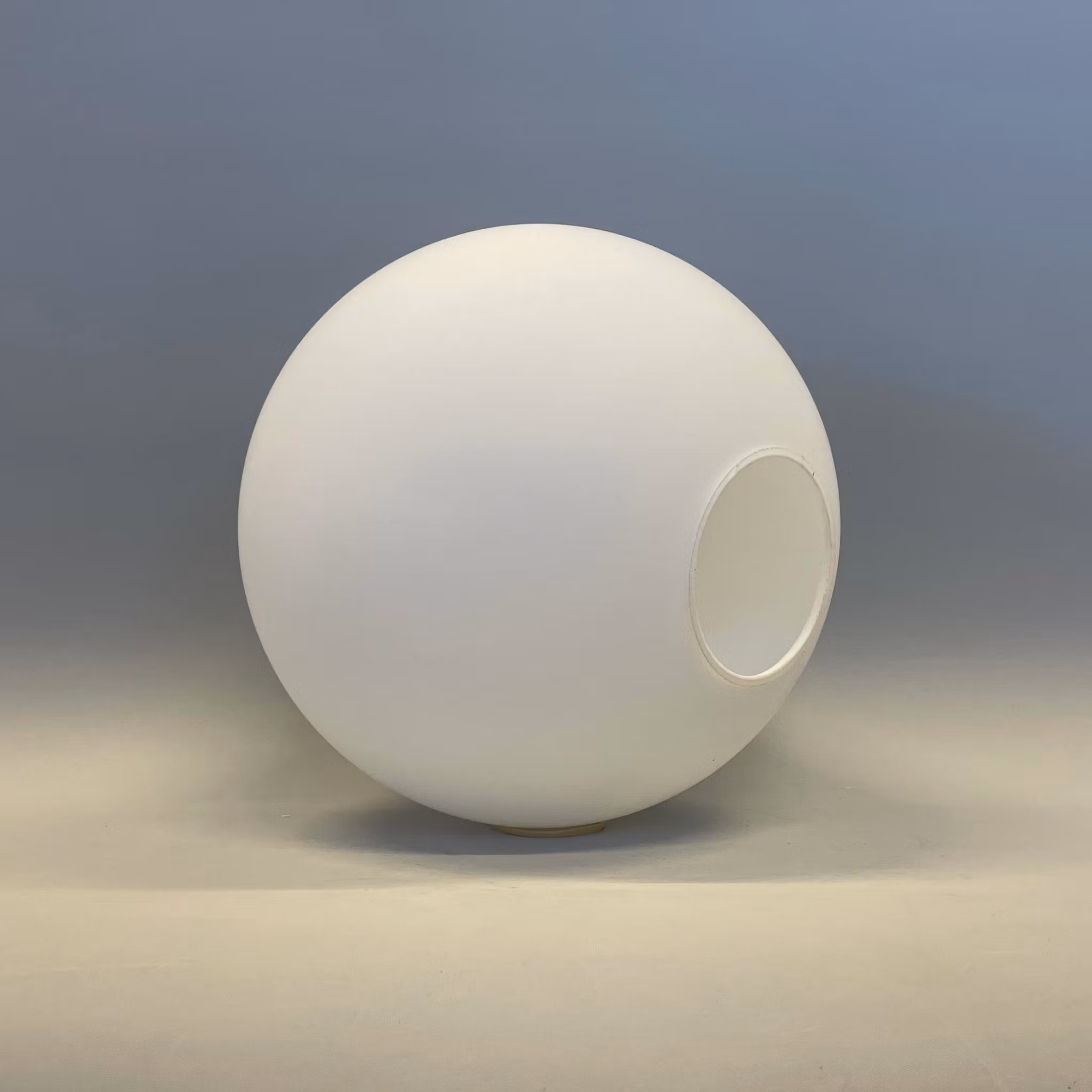 Den här skärmen är tillverkad i opalvit matt glas. Skärmens diameter är cirka 200 mm. Den har ett ca 65 mm hål överst utan krage.