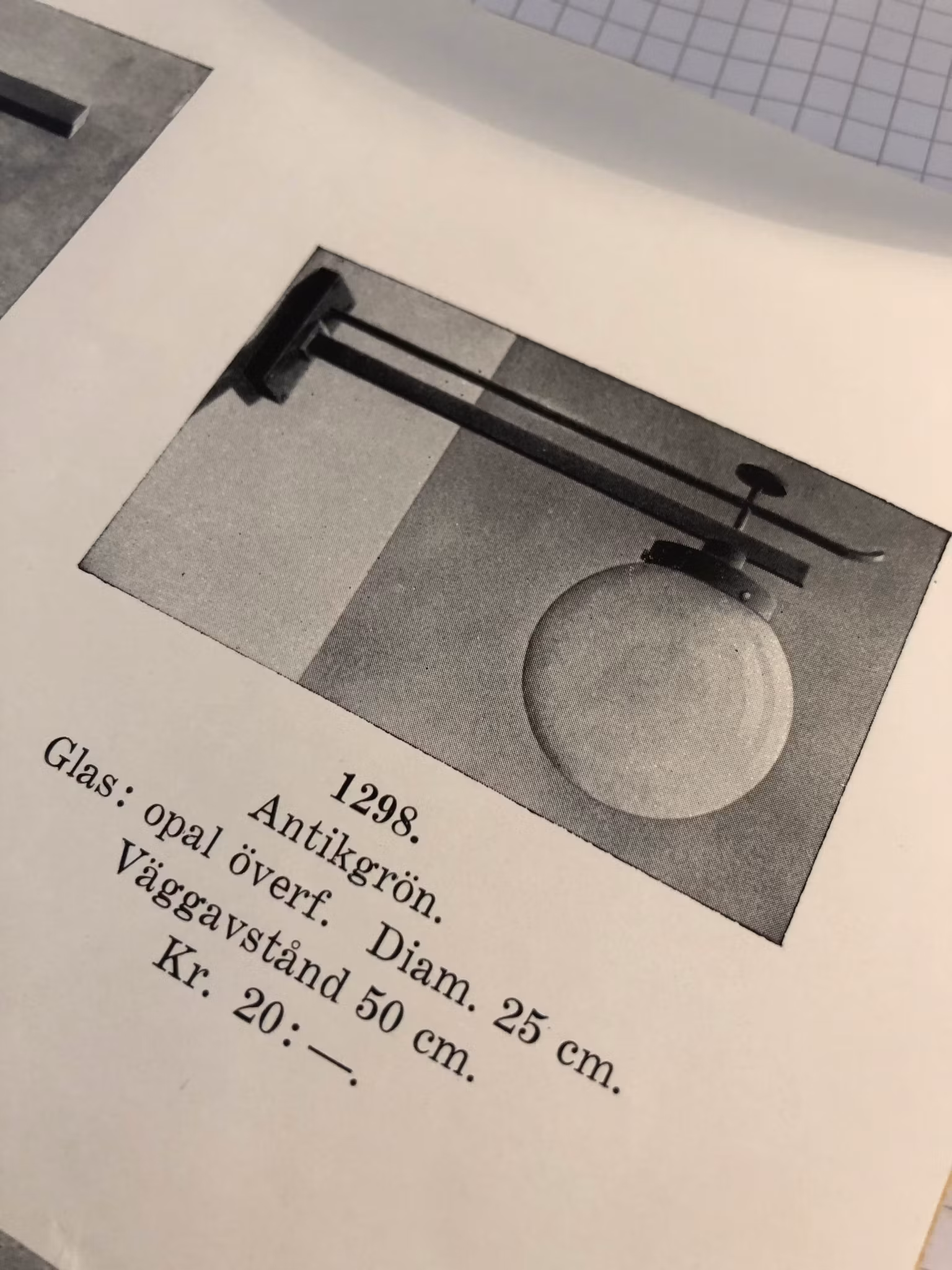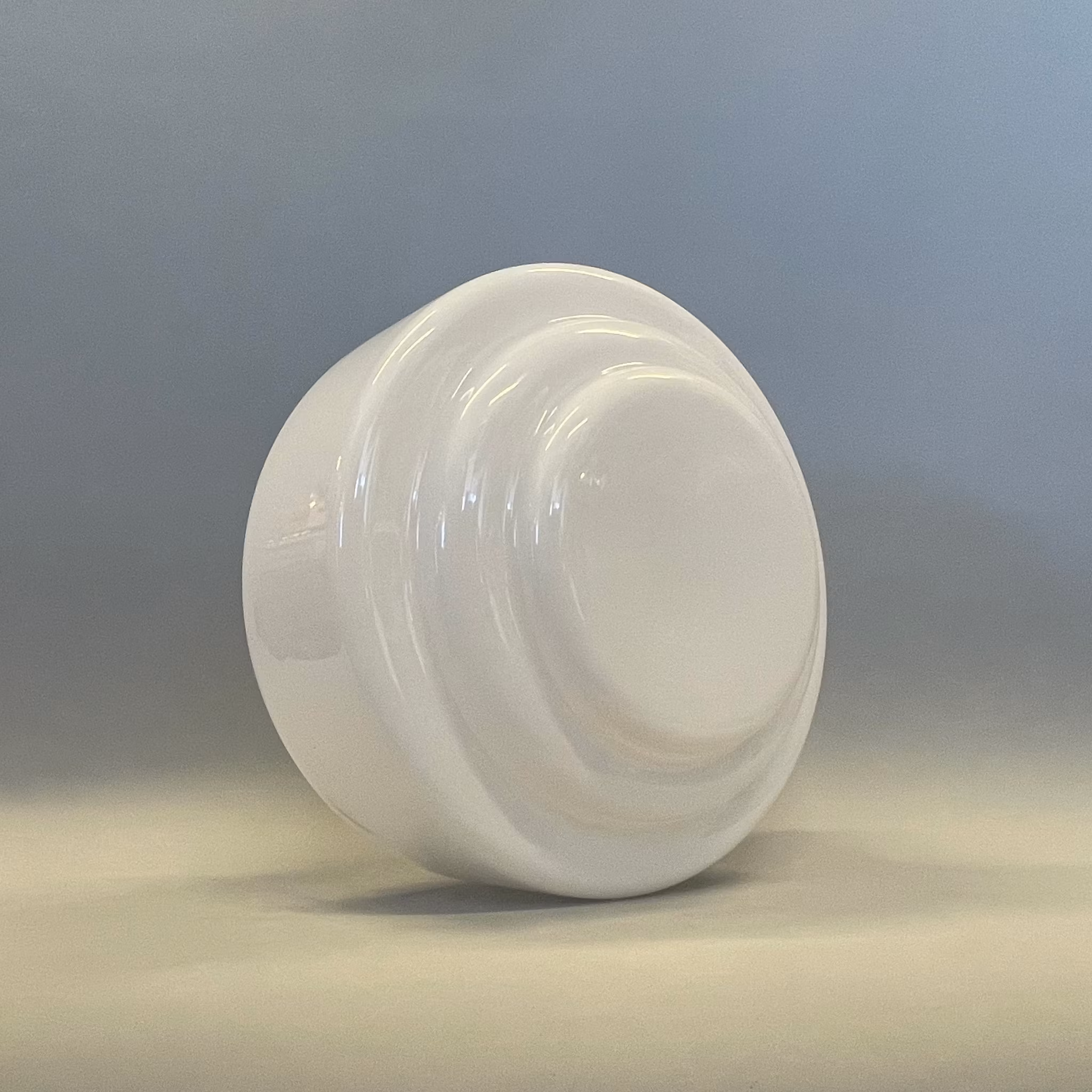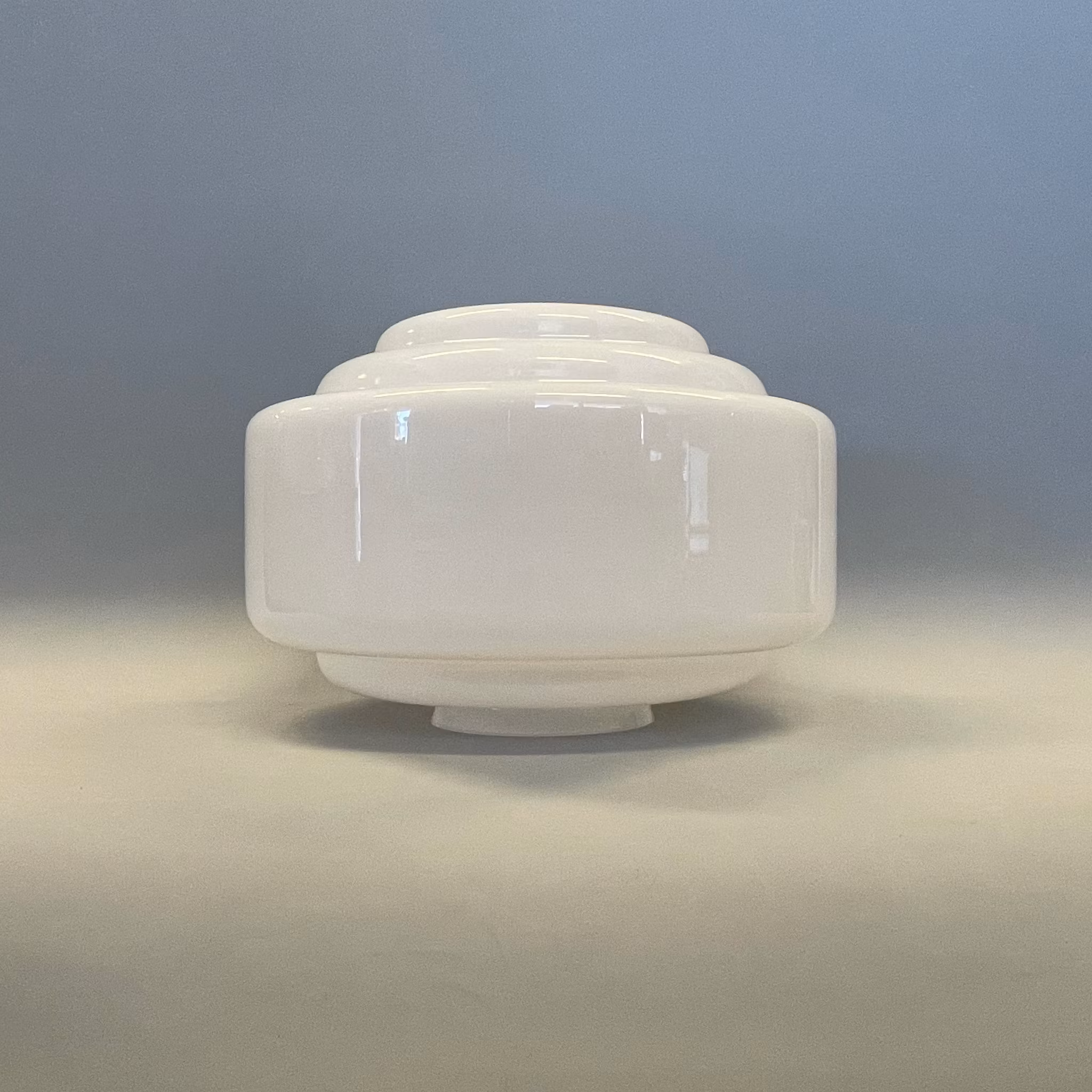 Denna opalvita lampkupa är cirka 25 cm i sin största diameter och 17 cm hög samt anpassad för fästen på 100 mm, ett fäste med tre skruvar. Själva skärmen är alltså cirka 98 mm i kragens yttre diameter.