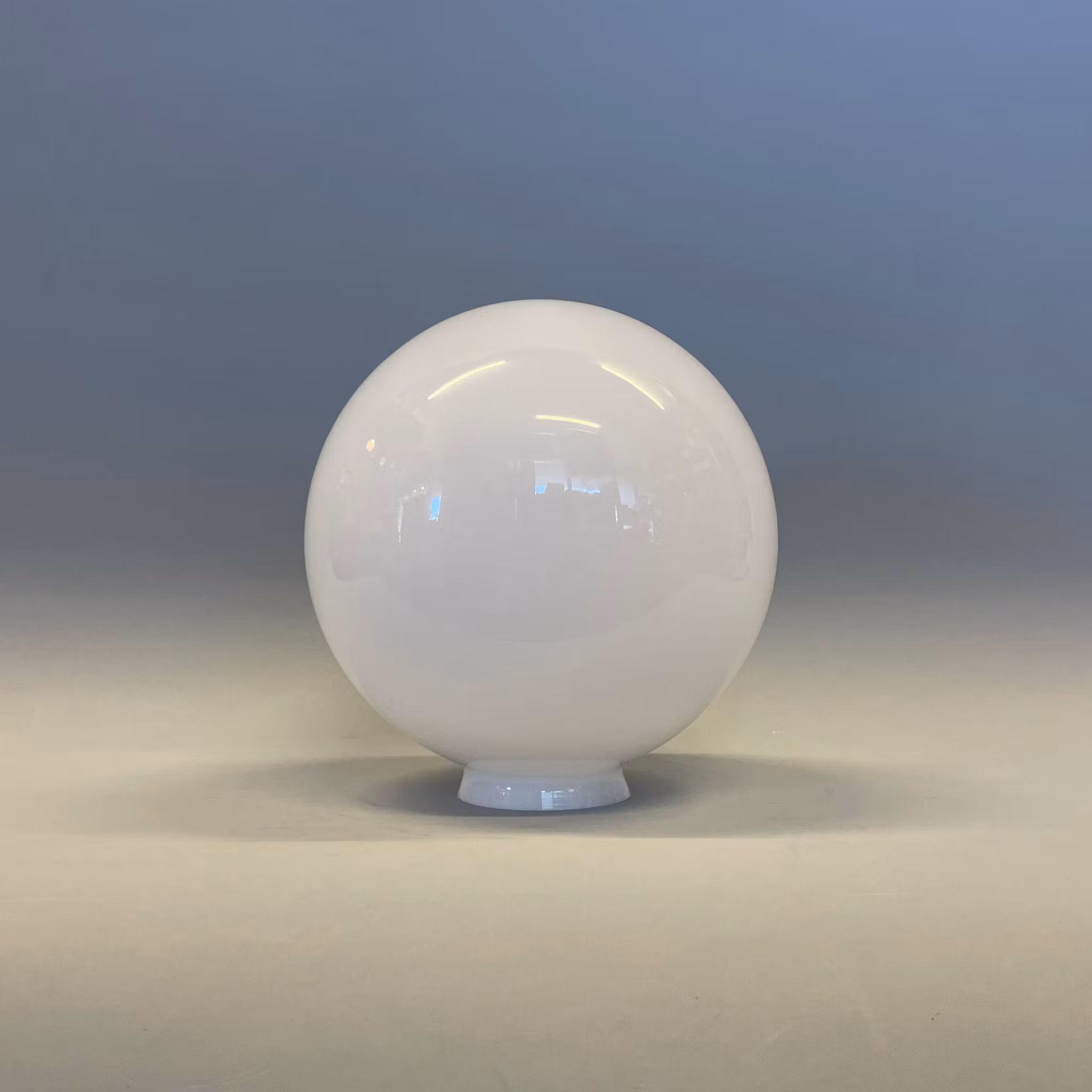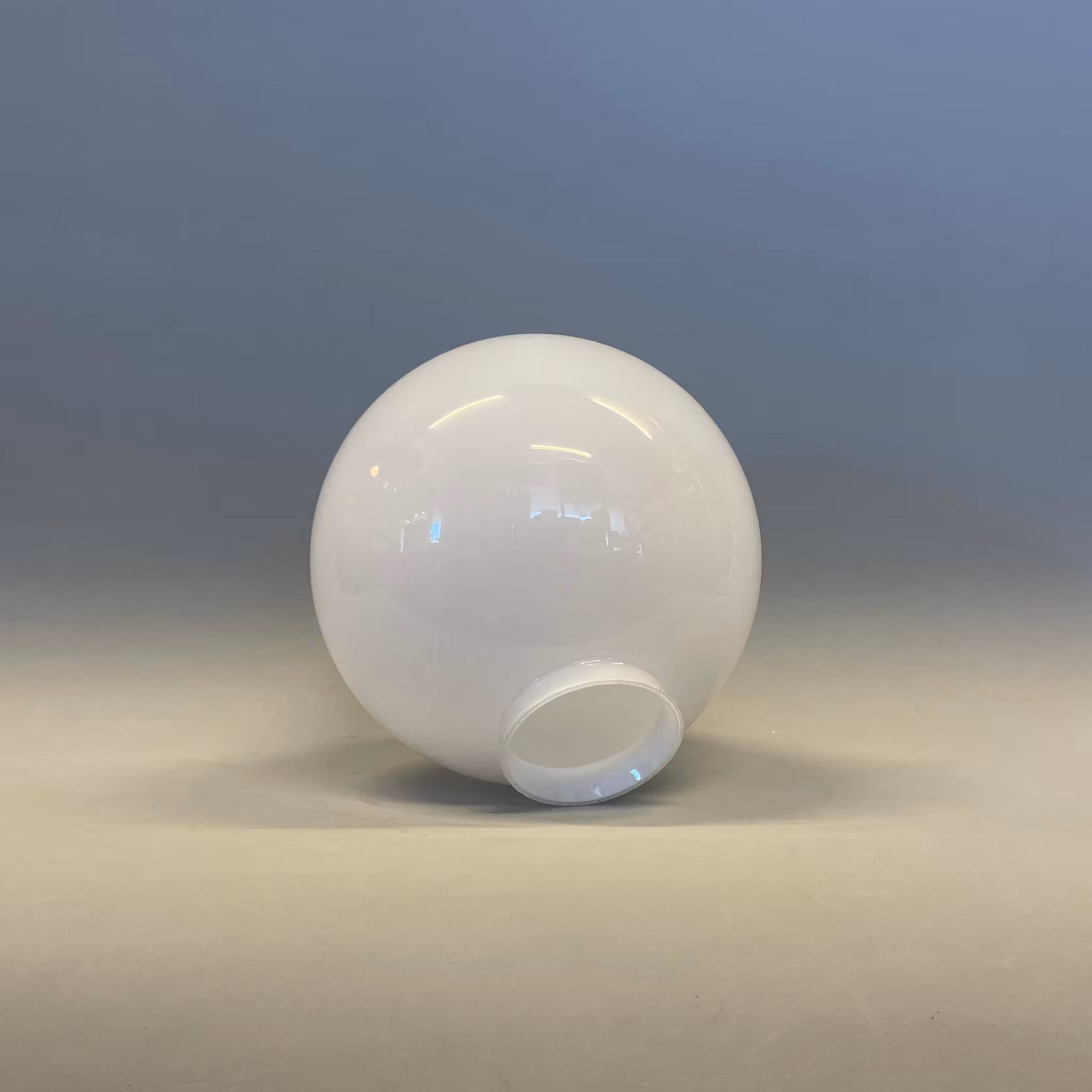 Denna opalvita klotkupa är cirka 15 cm i sin största diameter och anpassad för fästen på 60 mm, ett s.k. skomakarfäste med tre skruvar. Själva skärmen är alltså mellan 54-58 mm i kragens yttre diameter.