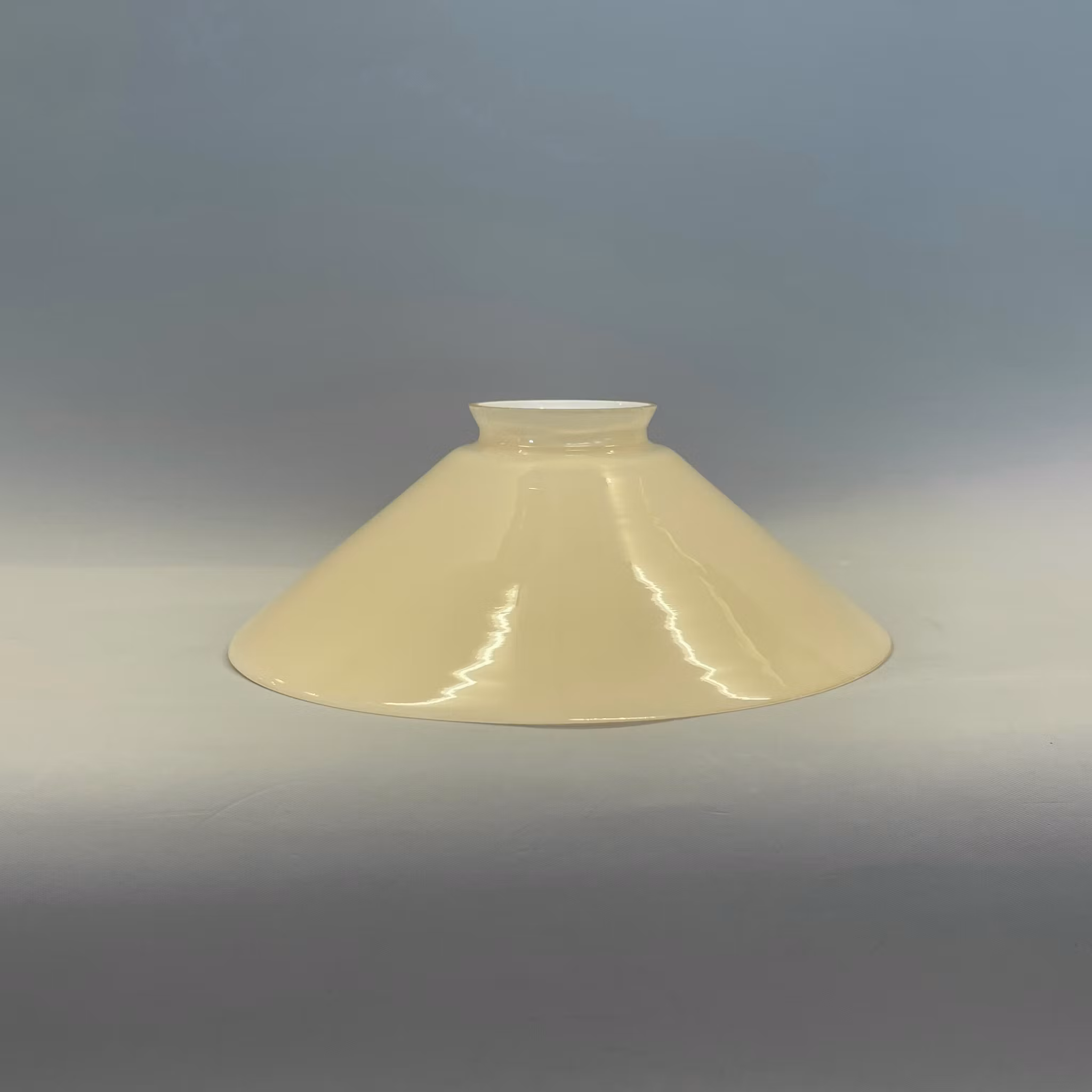 Denna vaniljgula skomakarskärm är cirka 20 cm i sin största diameter och anpassad för fästen på 60 mm, ett s.k. skomakarfäste med tre skruvar. Själva skärmen är alltså mellan 54-58 mm i kragens yttre diameter.