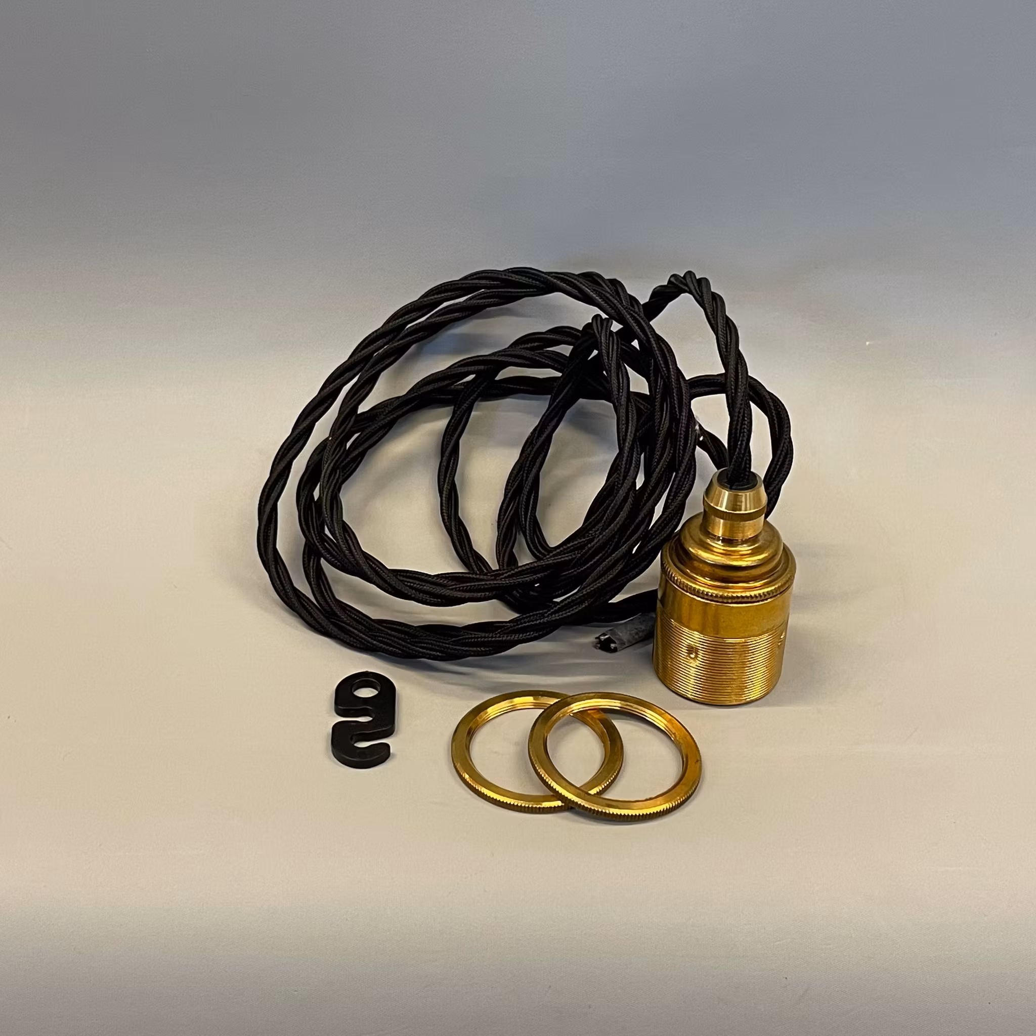 Här är ett riktigt snyggt tygsladdsupphäng i jordad tvinnad svart silkeskabel med ett dubbelt ringfäste på 38 mm i lamphållarens yttre diameter och två lösa ringar för att montera kupor vars ytterdiameter är 48 mm. Sladden är cirka 230 cm lång och har en klippt sladdände - för montering av valfri kontakt.