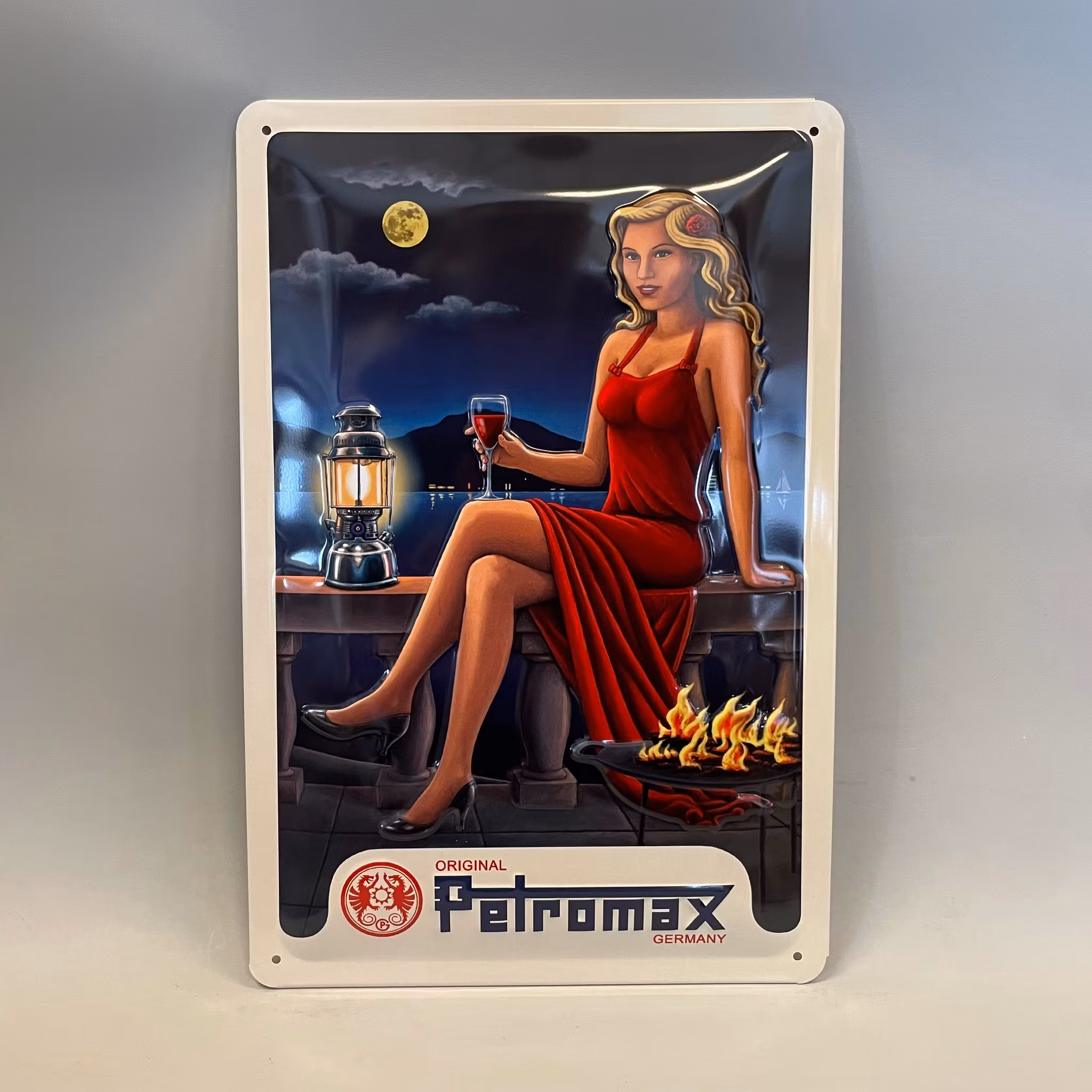 En superfin nytillverkad skylt i plåt med gammalt reklammotiv från tyska stormlyktetillverkaren Petromax. Små hål i varje hörn.