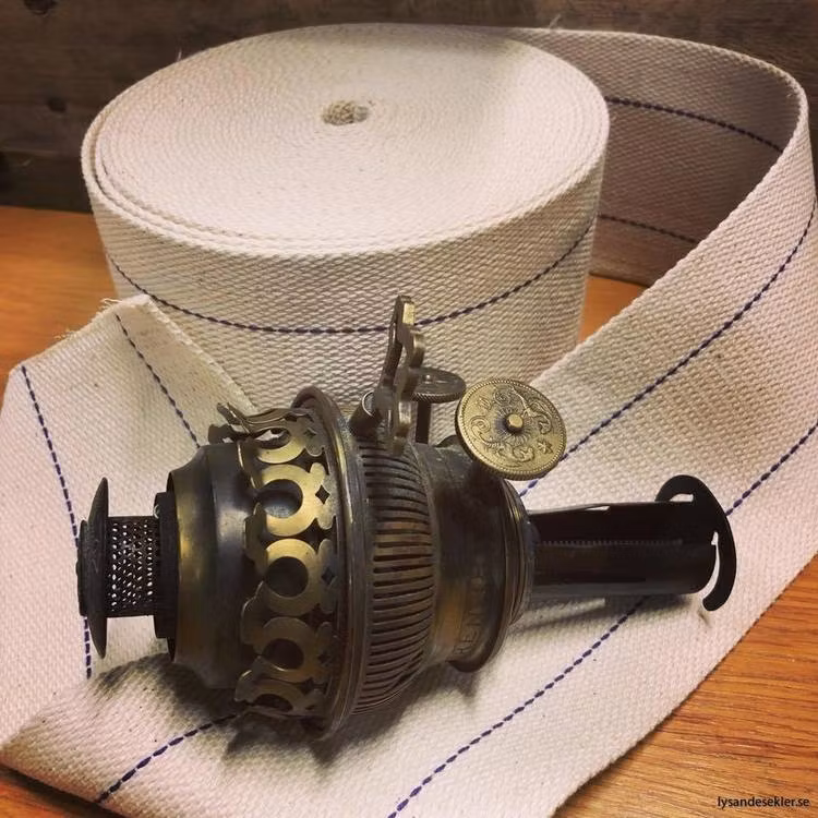 Vi har 100 mm breda vekar som båda passar i en del rundbrännare av storlek 20 och 30 linjer. Ni kan själva välja längd på veken mellan 25 - 50 cm styck.